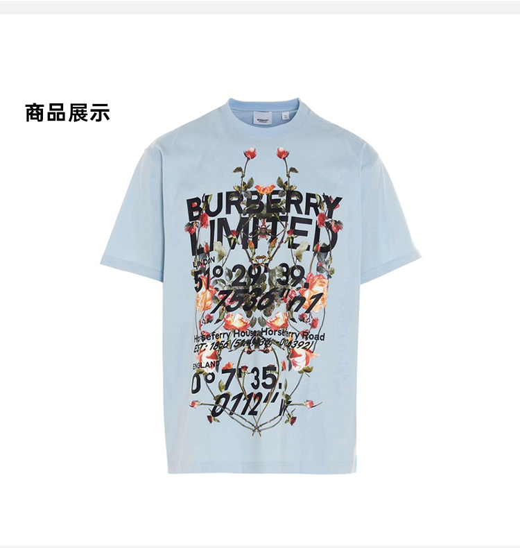 BURBERRY 巴宝莉 男士棉质徽标印花圆领短袖T恤 浅蓝色 8037468 A1397