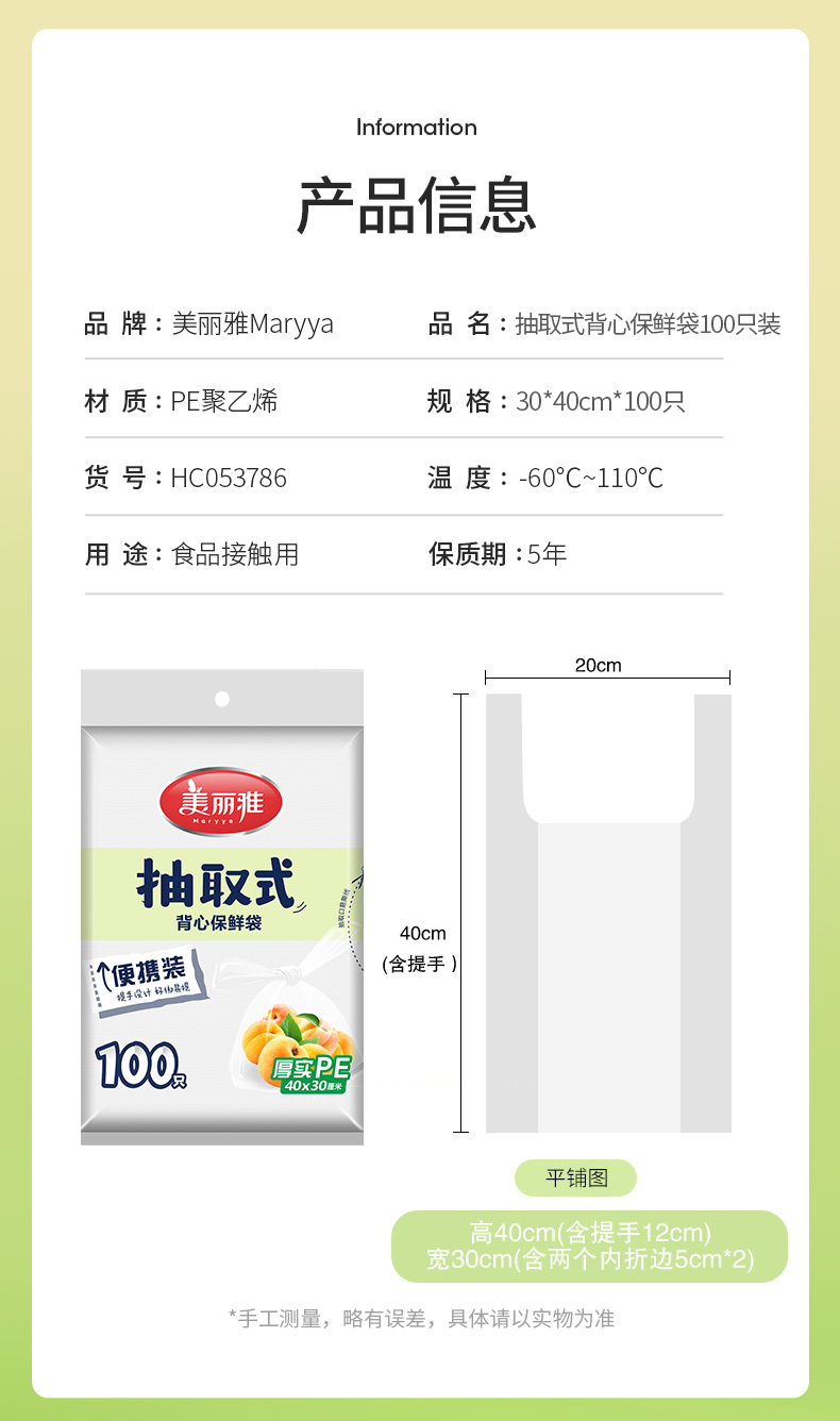 【批发】美丽雅背心式保鲜袋40*30/100个入