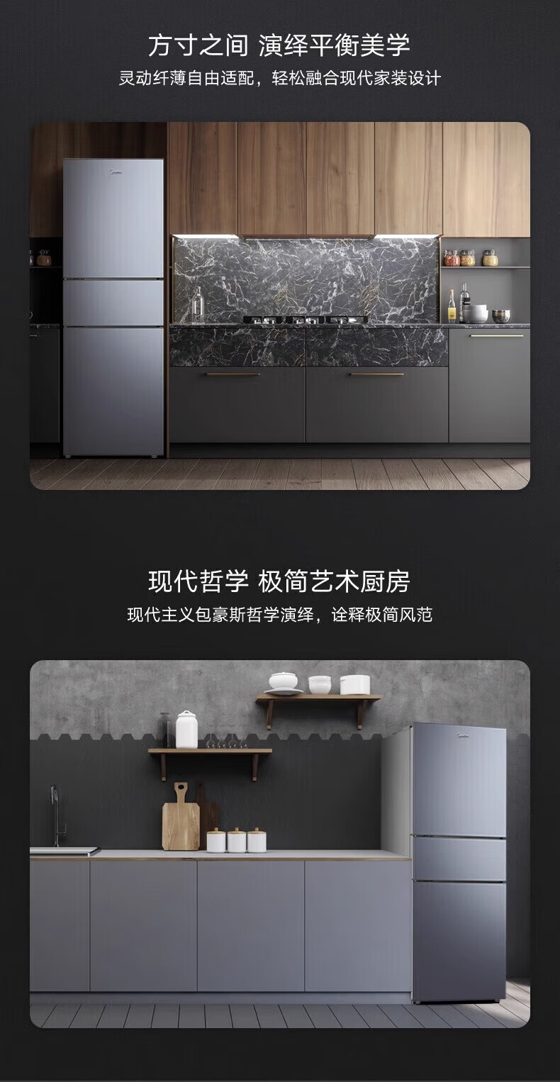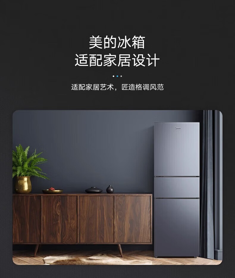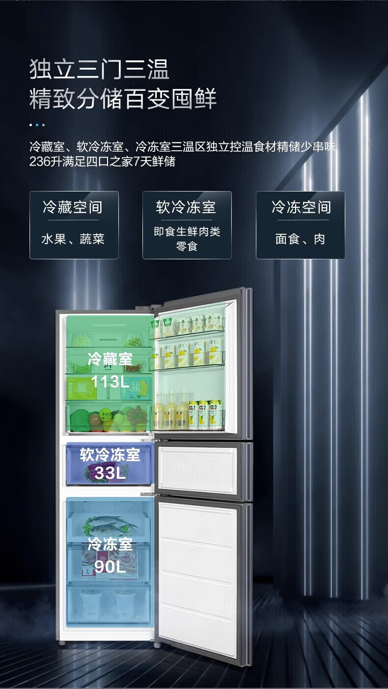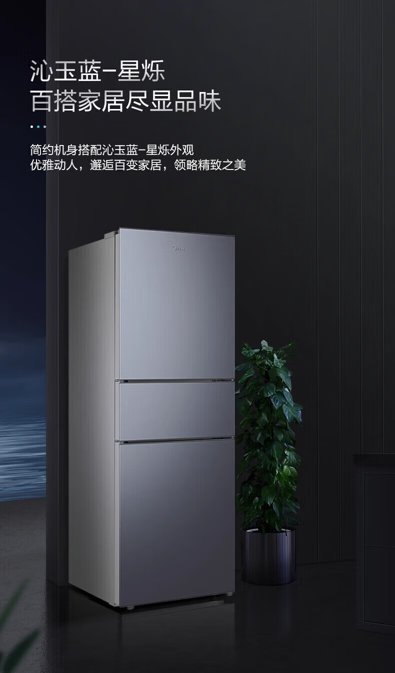 美的236升三门三温区家用冰箱风冷无霜电冰箱_节能低噪_风冷无霜_铂金净味_政府补贴_BCD-236WTM(E)_沁玉蓝-星烁_236升