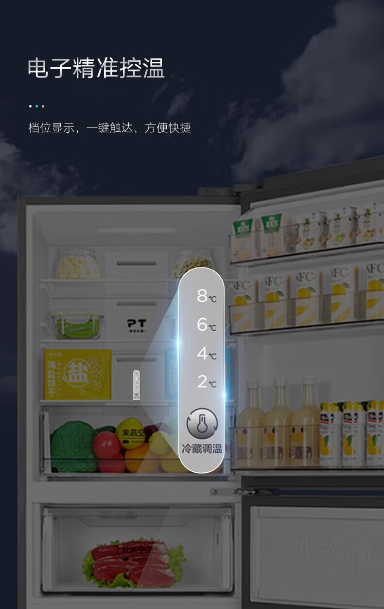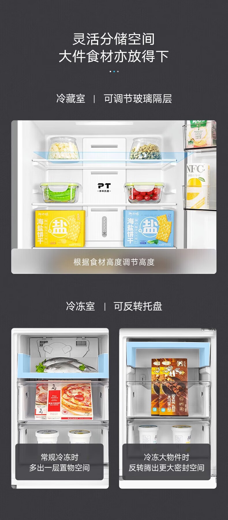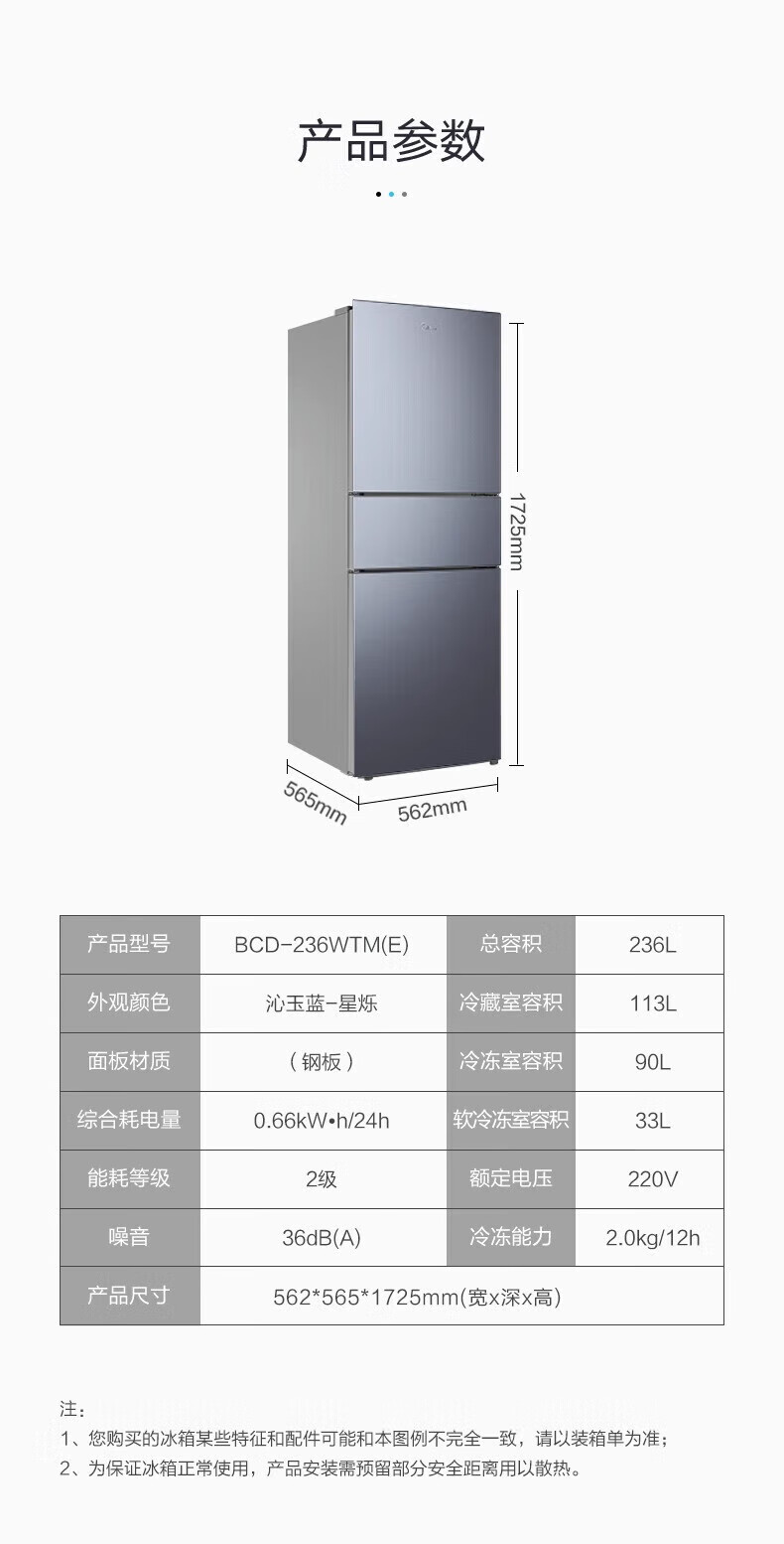美的236升三门三温区家用冰箱风冷无霜电冰箱_节能低噪_风冷无霜_铂金净味_政府补贴_BCD-236WTM(E)_沁玉蓝-星烁_236升