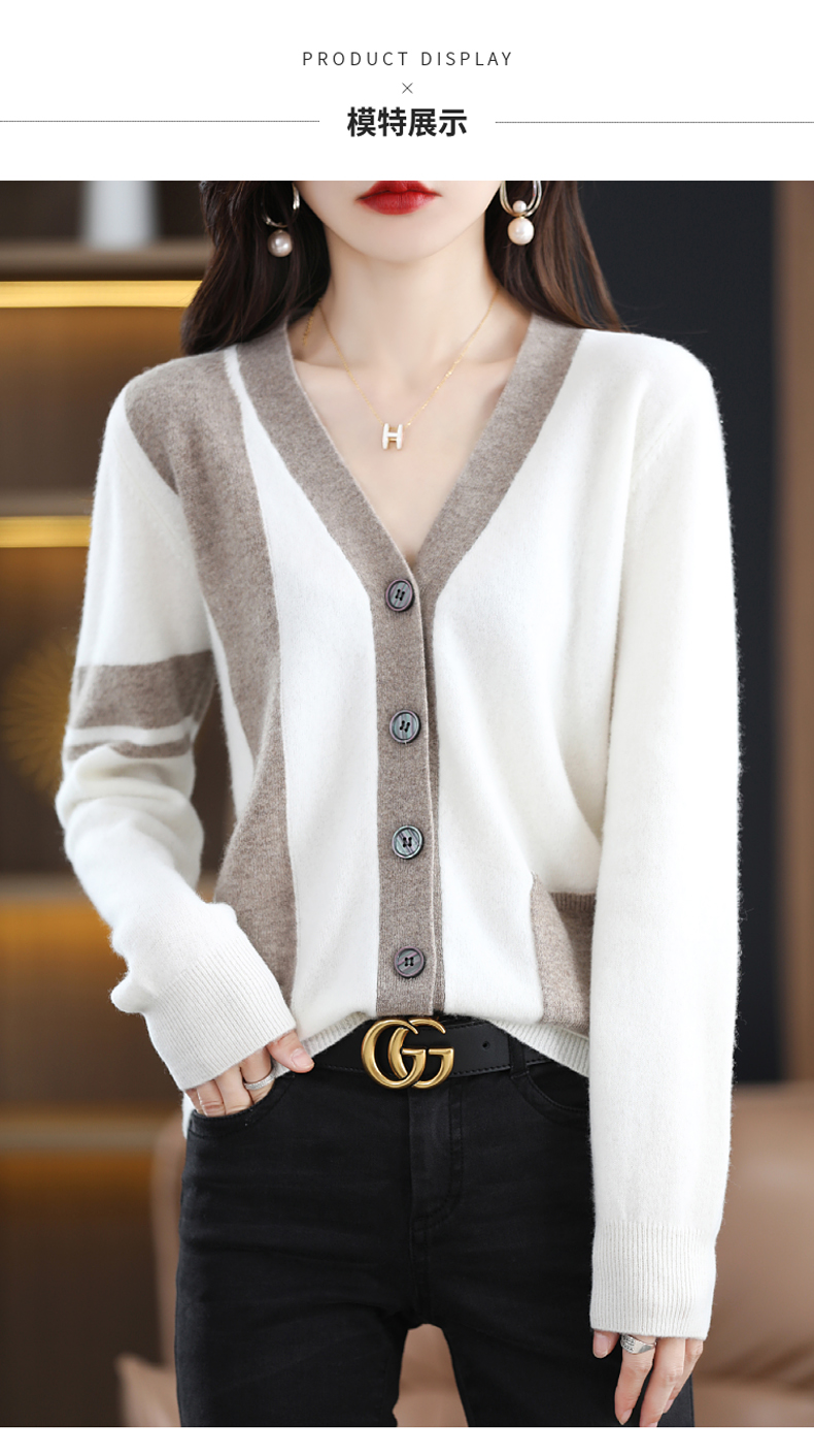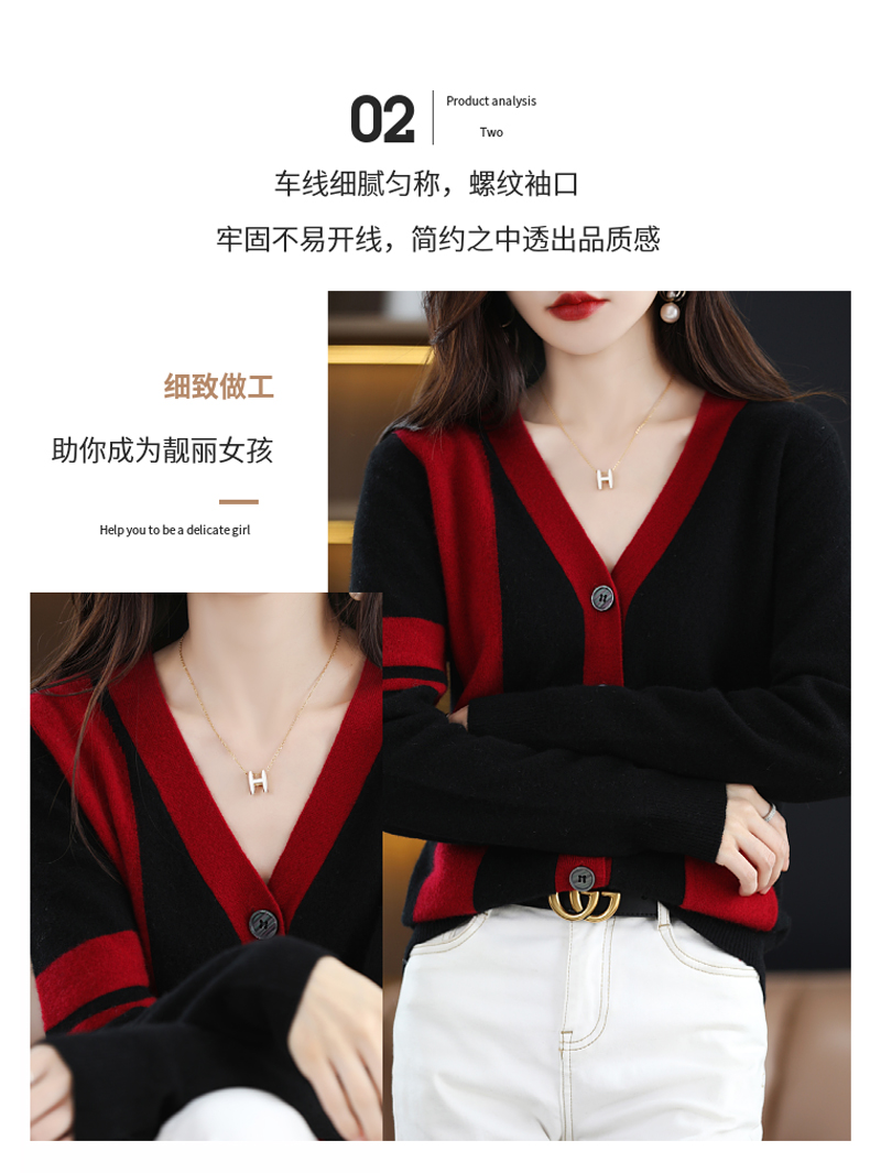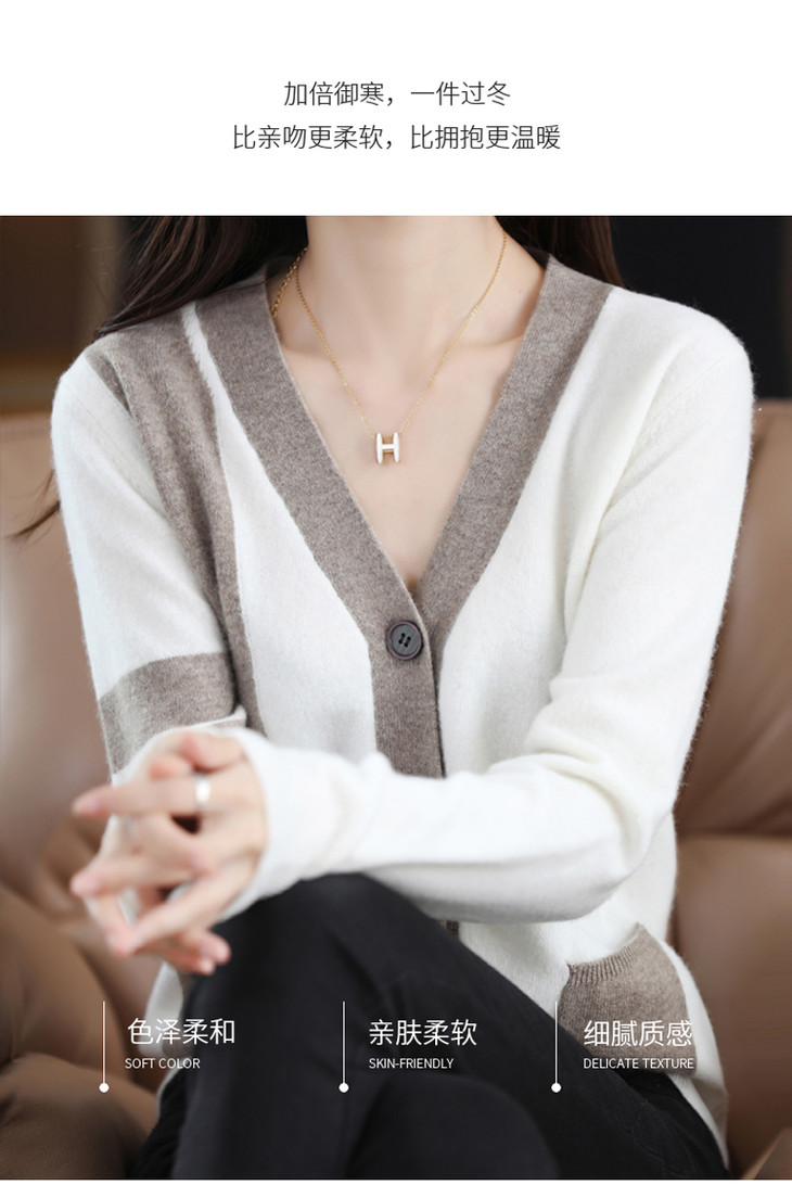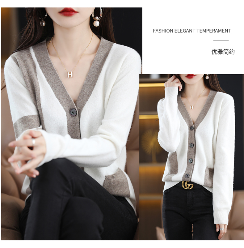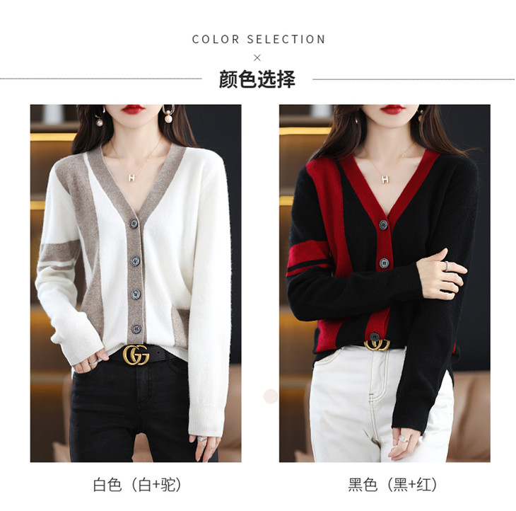 秋冬新款开衫V领撞色外穿毛衣宽松百搭针织外套HT-YX3351-3