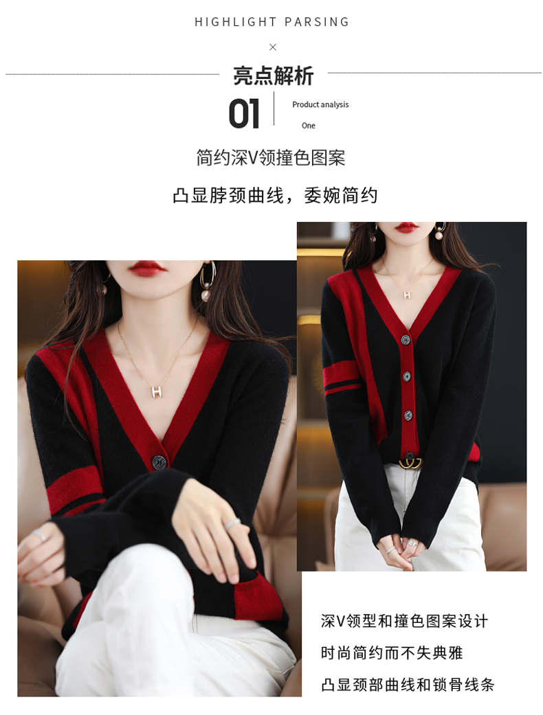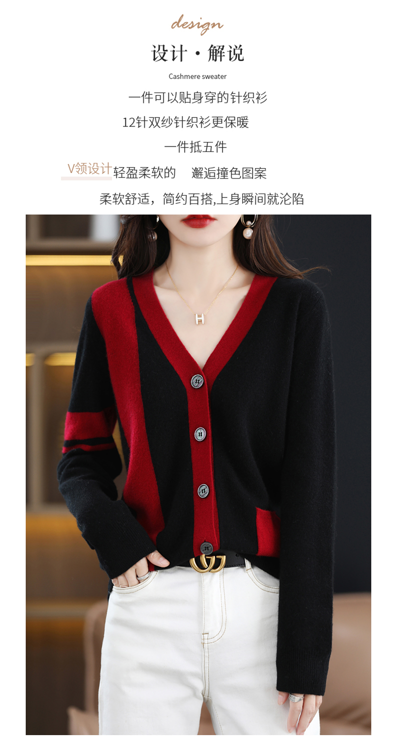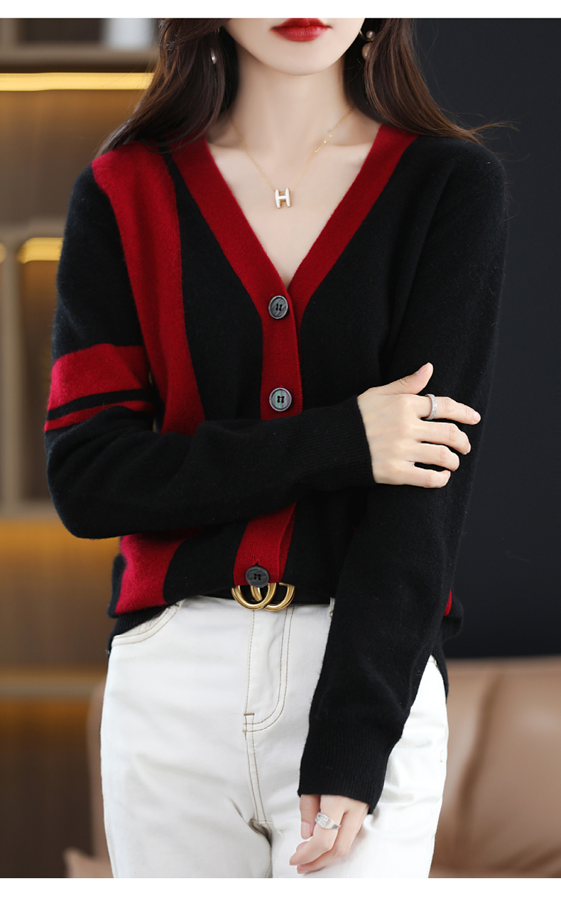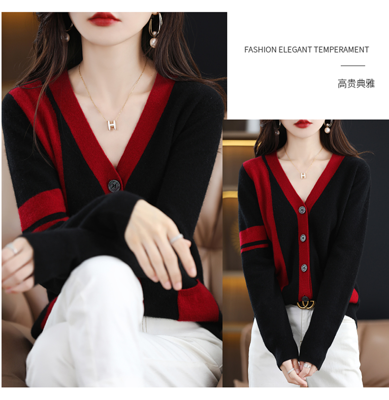 秋冬新款开衫V领撞色外穿毛衣宽松百搭针织外套HT-YX3351-3