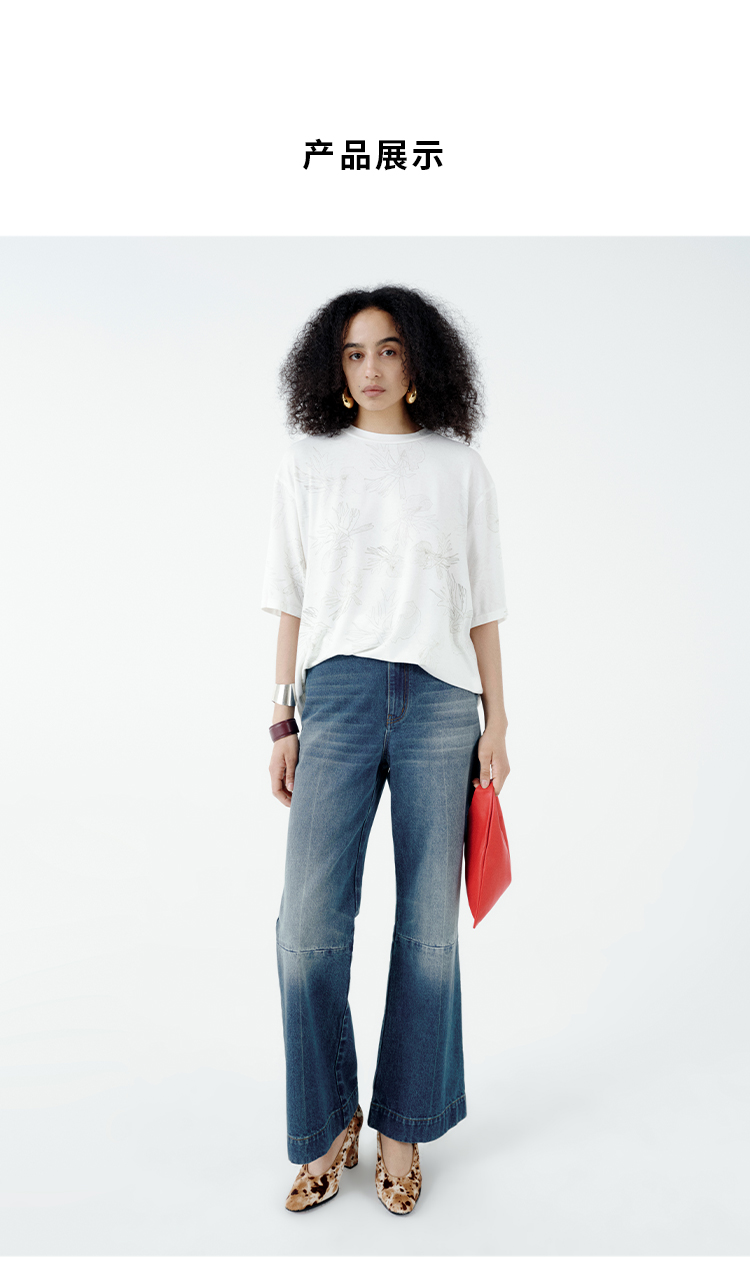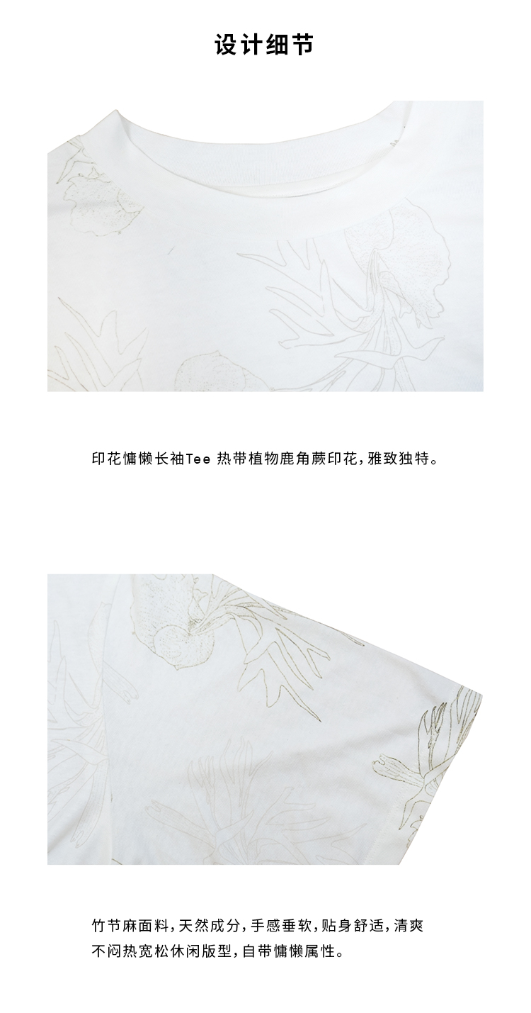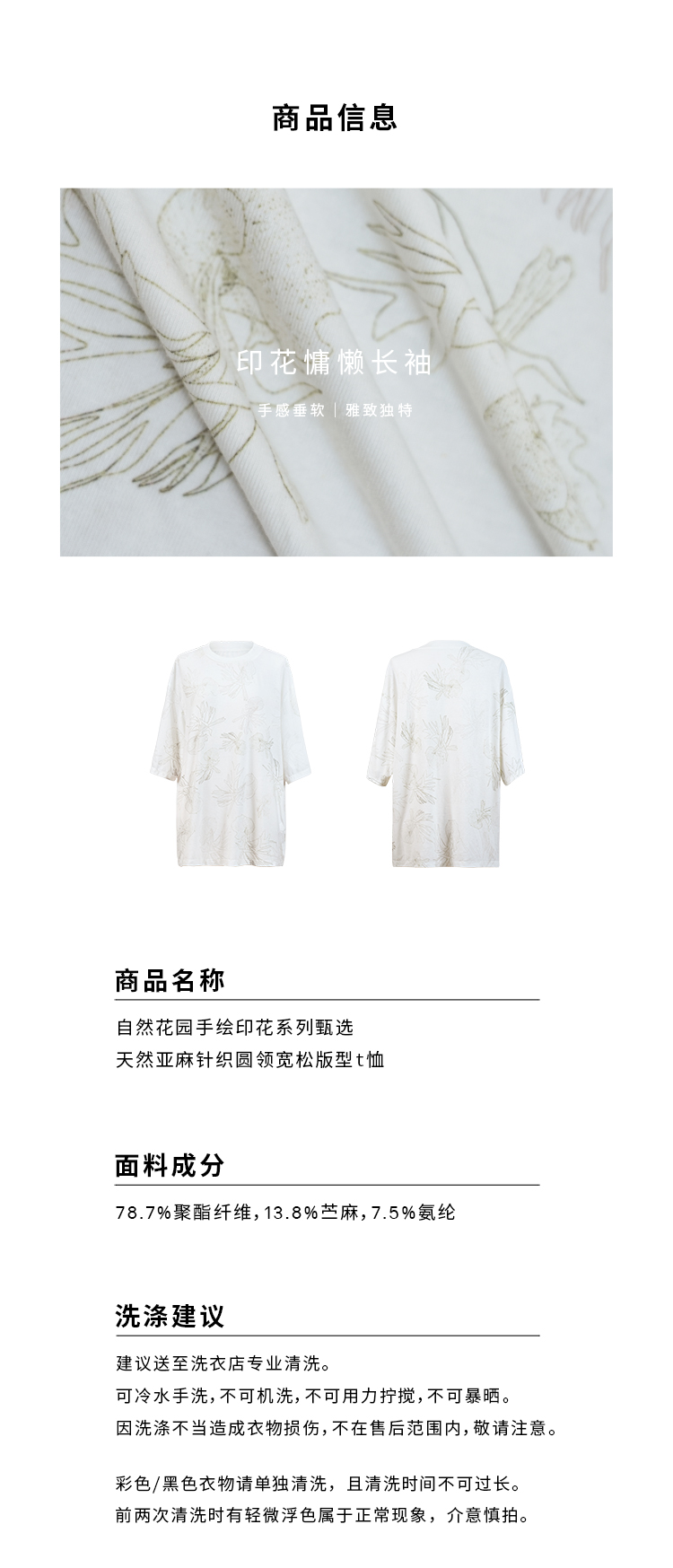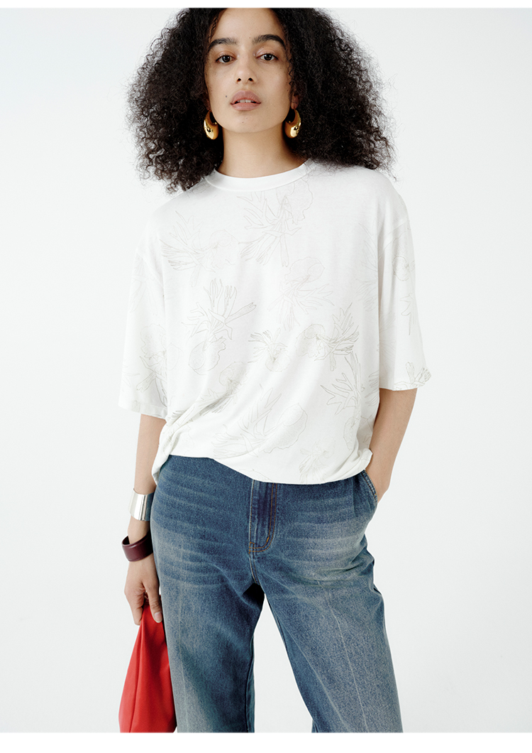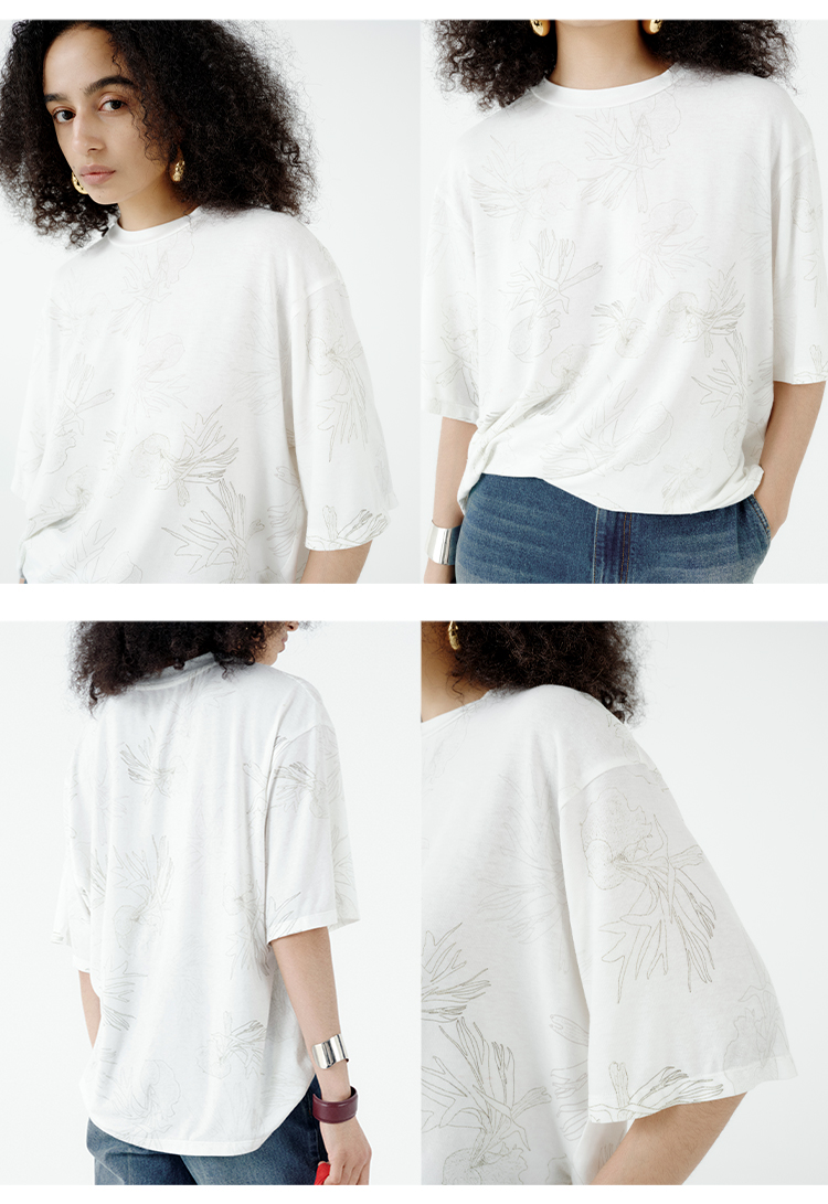 HIDEMI 自然花园手绘印花系列甄选天然亚麻针织圆领宽松版型t恤