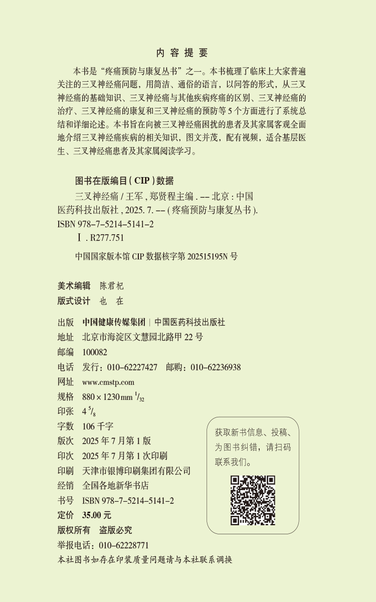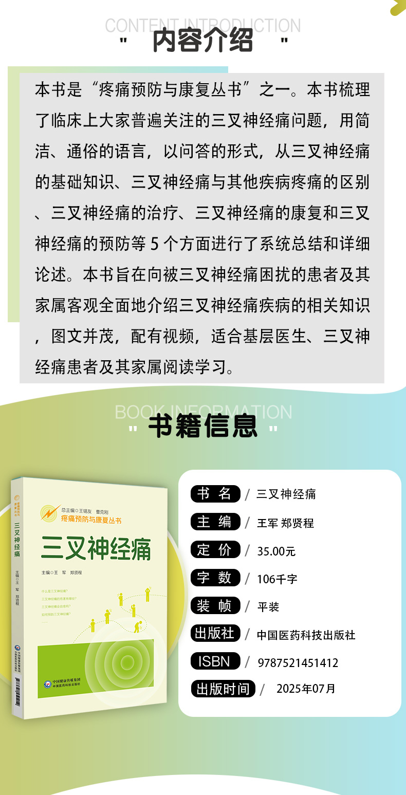 三叉神经痛(疼痛预防与康复丛书)王军 郑贤程 主编 全面地介绍三叉神经痛疾病的相关知识 配有视频 中国医药科技出版社