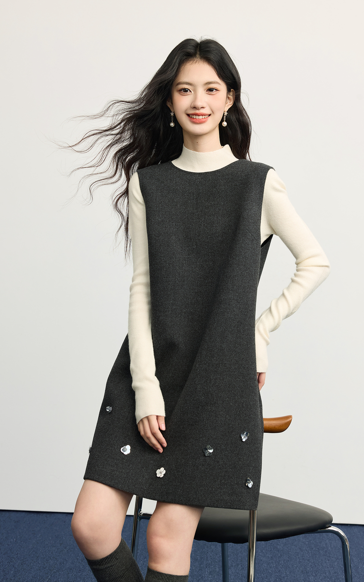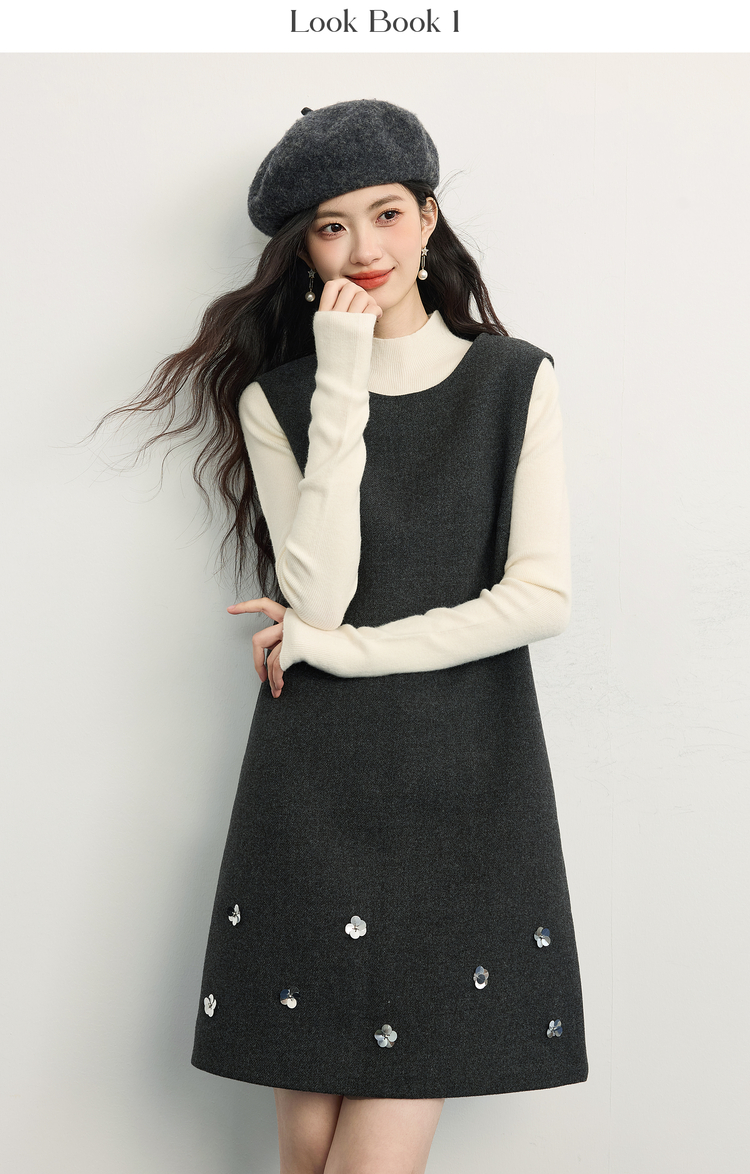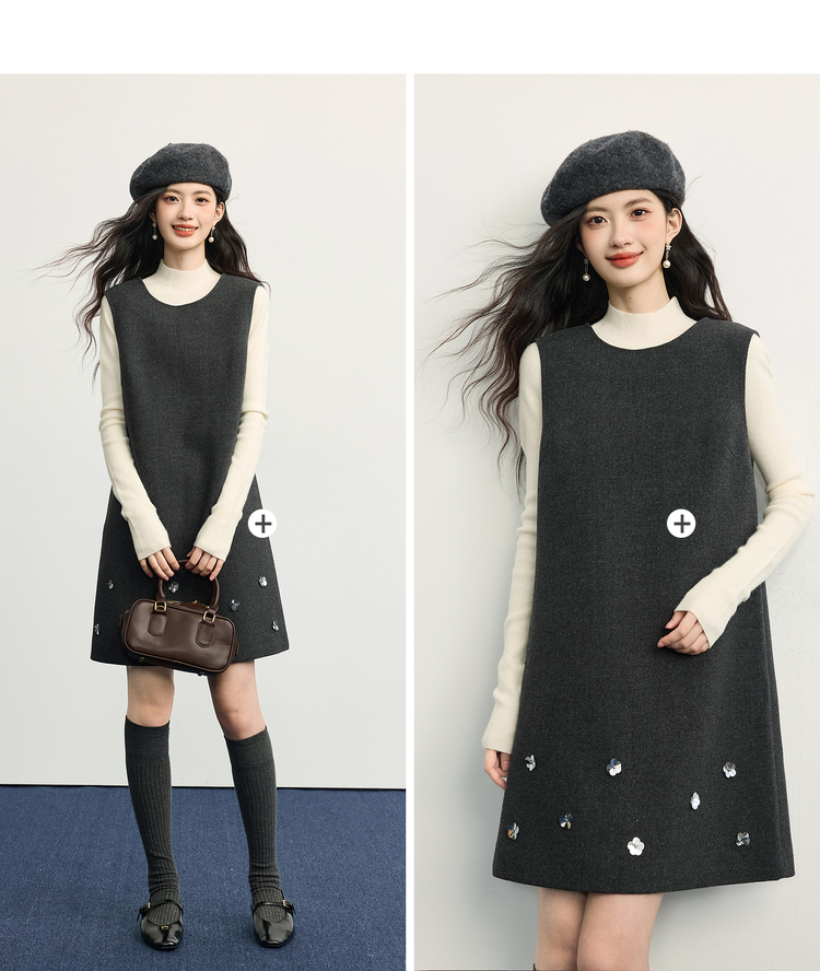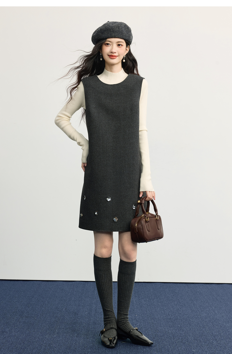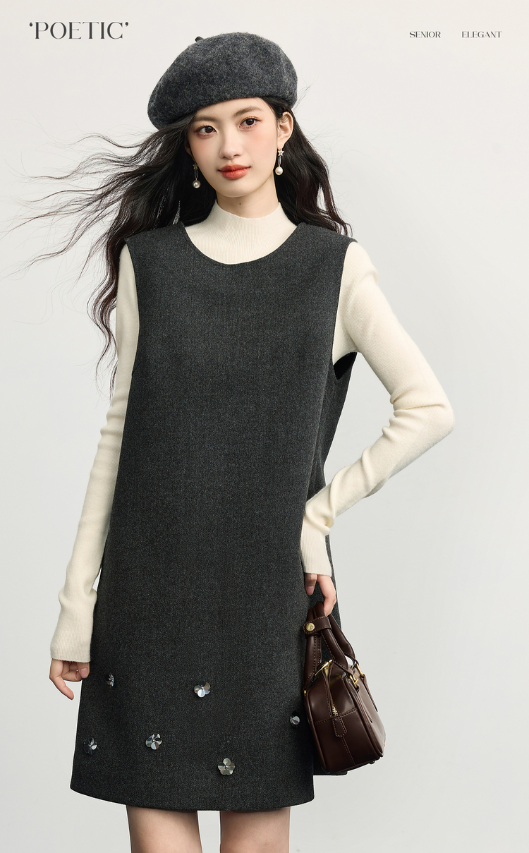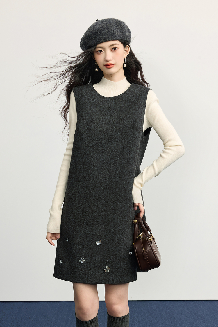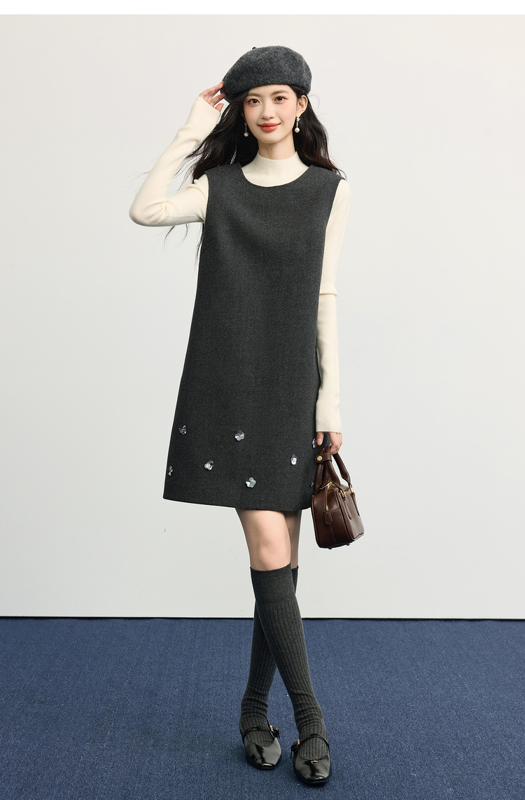 【11/14新品】熙世界小香风灰色毛呢背心裙女2025秋冬新款立体花无袖直筒连衣裙