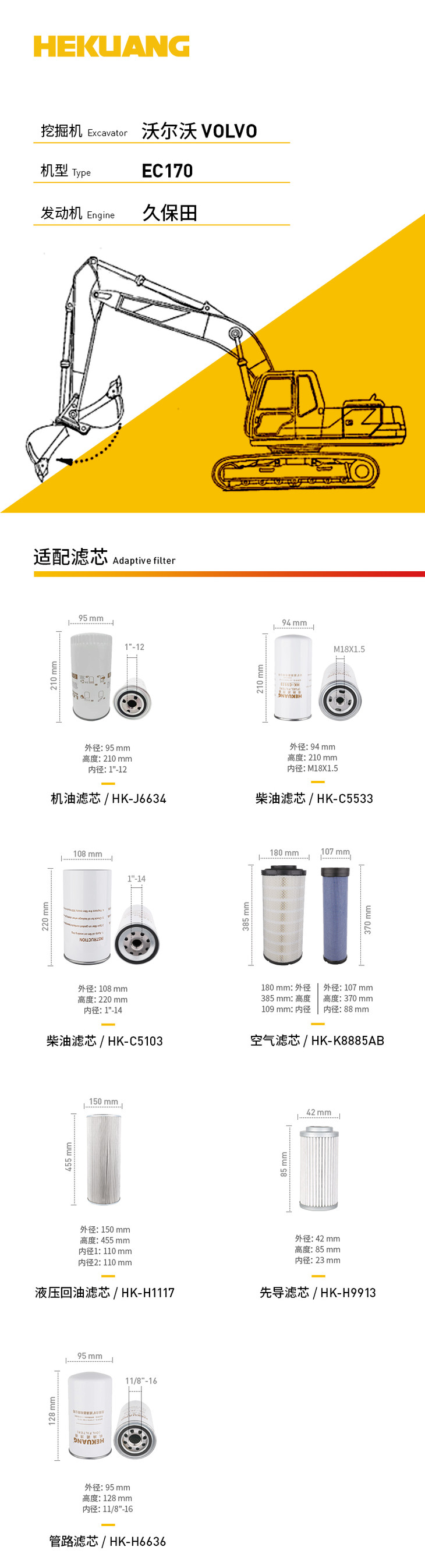 沃尔沃EC170(久保田)挖掘机滤芯 机油柴油空气滤芯 液压油先导滤芯