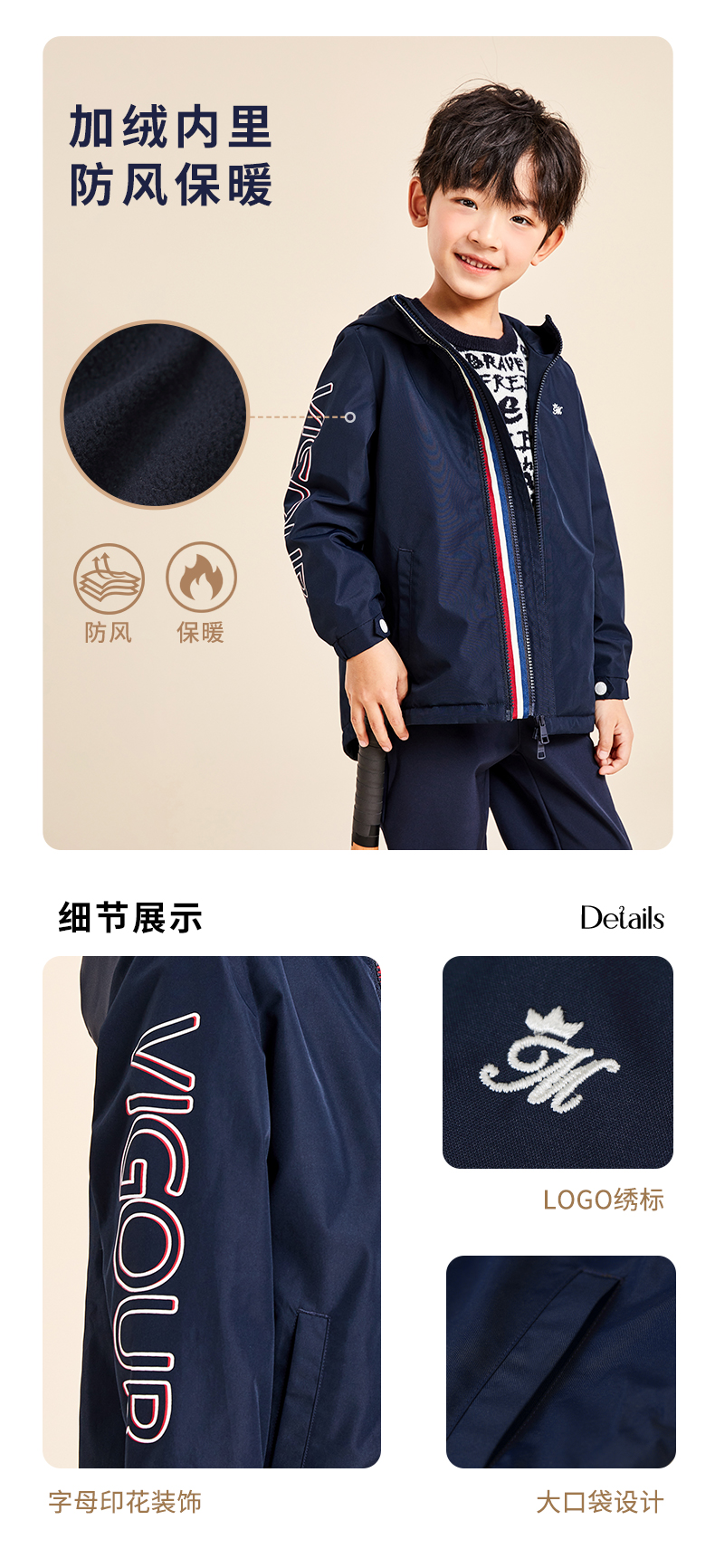 【男童加绒连帽防风外套】22年秋冬新品男童连帽防风挡雨外套加绒保暖上衣