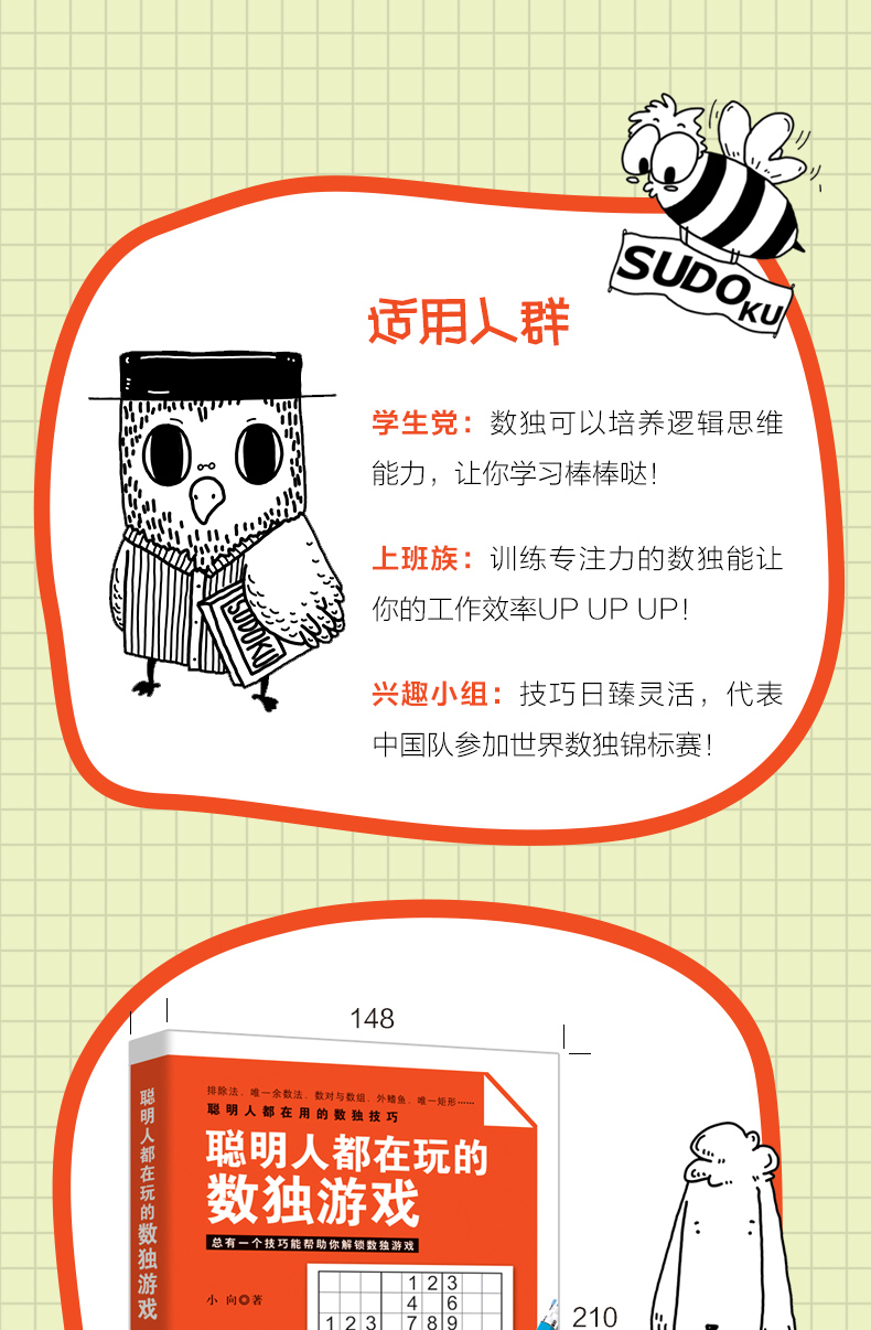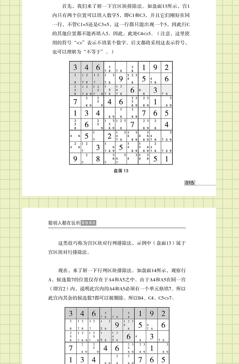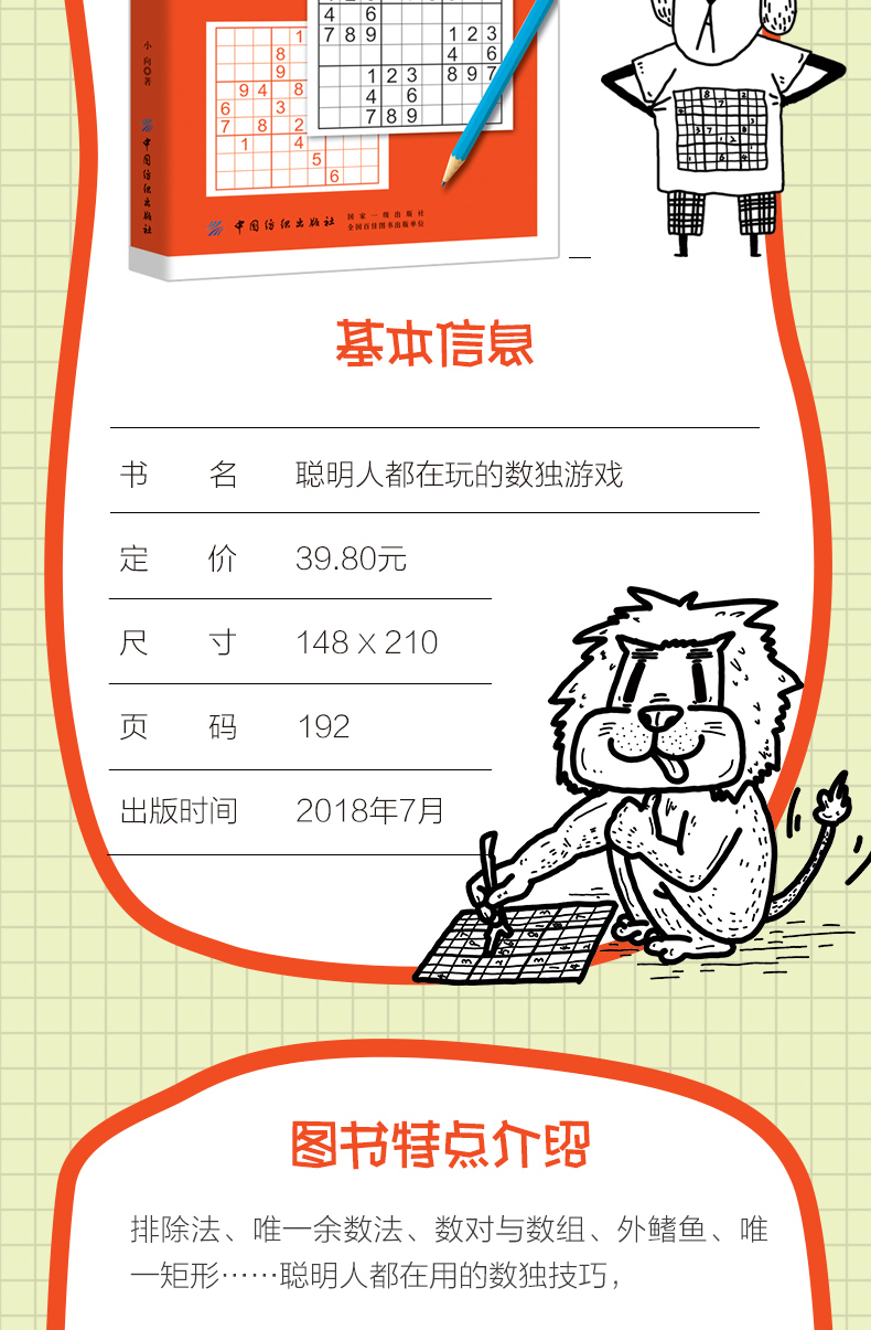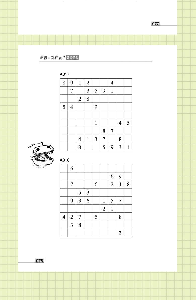 《聪明人都在玩的数独游戏》数独是一种运用纸、笔进行演算的逻辑游戏,你只需要根据9×9盘面上的已知数字,推理出所有剩余空格的数字,并满足每一行、每一列、每一个粗线宫(3×3)内的数字均含1~9,不重复即可。刚刚接触数独的读者通常靠猜数来完成盘面,可是如果掌握各种技巧的话,就会又快又准确地完成盘面。本书结合图例详细介绍了数独的各种实用高效技巧,并且提供了不同难度的数独题目,让你从入门到精通,轻松玩转数独游戏,享受你的闲暇时光和碎片时间。