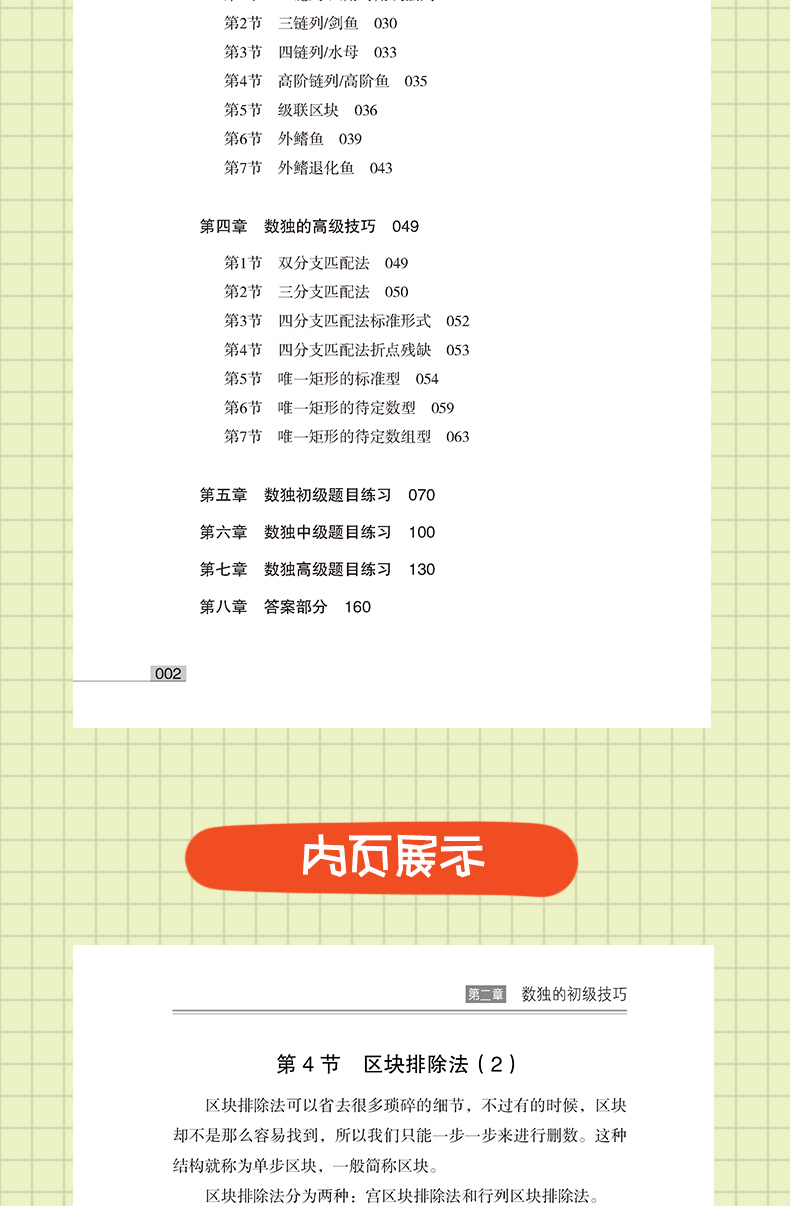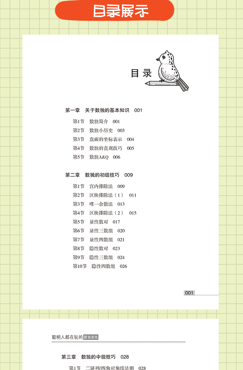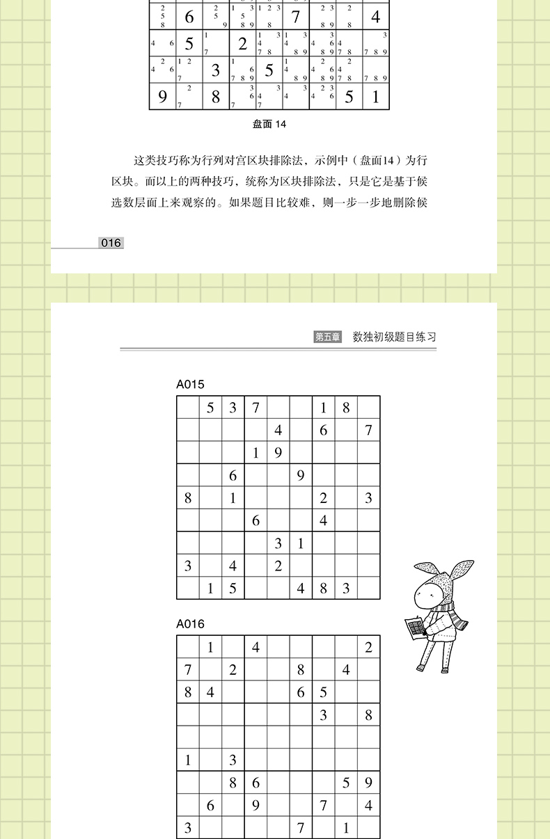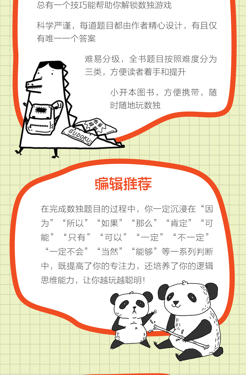 《聪明人都在玩的数独游戏》数独是一种运用纸、笔进行演算的逻辑游戏,你只需要根据9×9盘面上的已知数字,推理出所有剩余空格的数字,并满足每一行、每一列、每一个粗线宫(3×3)内的数字均含1~9,不重复即可。刚刚接触数独的读者通常靠猜数来完成盘面,可是如果掌握各种技巧的话,就会又快又准确地完成盘面。本书结合图例详细介绍了数独的各种实用高效技巧,并且提供了不同难度的数独题目,让你从入门到精通,轻松玩转数独游戏,享受你的闲暇时光和碎片时间。