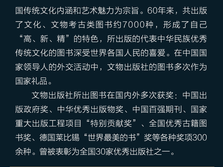 文物出版社创建于1957年,直属于国家文物局,是中国唯一一家文物考古类图书和音像制品的专业出版社,以抢救、保护中国文化遗产为己任,以展示中国传统文化内涵和艺术魅力为宗旨。60年来,共出版了文化、文物考古类图书约7000种,形成了自己“高、新、精”的特色,所出版的代表中华民族优秀传统文化的图书深受世界各国人民的喜爱。在中国国家领导人的外交活动中,文物出版社的图书多次作为国家礼品。