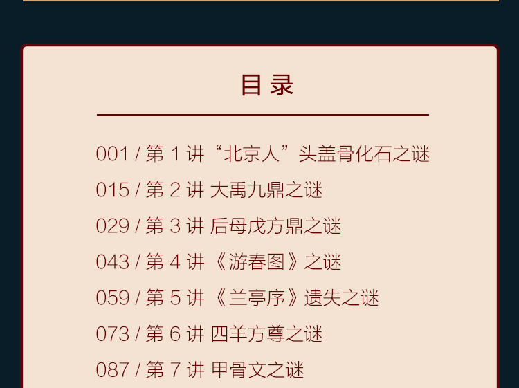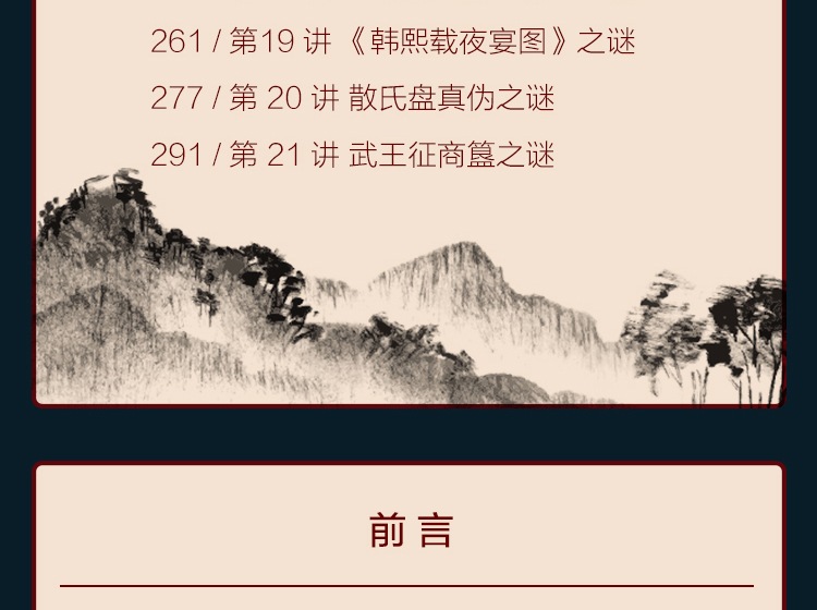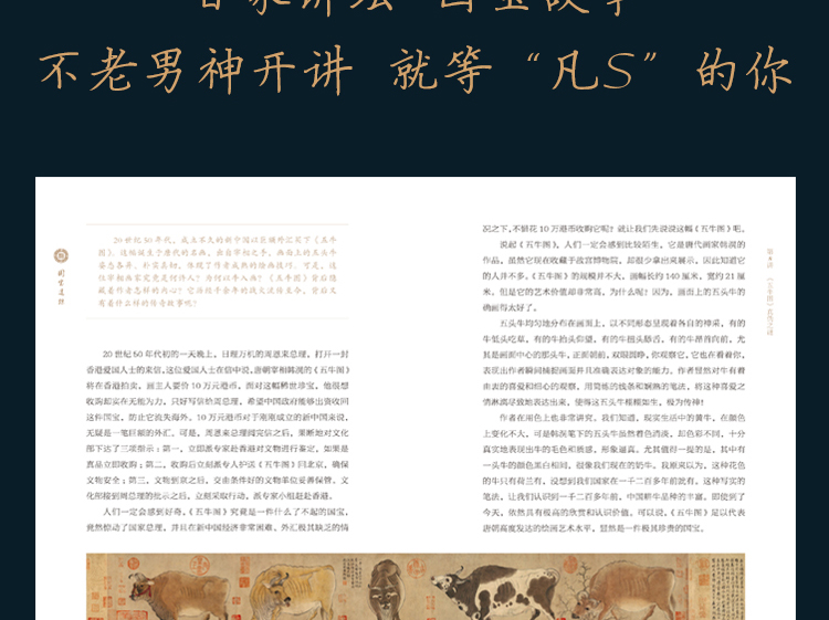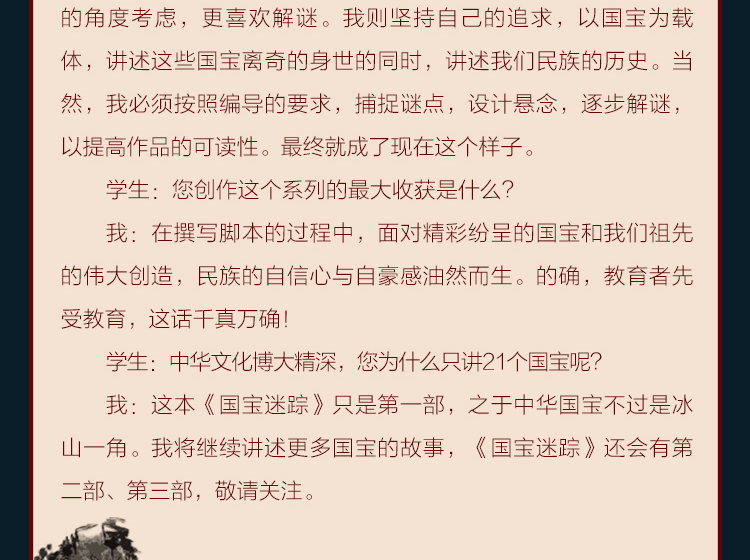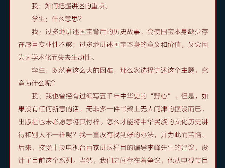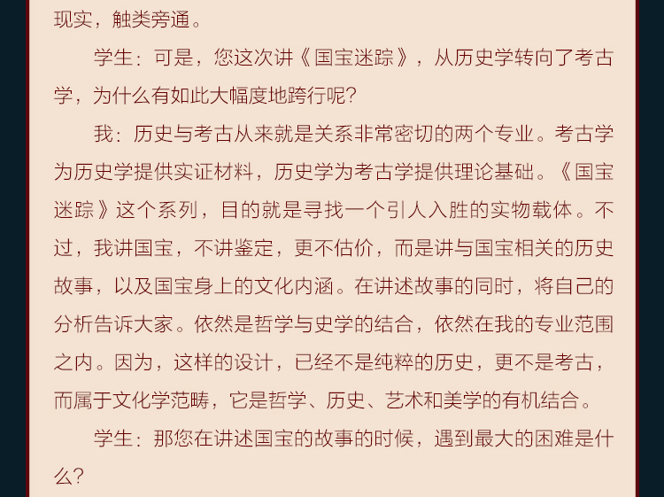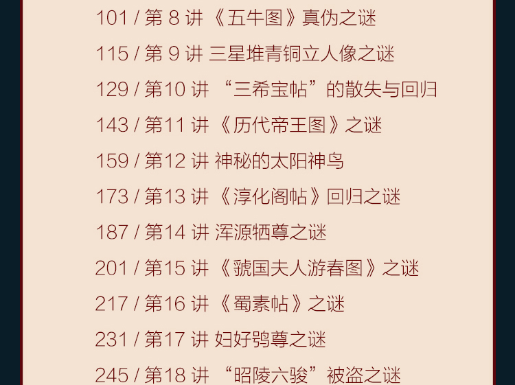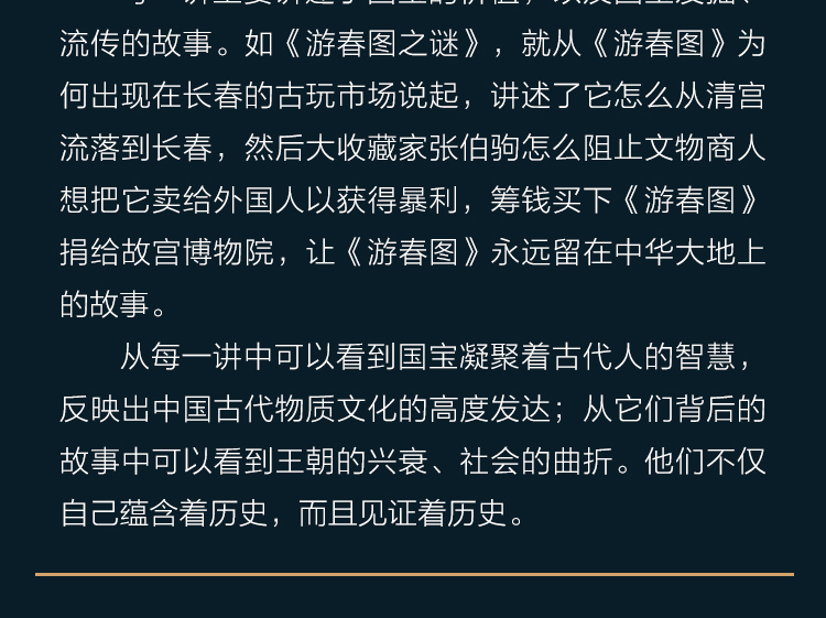 每一讲主要讲述了国宝的价值,以及国宝发掘、流传的故事。如《游春图之谜》,就从《游春图》为何出现在长春的古玩市场说起,讲述了它怎么从清宫流落到长春,然后大收藏家张伯驹怎么阻止文物商人想把它卖给外国人以获得暴利,筹钱买下《游春图》捐给故宫博物院,让《游春图》永远留在中华大地上的故事。