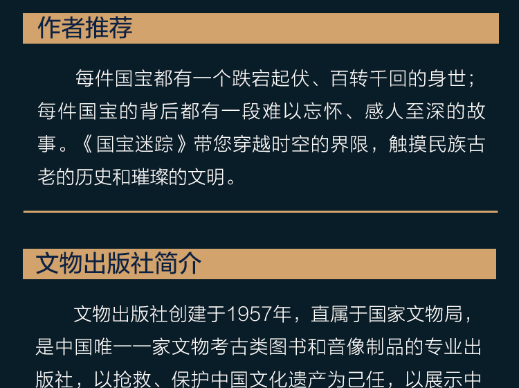 每件国宝都有一个跌宕起伏、百转千回的身世;每件国宝的背后都有一段难以忘怀、感人至深的故事。《国宝迷踪》带您穿越时空的界限,触摸民族古老的历史和璀璨的文明。