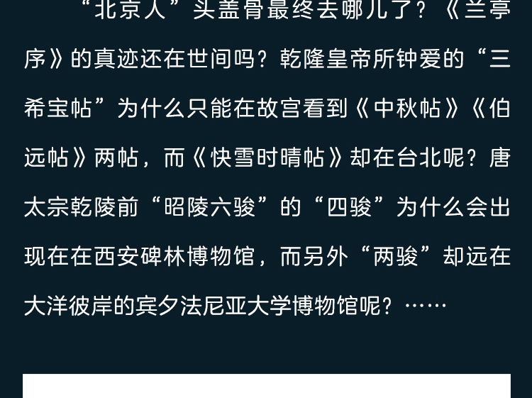 “北京人”头盖骨最终去哪儿了?《兰亭序》的真迹还在世间吗?乾隆皇帝所钟爱的“三希宝帖”为什么只能在故宫看到《中秋帖》《伯远帖》两帖,而《快雪时晴帖》却在台北呢?唐太宗乾陵前“昭陵六骏”的“四骏”为什么会出现在在西安碑林博物馆,而另外“两骏”却远在大洋彼岸的宾夕法尼亚大学博物馆呢?……《国宝迷踪》带你去找寻这些问题答案,了解文物的故事,认识文物的价值。