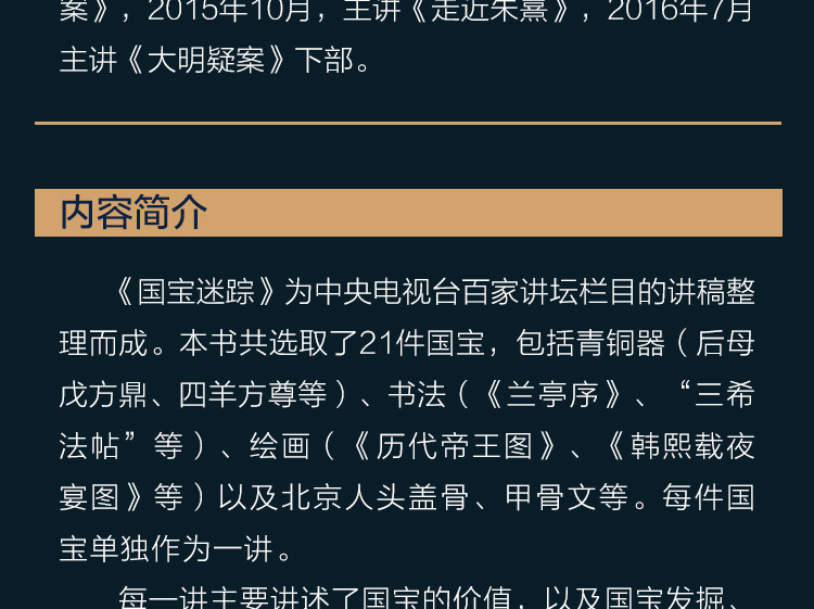 《国宝迷踪》为中央电视台百家讲坛栏目的讲稿整理而成。本书共选取了21件国宝,包括青铜器(后母戊方鼎、四羊方尊等)、书法(《兰亭序》、“三希法帖”等)、绘画(《历代帝王图》、《韩熙载夜宴图》等)以及北京人头盖骨、甲骨文等。每件国宝单独作为一讲。