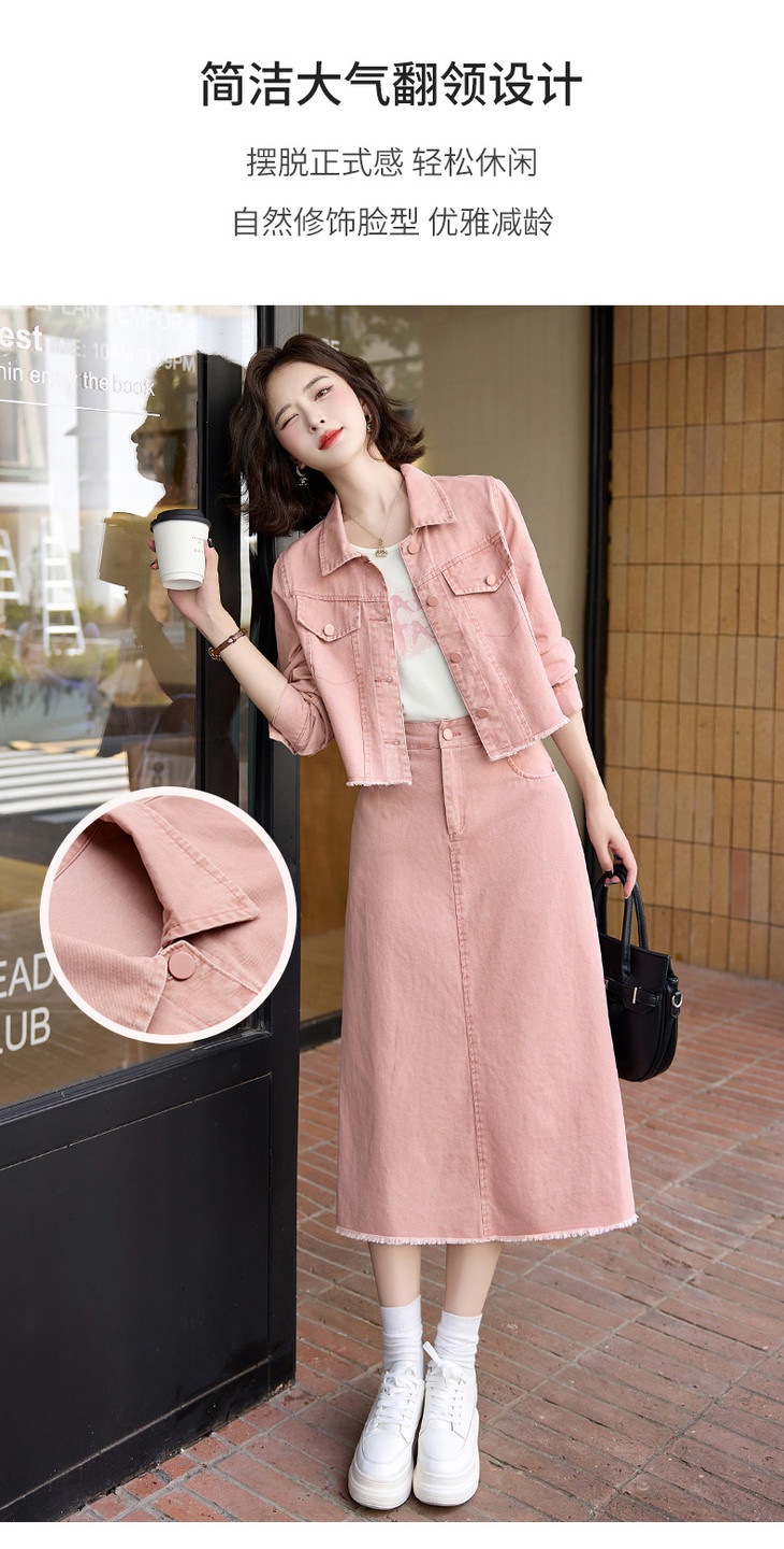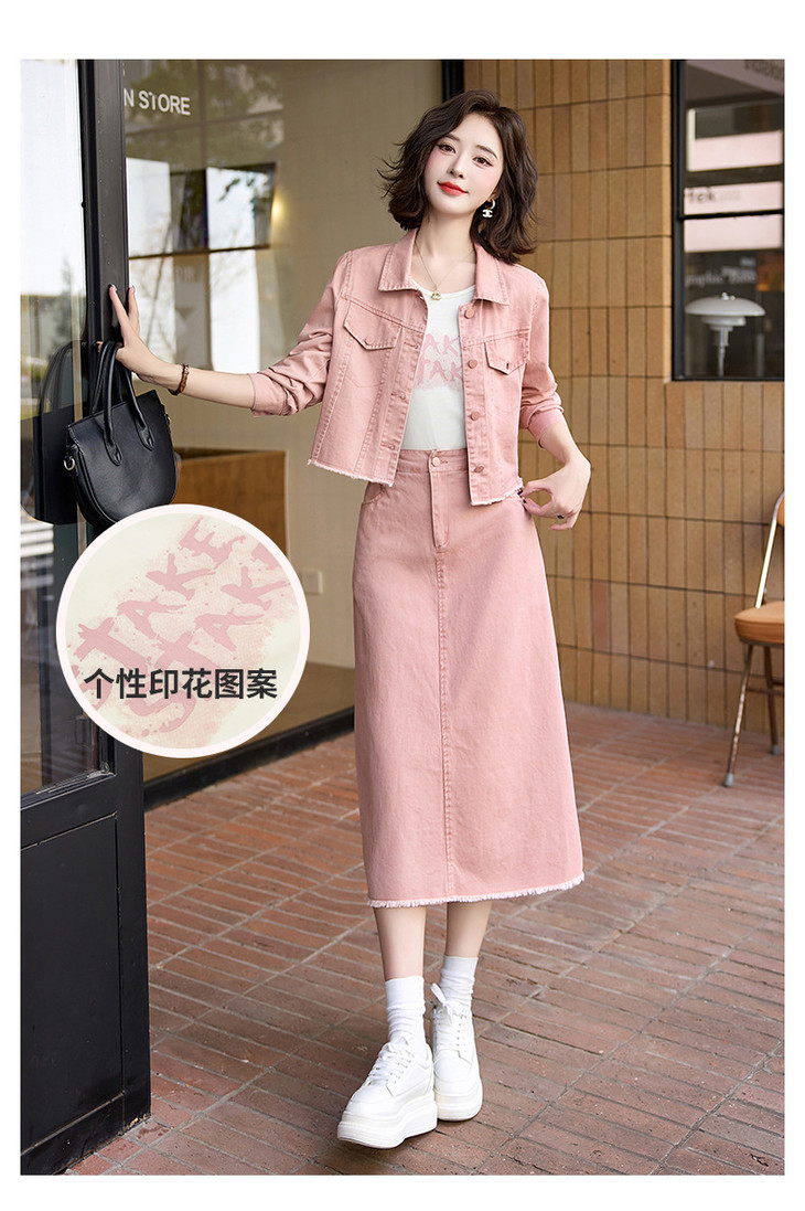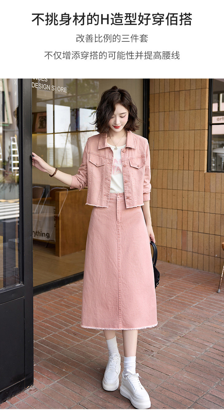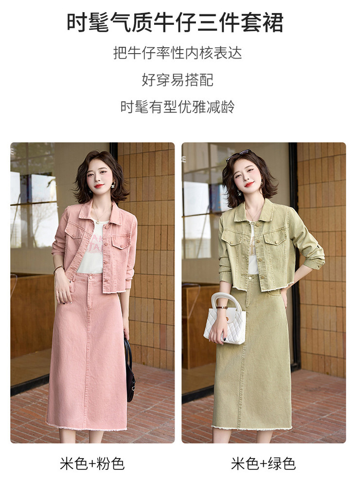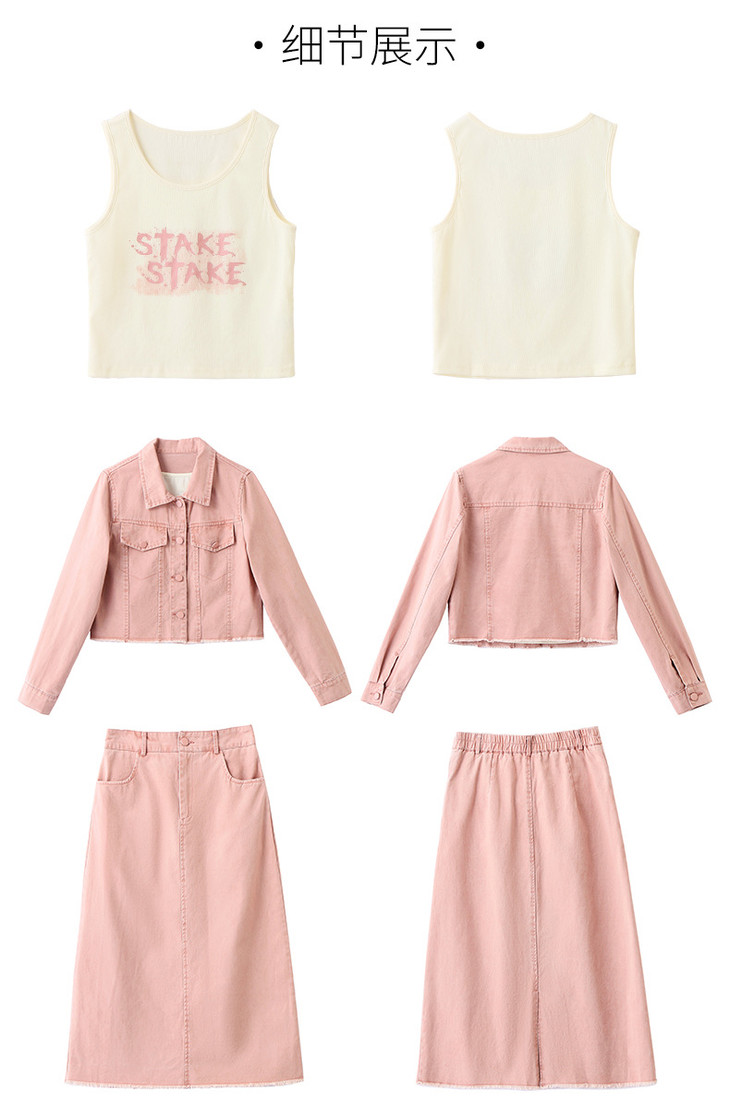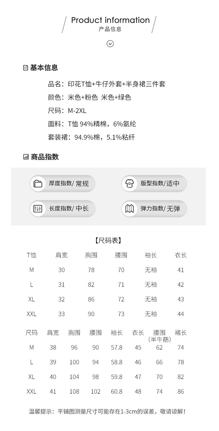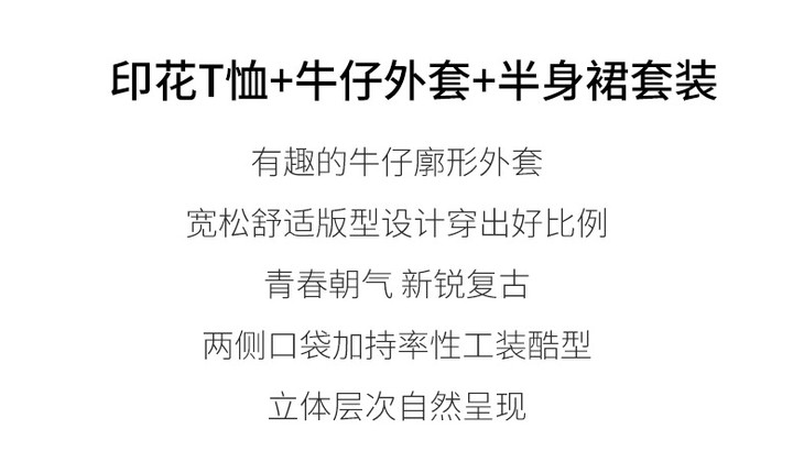 【预售5天】2024秋季新款时尚休闲套装印花T恤牛仔外套半裙三件套裙HR-MJ6005M