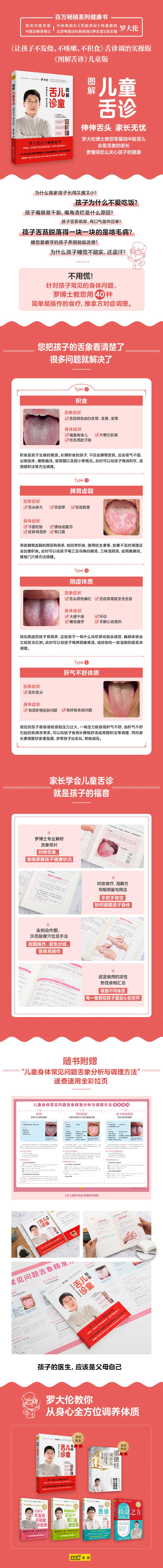 我是搞舌诊研究的,但在我出版的书中,还没有关于儿童舌诊的内容,这一直是我的遗憾。要知道,学会观察孩子的舌头特别重要,您把孩子的舌象看清楚了,很多问题就看出来了——因为这个方法最直观。看看舌头就能分析出孩子是什么体质,孩子身体哪儿出问题了,需要给他从饮食的哪方面做调整——在解析症状和成因之后,我都会给出相应的食疗、推拿等方法,方便您根据孩子的身体情况及时对症调理。中医讲究一方多用,很多看上去症状不同的疾病,其实治疗的方法是相同的。