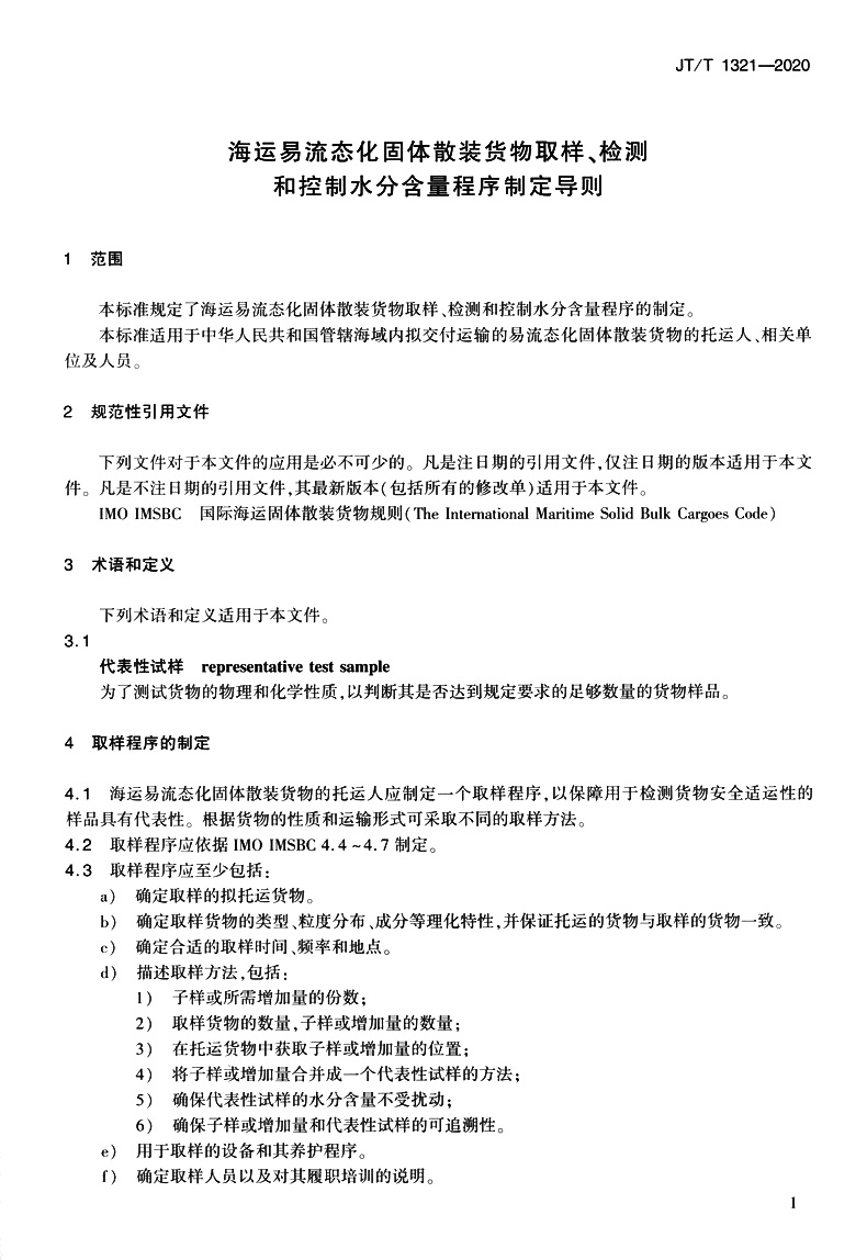 海运易流态化固体散装货物取样、检测和控制水分含量程序制定导则(JT/T 1321—2020)