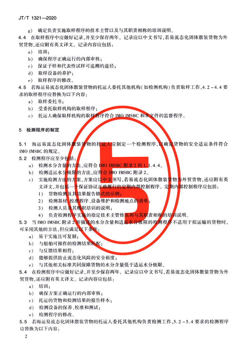 书名:海运易流态化固体散装货物取样、检测和控制水分含量程序制定导则(JT/T 1321—2020)