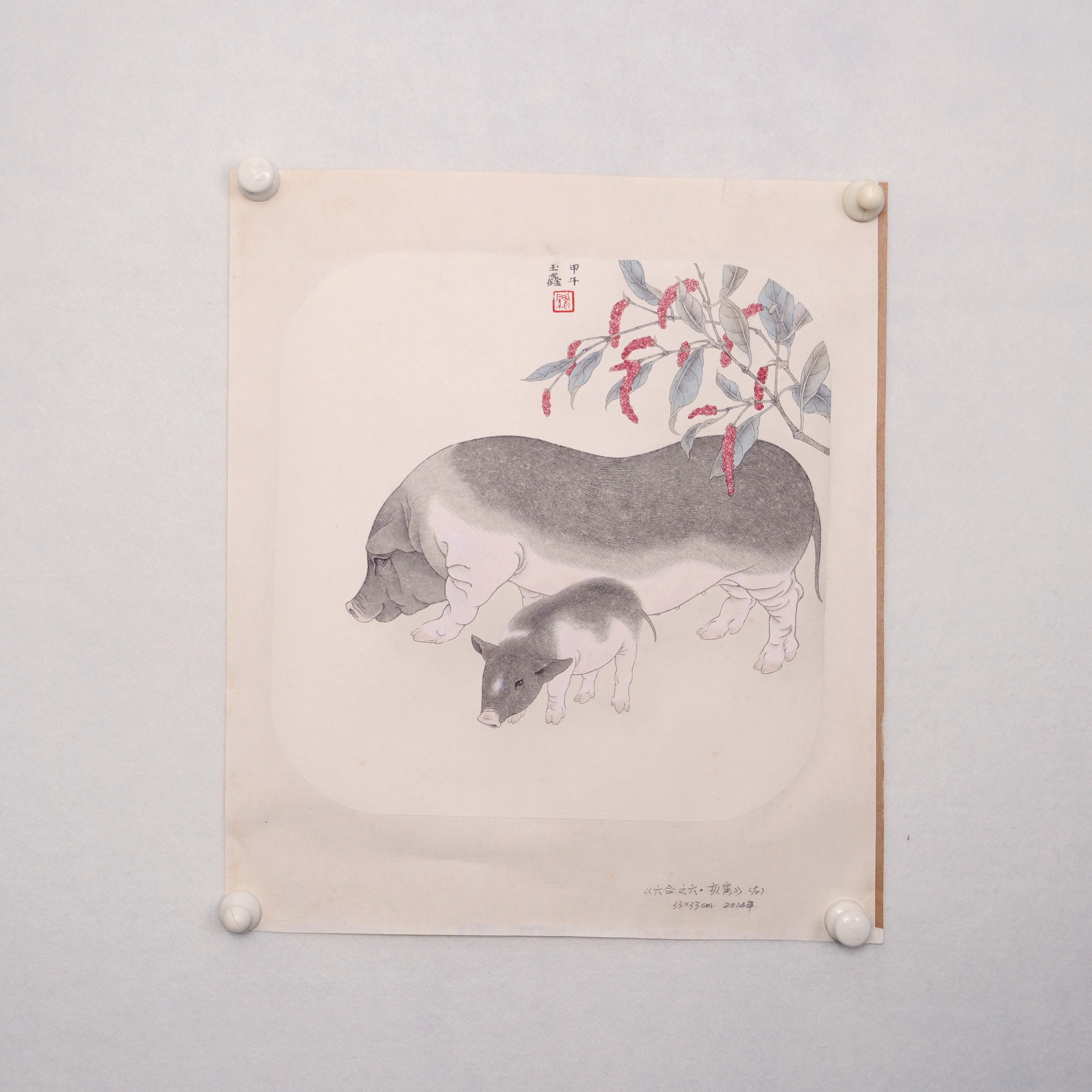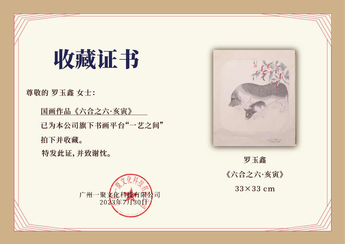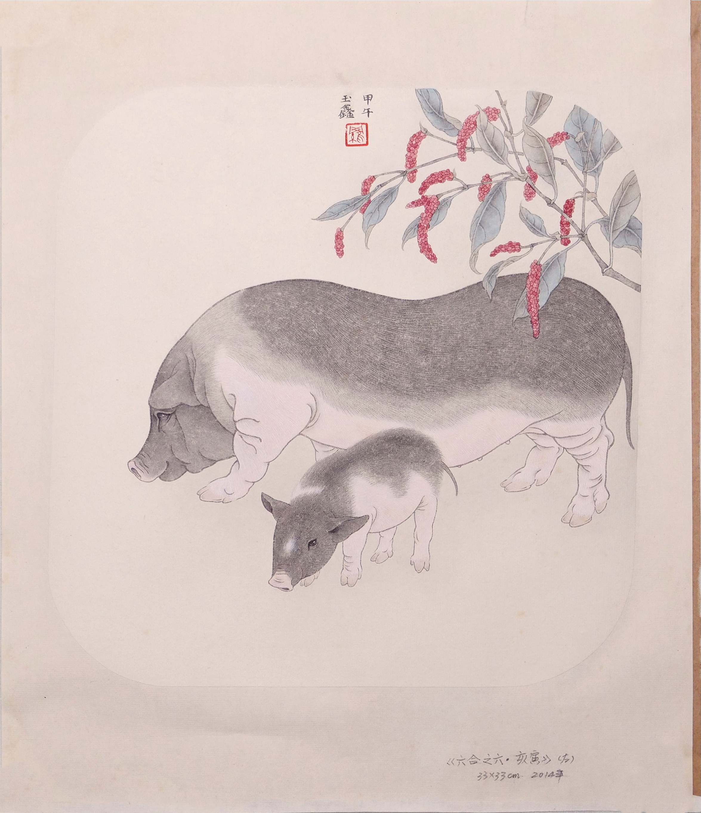 罗玉鑫国画33x33CM《六合之六·亥寅(猪)》一1平尺手绘纸本工笔国画作品[原作编号GH0389]