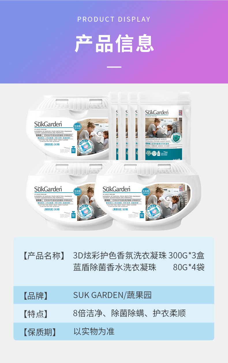 蔬果园3D洗衣凝珠(浓缩强效型)-10g*30颗*3盒+蔬果园蓝盾除菌香水洗衣凝珠-8g*10颗(袋装)*4袋