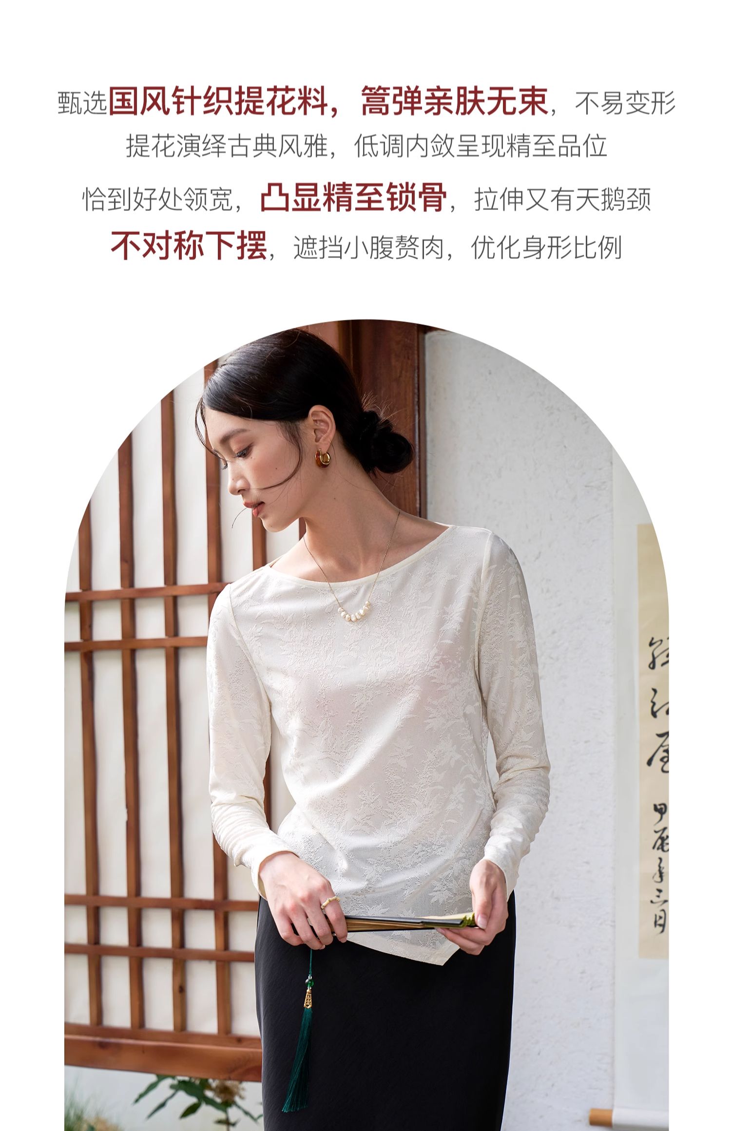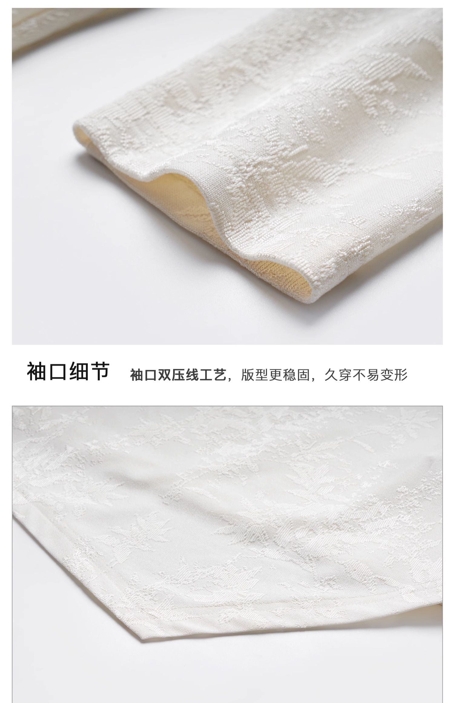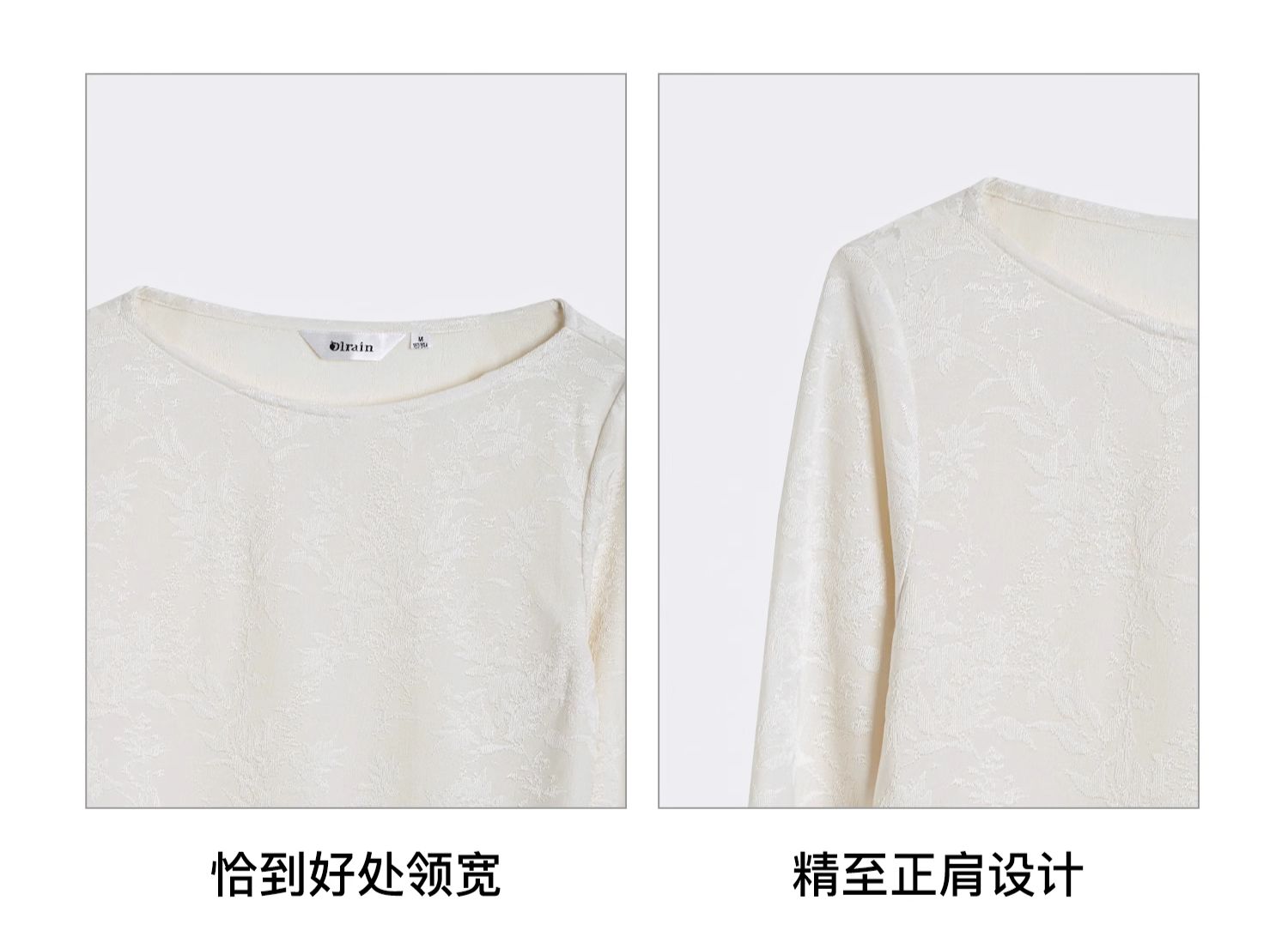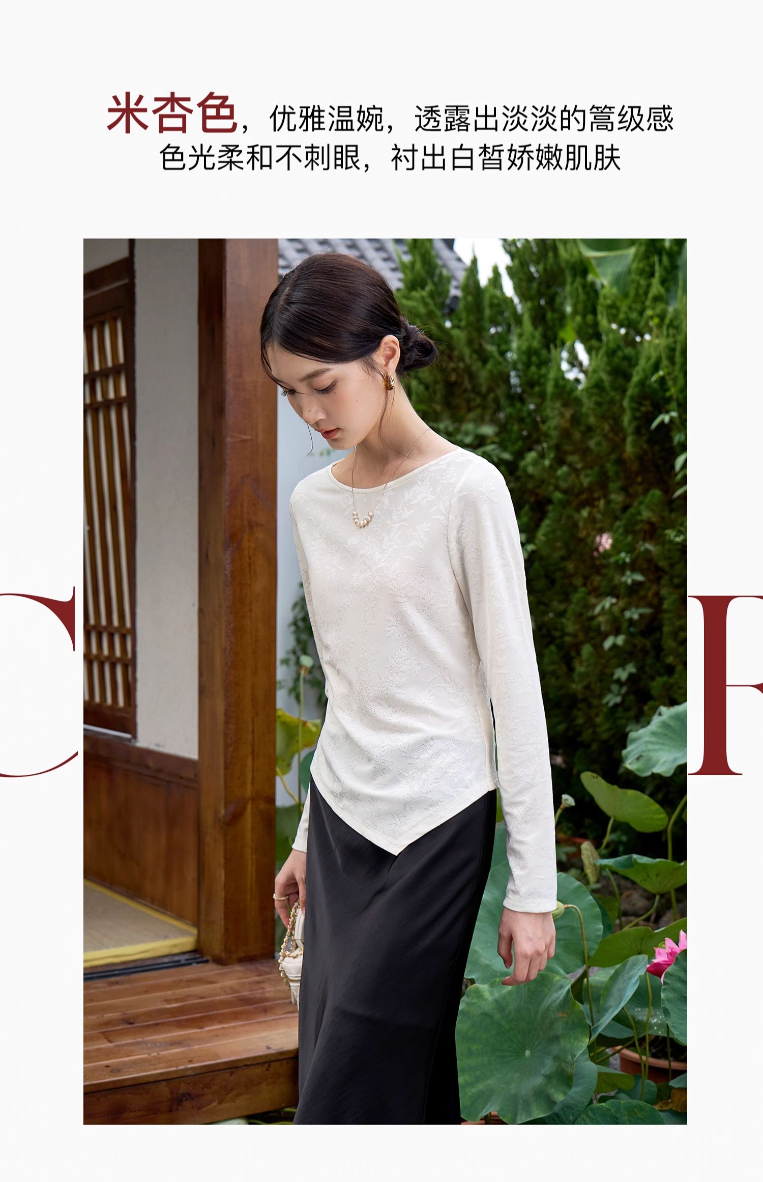 OLrain欧芮儿米杏色提花T恤女秋2024新款设计感不规则中国风上衣