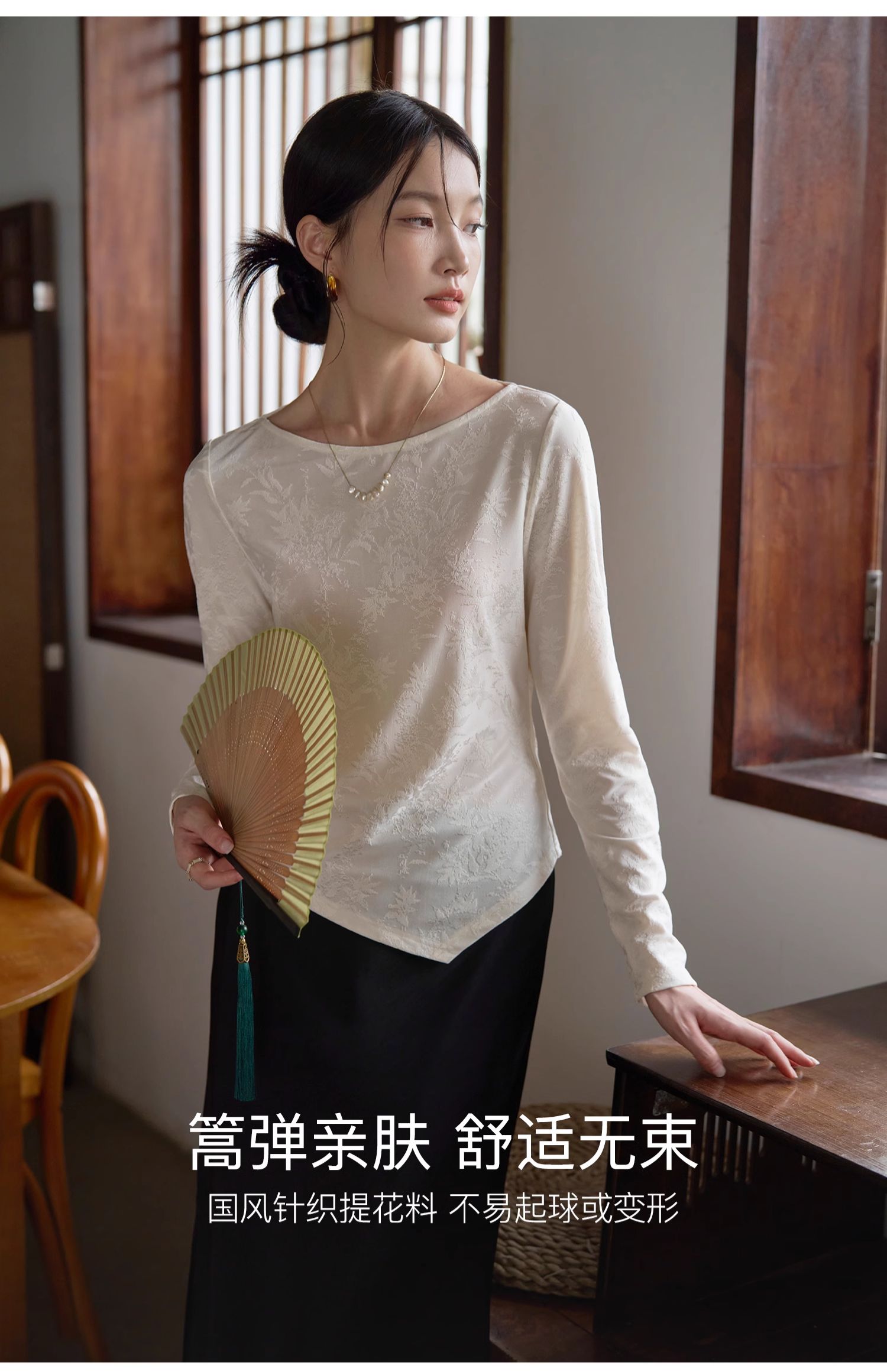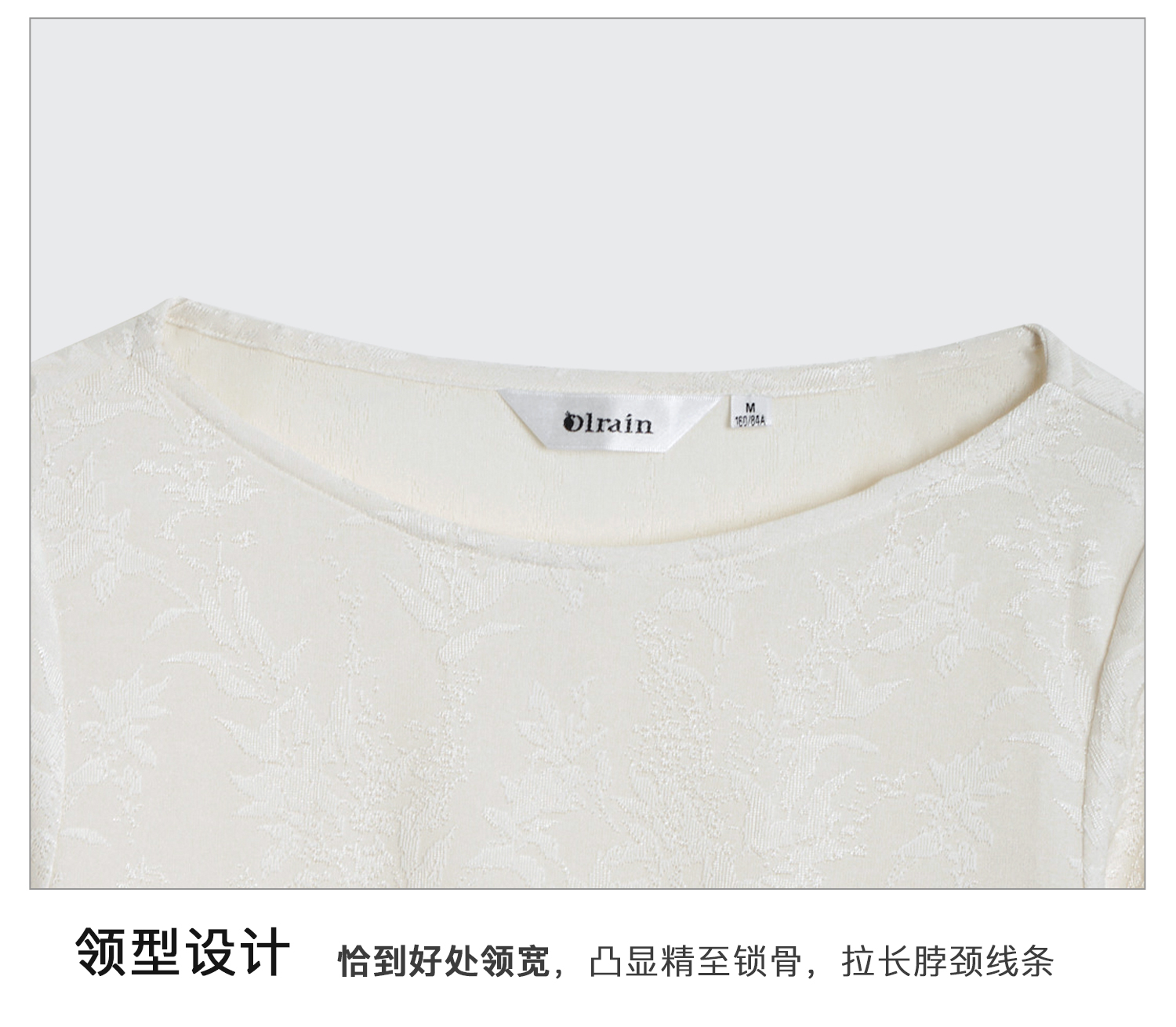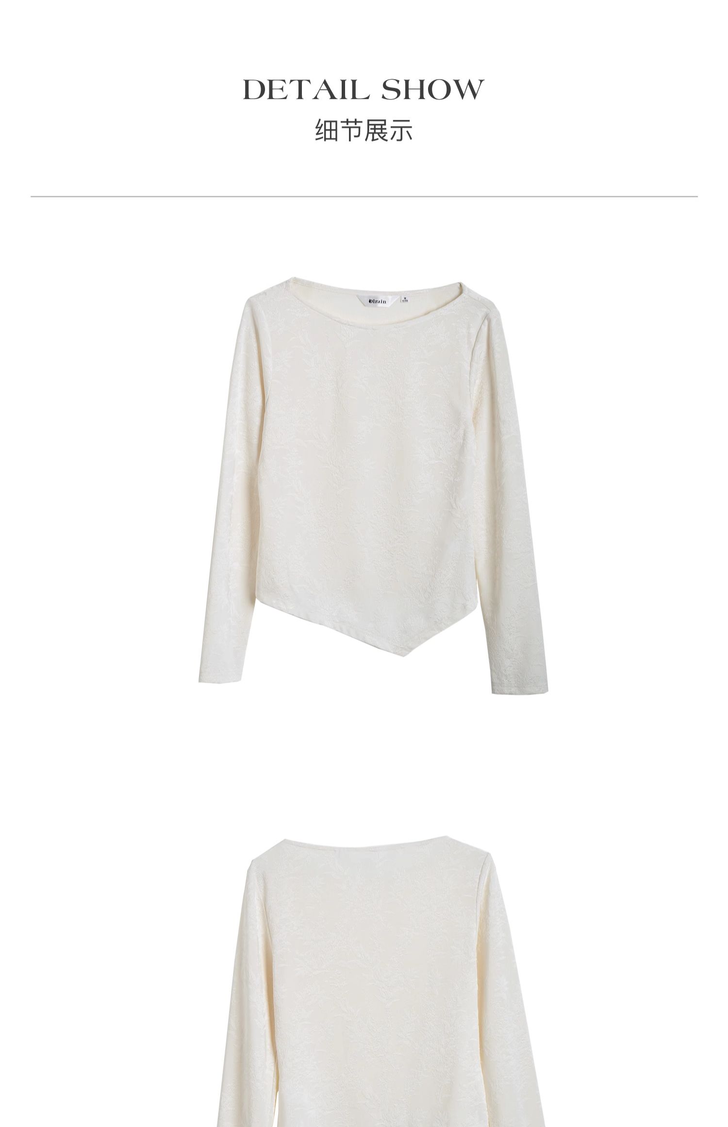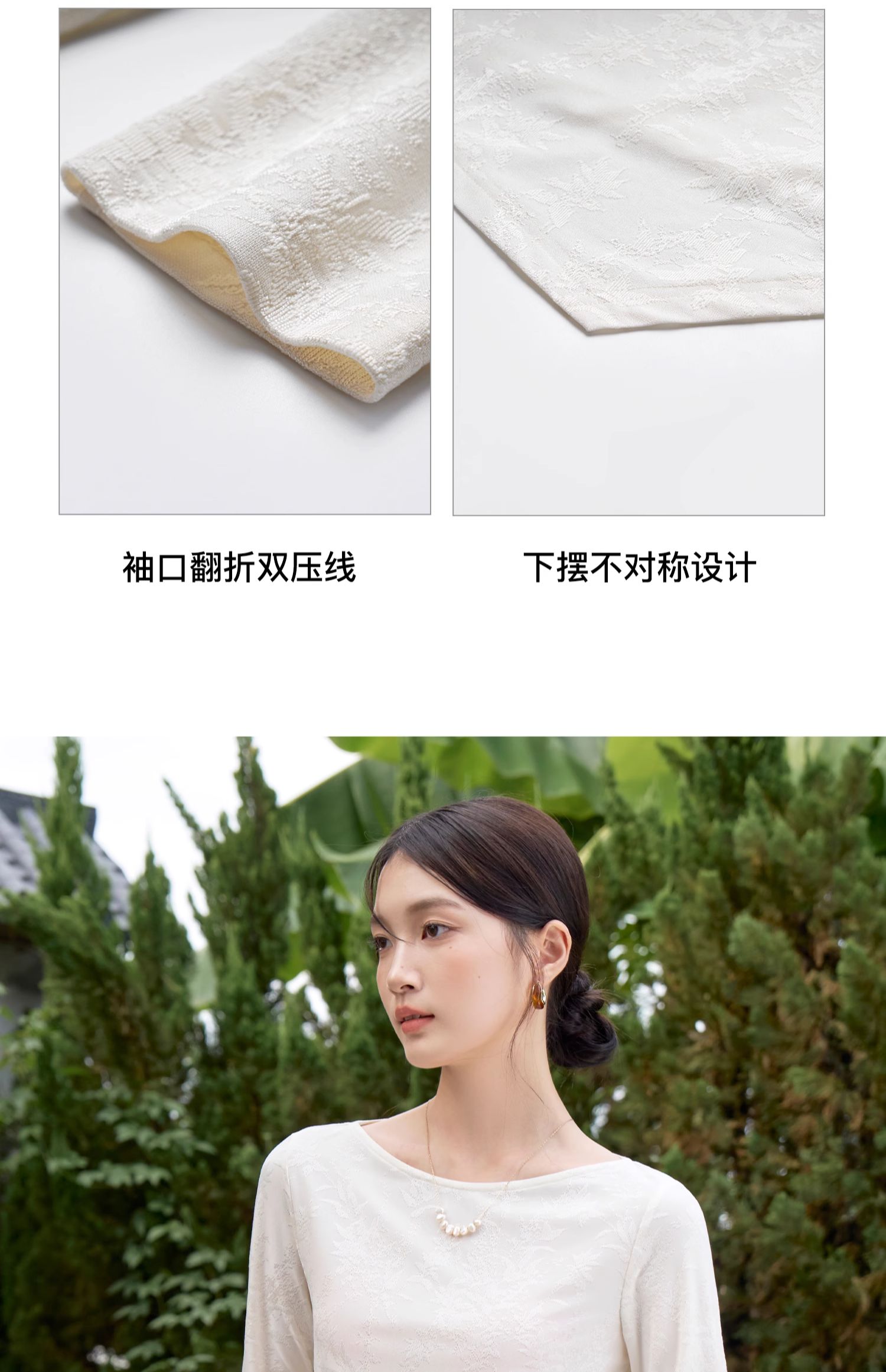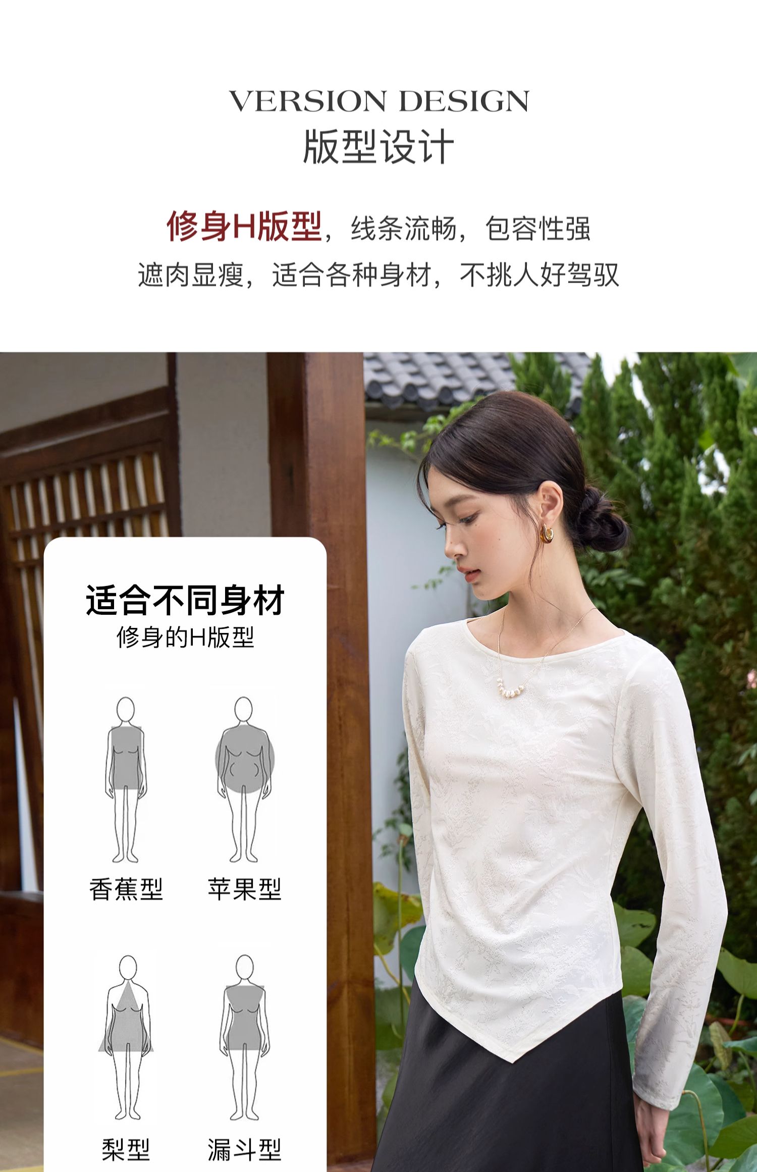 OLrain欧芮儿米杏色提花T恤女秋2024新款设计感不规则中国风上衣