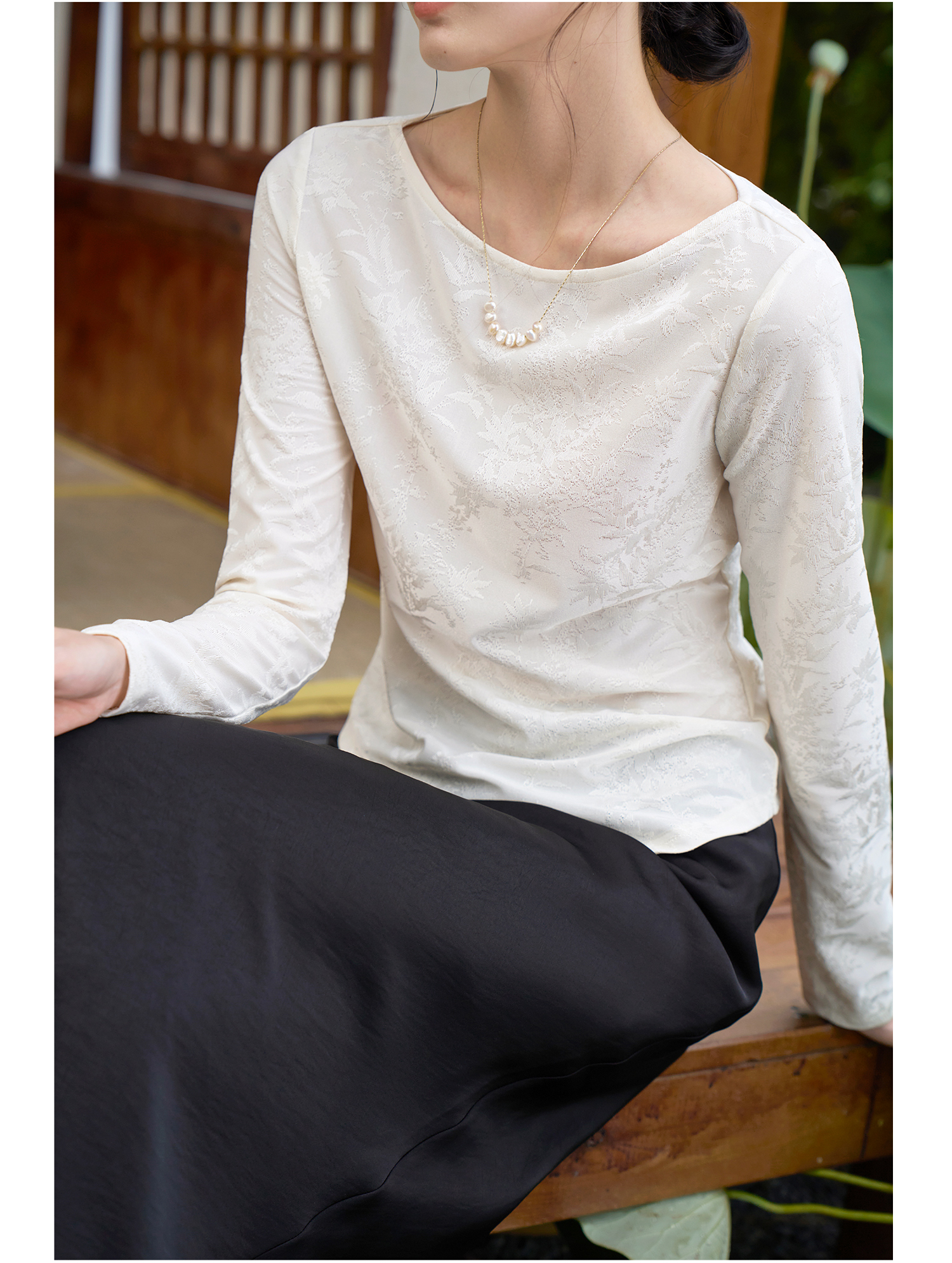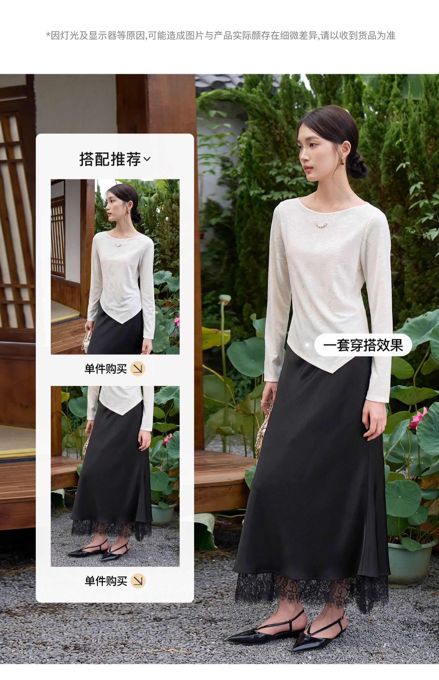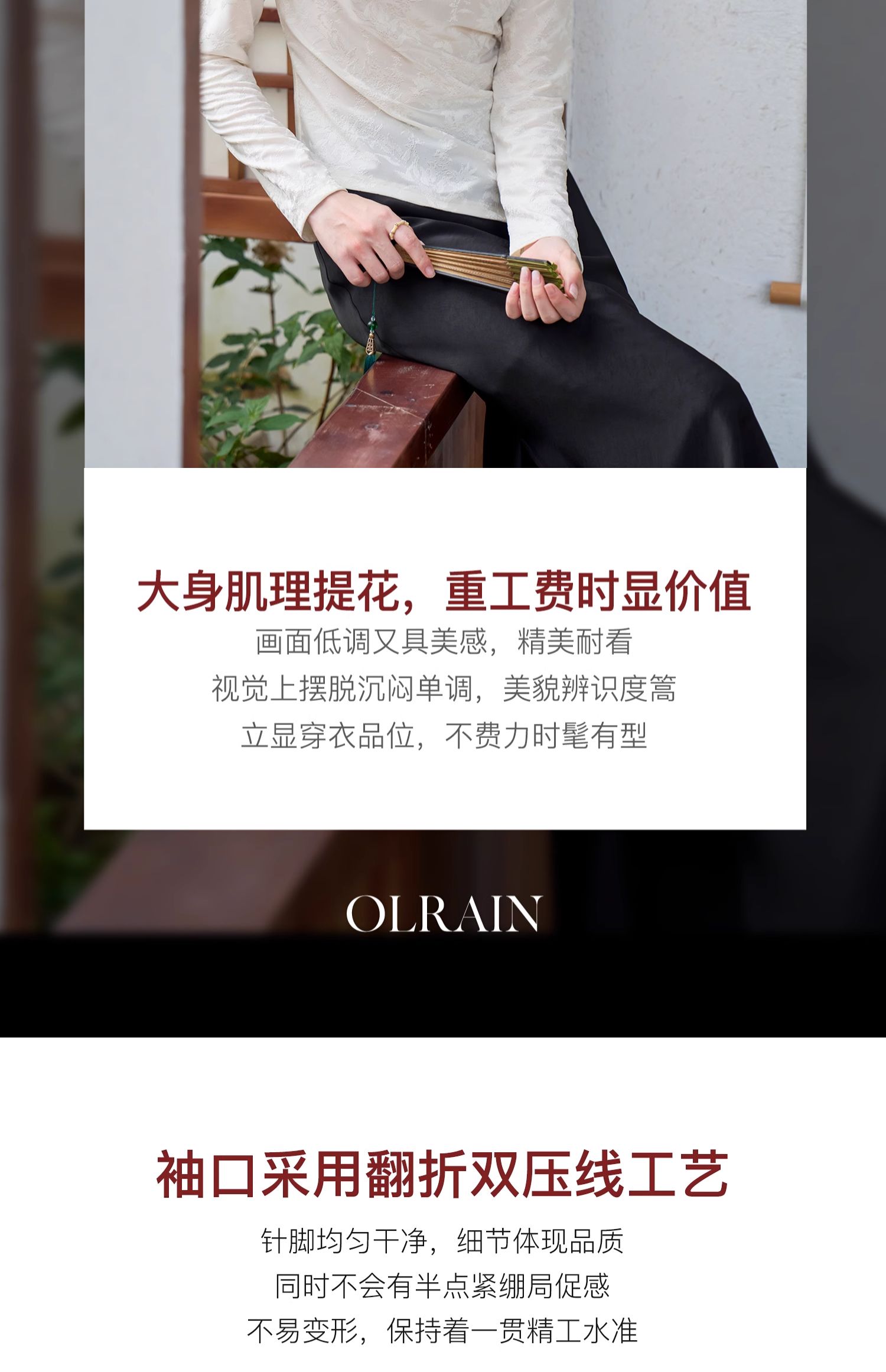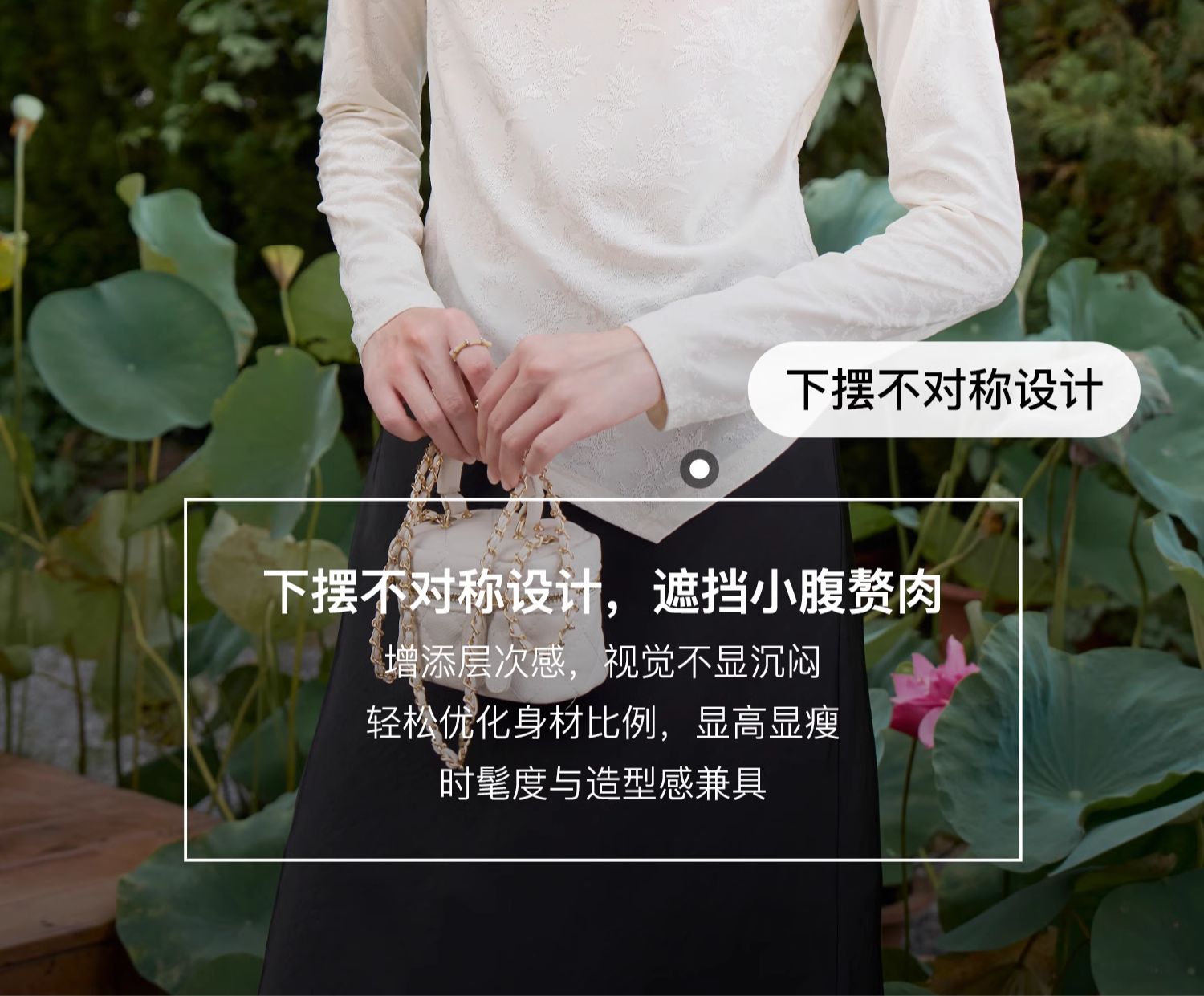 OLrain欧芮儿米杏色提花T恤女秋2024新款设计感不规则中国风上衣