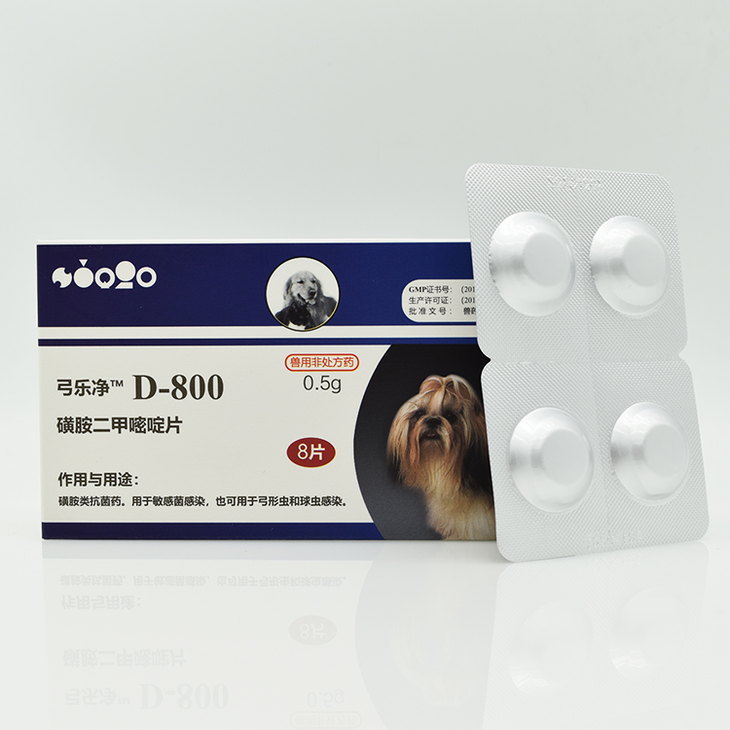 弓乐净D-800,8粒/盒,成份:磺胺二甲嘧啶片 ,2027年10月13号到期,用于敏感菌感染,犬猫弓形体及球虫的治疗与预防,内服:一次量,28-40维持量14-20片,一日1-2次。