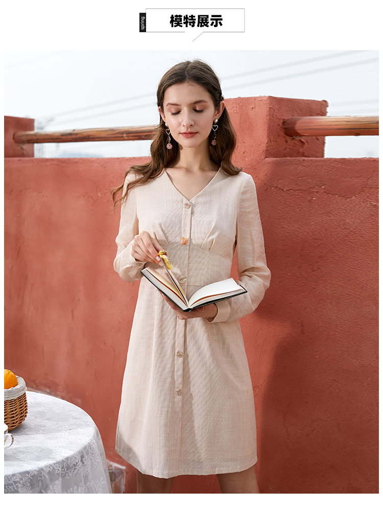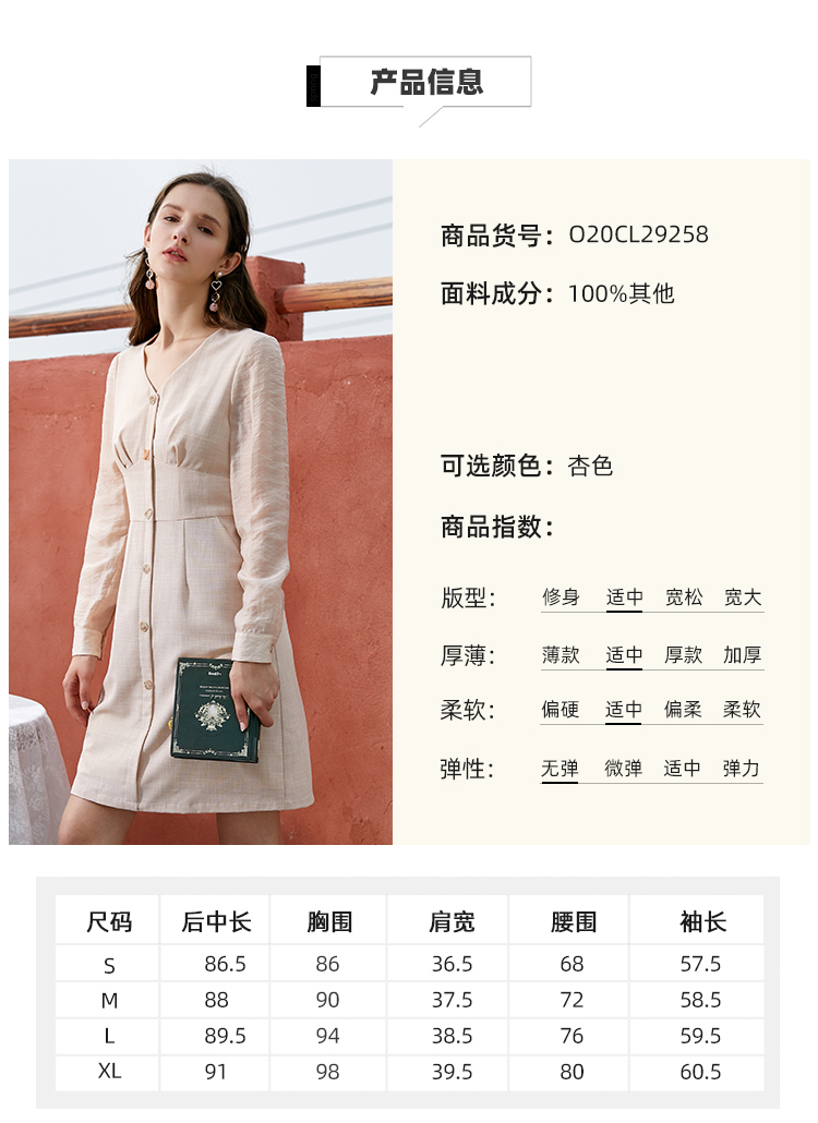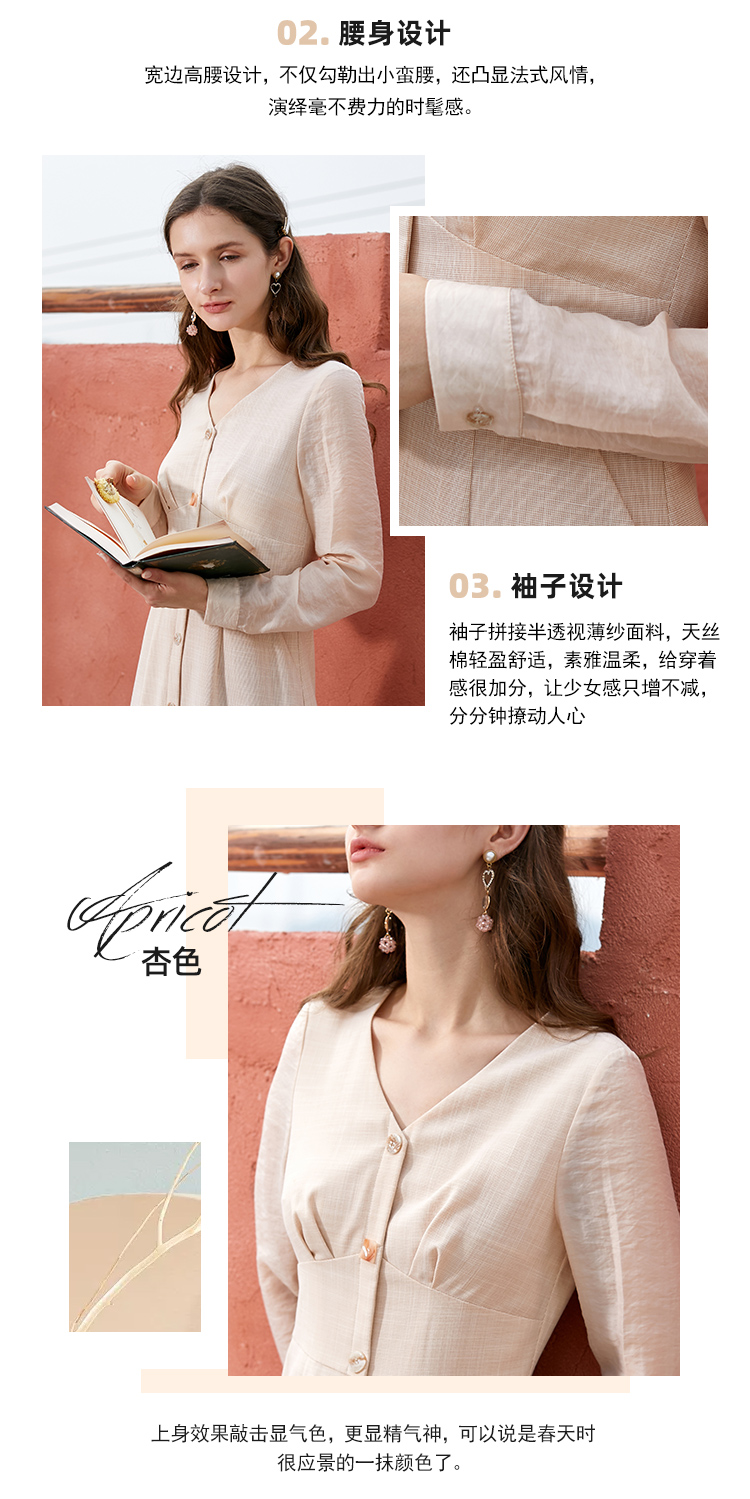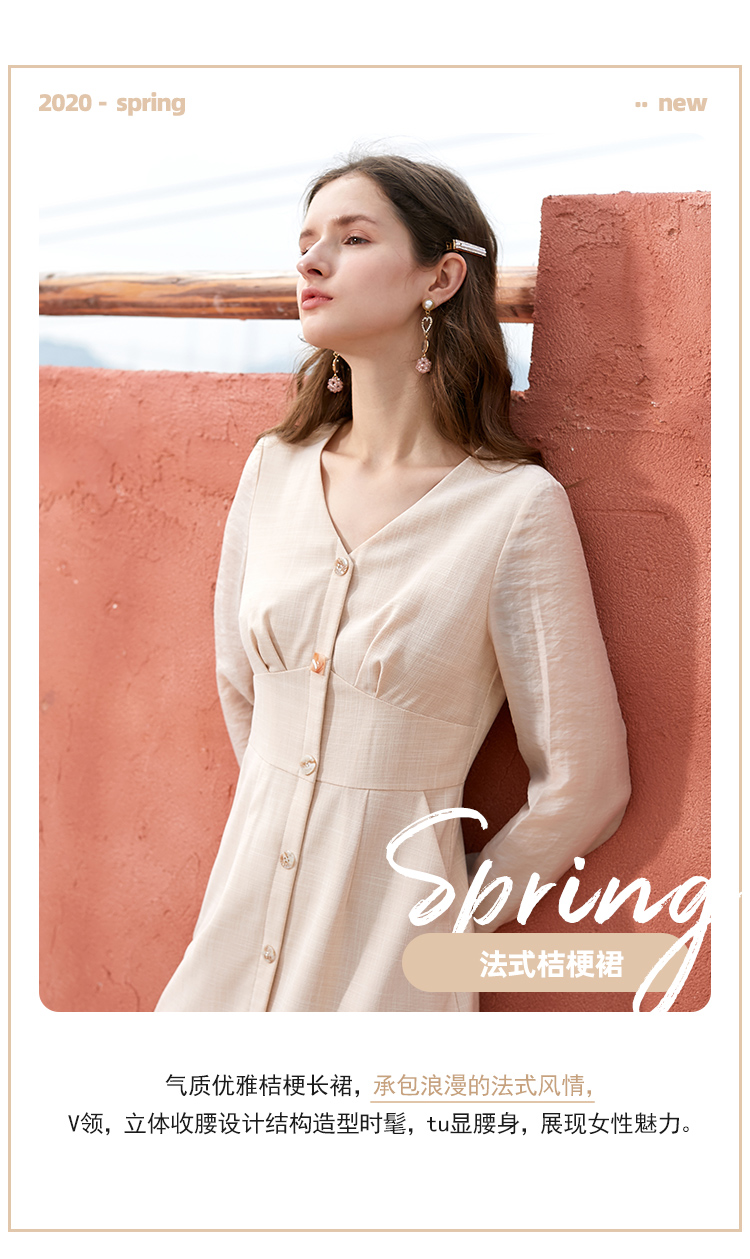 欧芮儿春新款长袖V领连衣裙女中长款小个子显瘦收腰A字裙