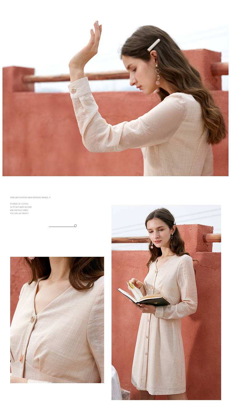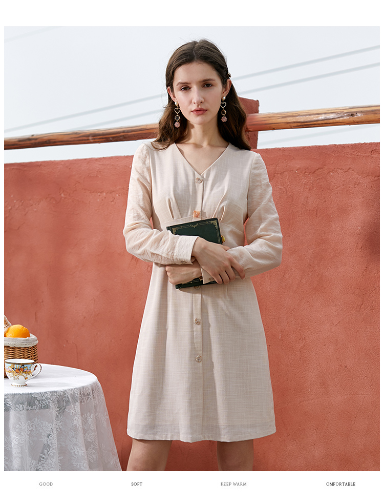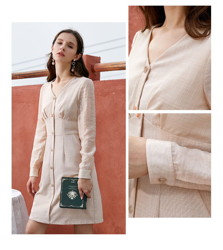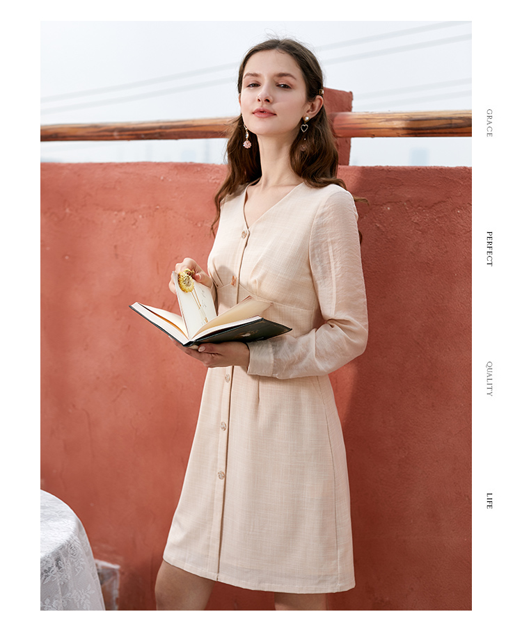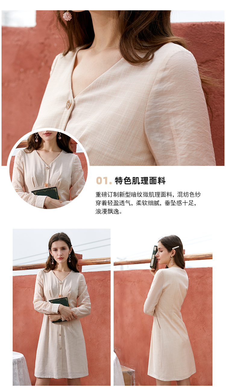 欧芮儿春新款长袖V领连衣裙女中长款小个子显瘦收腰A字裙