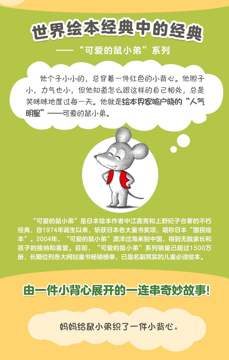 “可爱的鼠小弟”系列是日本绘本作者中江嘉男和上野纪子合著的不朽经典,自1974年诞生以来,斩获日本各大童书奖项——日本学校图书馆协会好绘本奖、日本产经儿童出版文化奖、日本讲谈社出版文化绘本奖、日本厚生省儿童福利文化奖,堪称日本“国民绘本”。