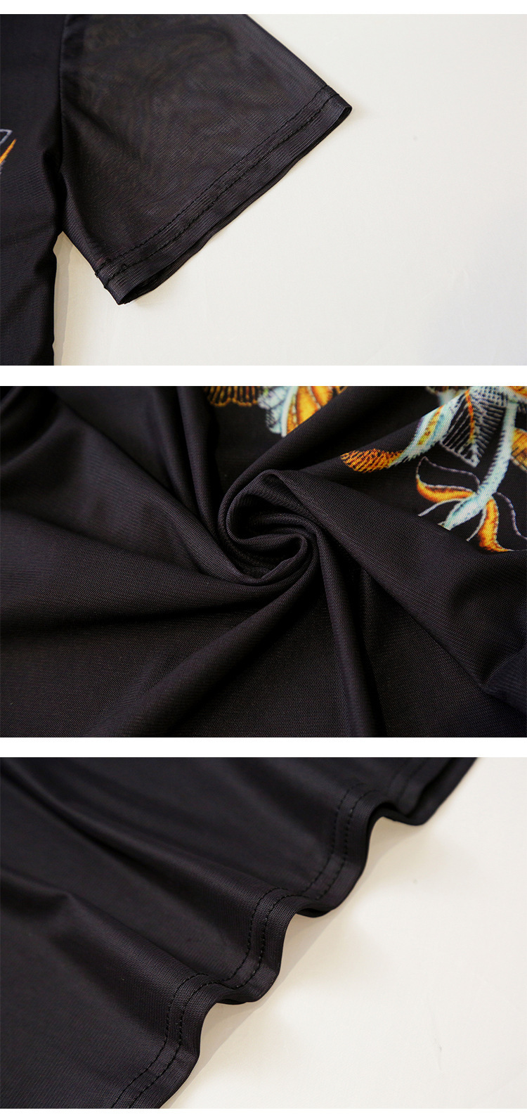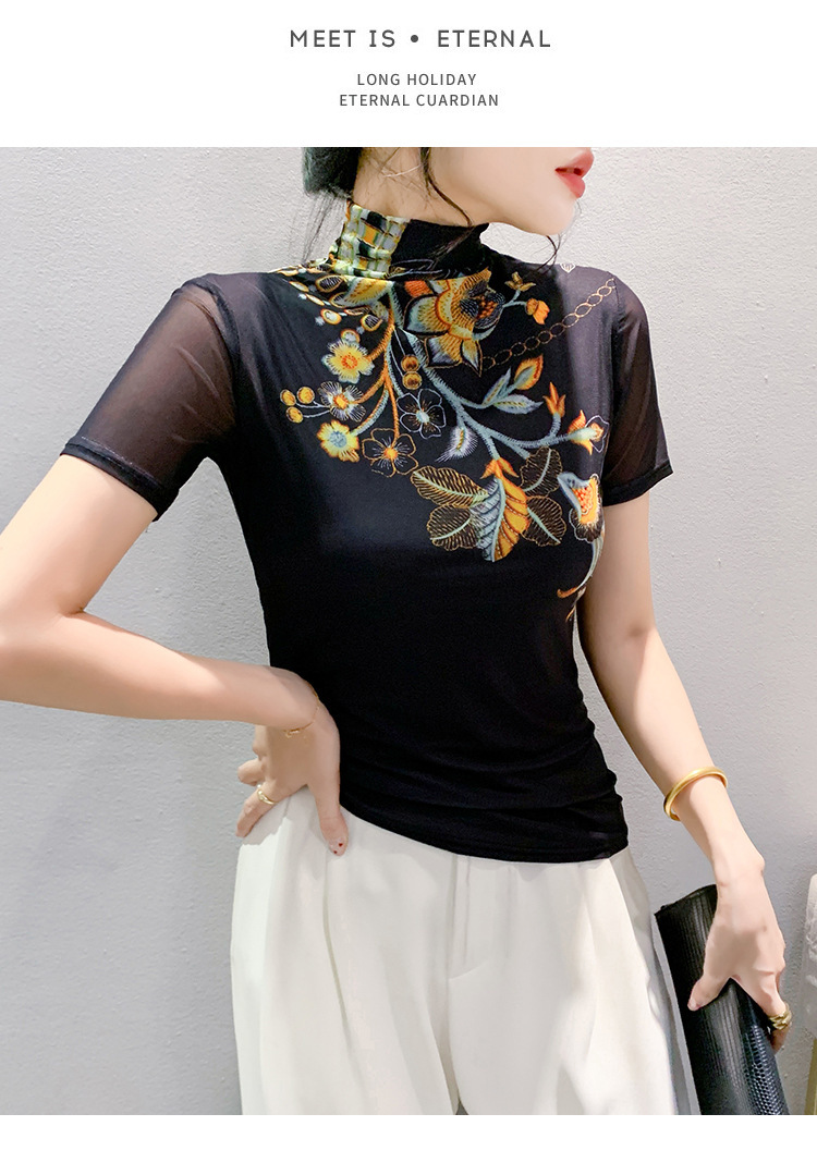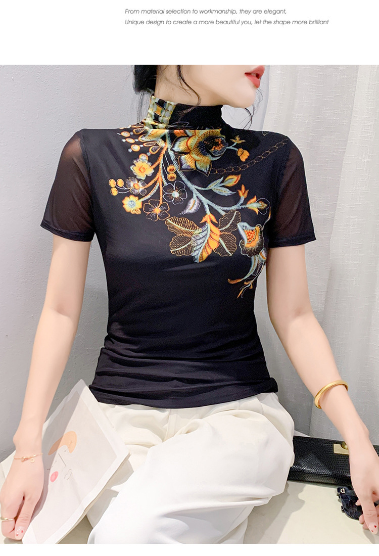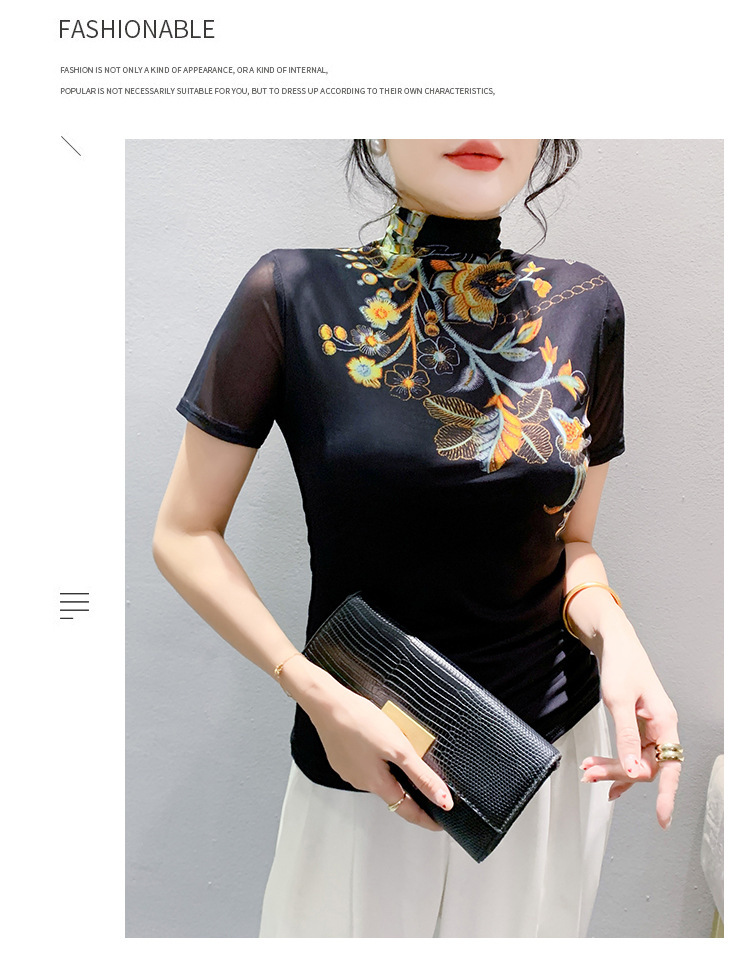 洋气半高领印花短袖网纱设计感上衣K-A55F8639