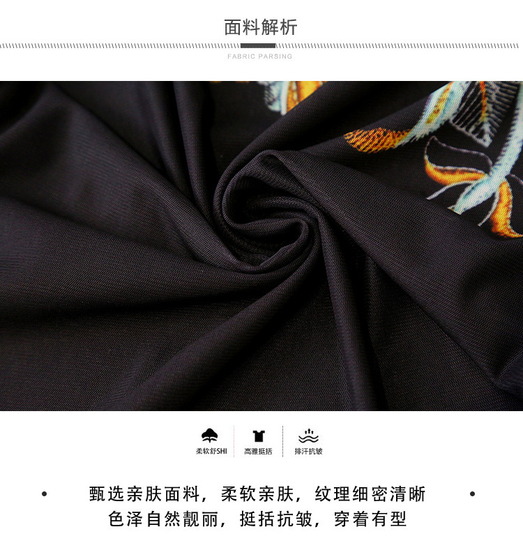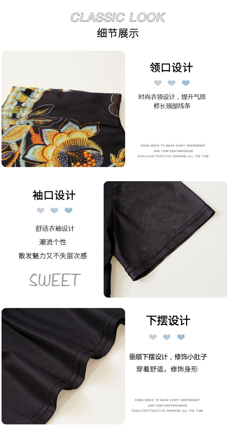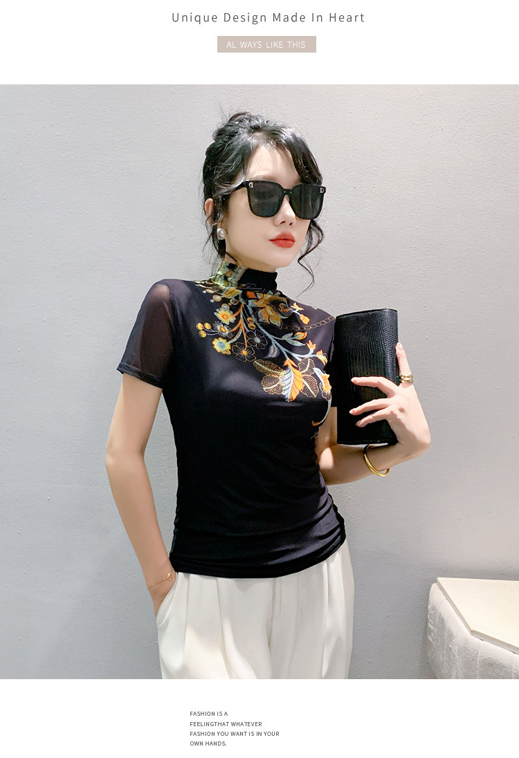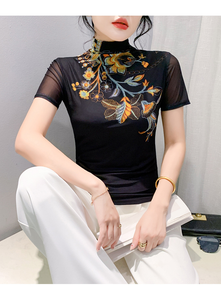 洋气半高领印花短袖网纱设计感上衣K-A55F8639