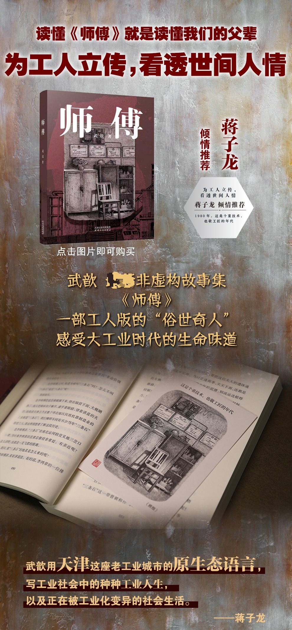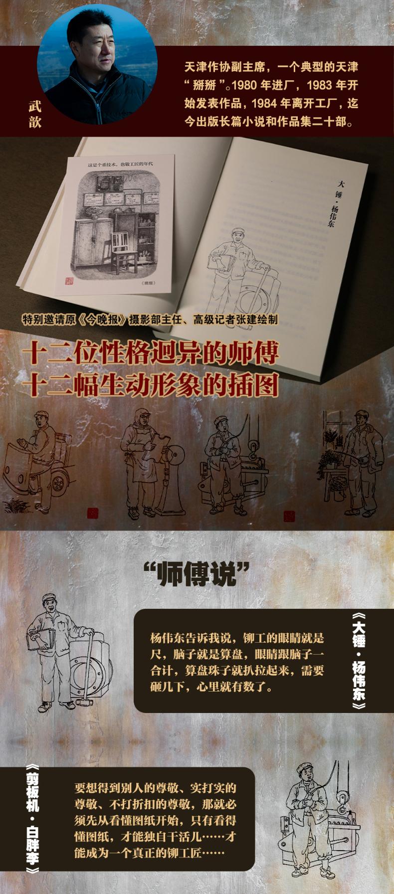 《师傅》是一部非虚构故事集,作者以真实工作过的八十年代天津某工厂铆工组为背景,刻画了十二位性格迥异、身手不凡的工人师傅的形象,通过讲述他们的故事,展现天津的工业生活和世间百态。 作者别出心裁地以每位师傅擅长的“工具+绰号”作为每一篇的标题,比如大锤•杨伟东、小锤•老李、剪板机•白胖李、卷尺•贾淄博、油压机•达伦,从题目开始就把读者带入工厂的火热氛围中。为此,本书特意邀请原《今晚报》摄影部主任、高级记者张建绘制了十二幅人物钢笔画像插在书中,使得作者笔下的人物有了更具象的表达。 个人不是孤立的存在,师傅们的故事是他们的家庭、他们所属的群体、他们生活的时代的共同经历。当读者被作者笔下细腻丰满、生动感人的师傅们的故事打动时,天津制造业发展的历史、天津城市变迁的历史、天津工人生活的历史也逐渐在脑海中清晰起来。一本书,一群人,一个时代。本书是一幅热血朝天、阵仗庞大、细致入微的工厂图景,也是八十年代天津......