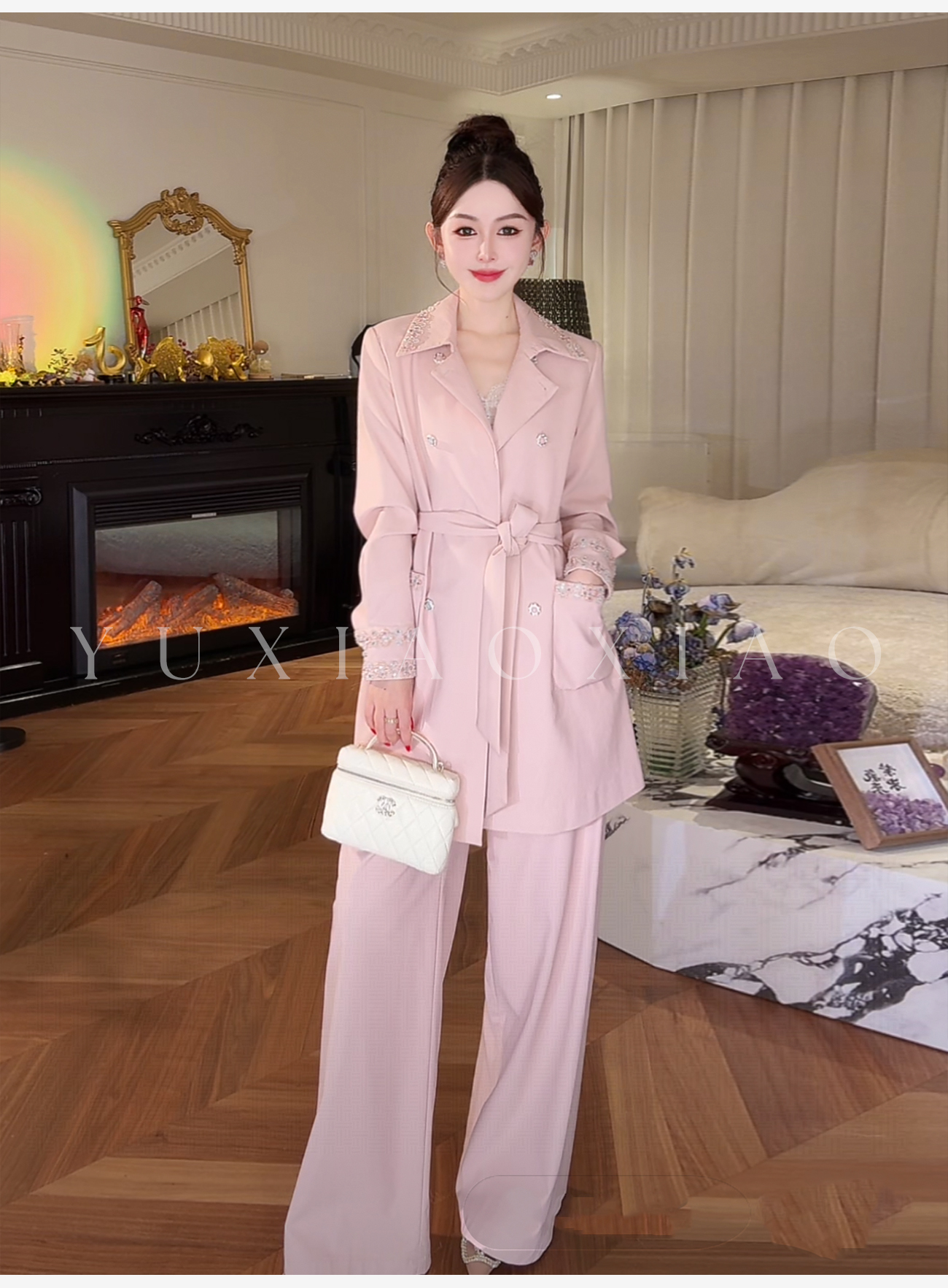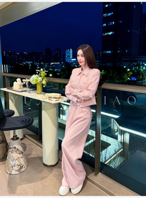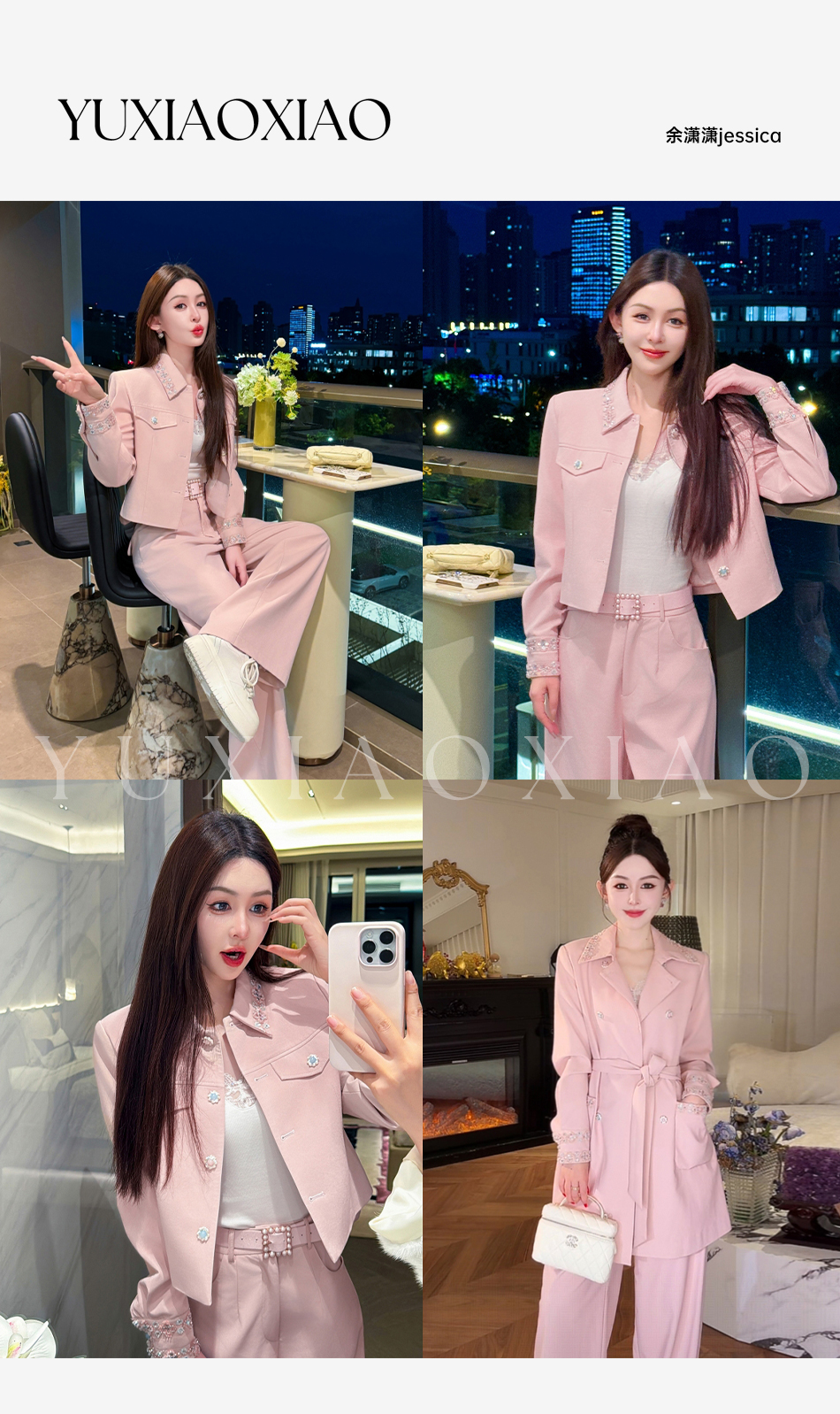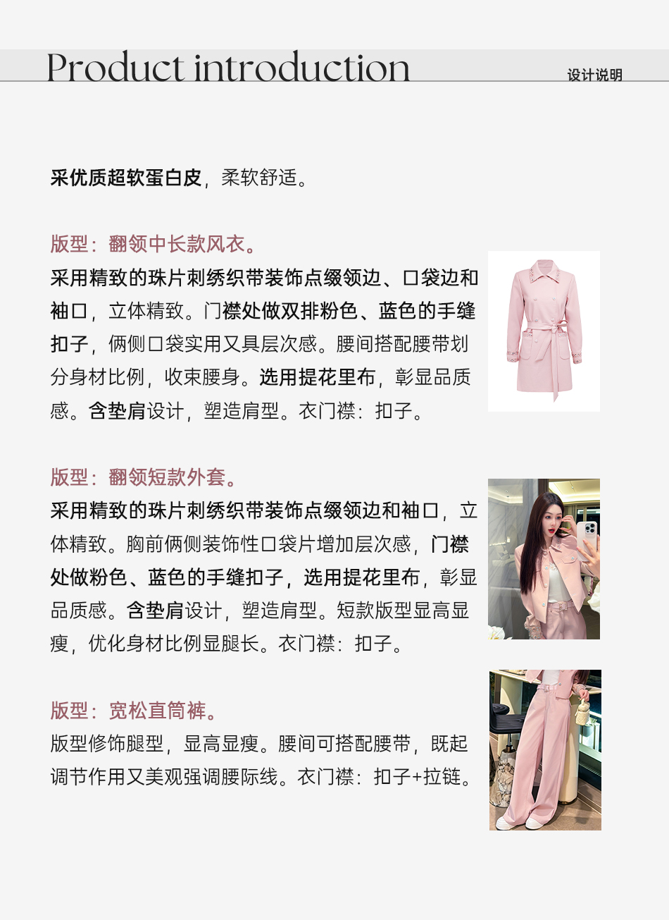 余潇潇【甜心工坊】珠片刺绣皮质翻领长款风衣&短款外套&宽松直筒裤