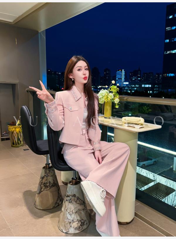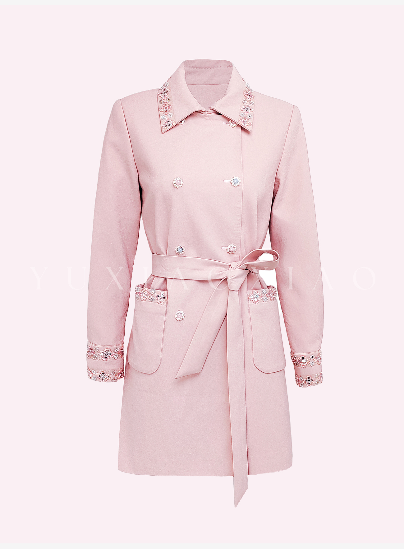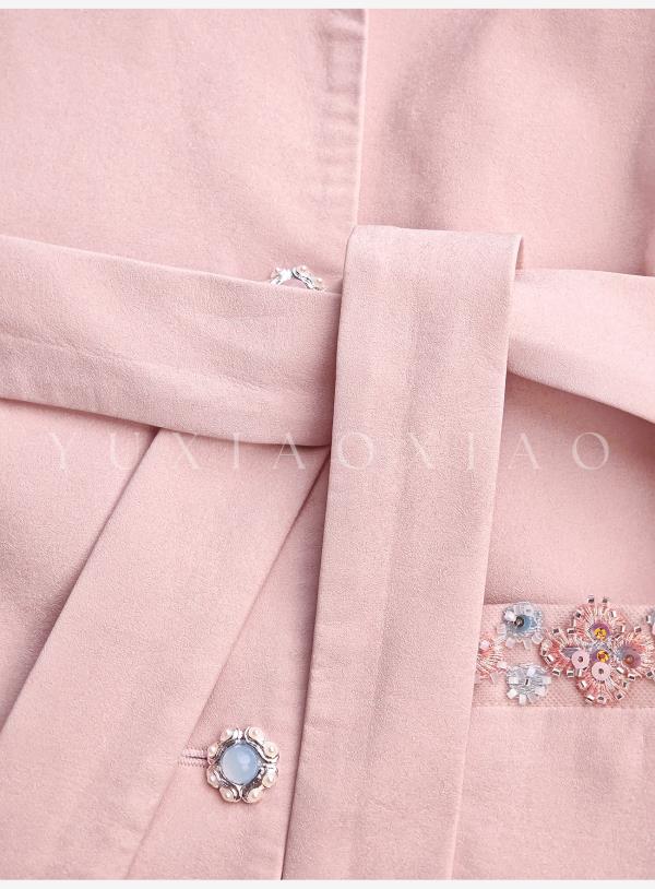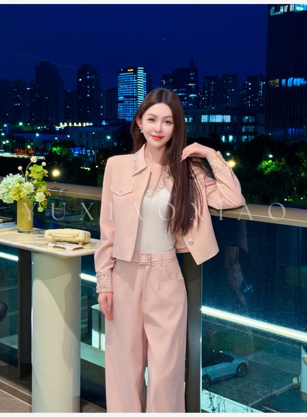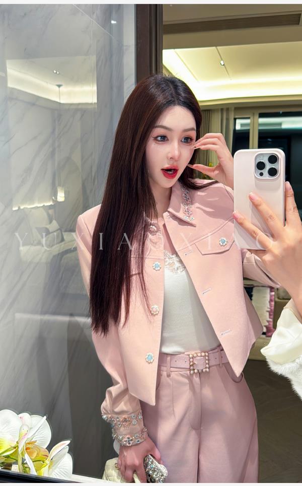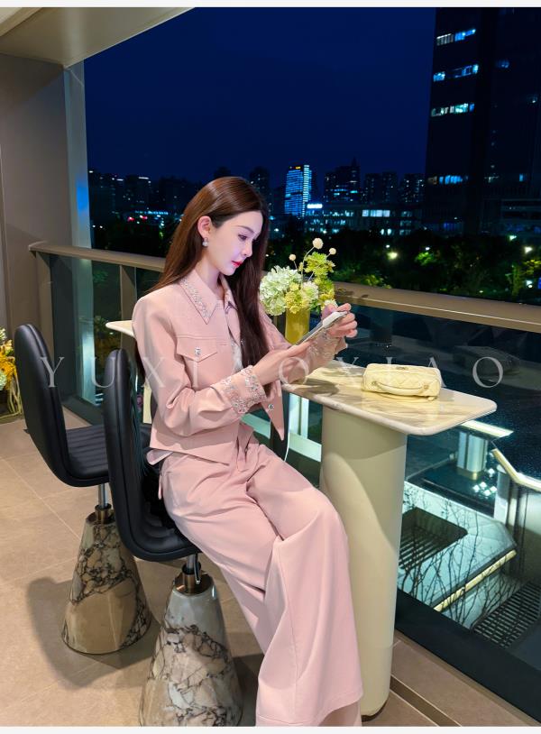 余潇潇【甜心工坊】珠片刺绣皮质翻领长款风衣&短款外套&宽松直筒裤