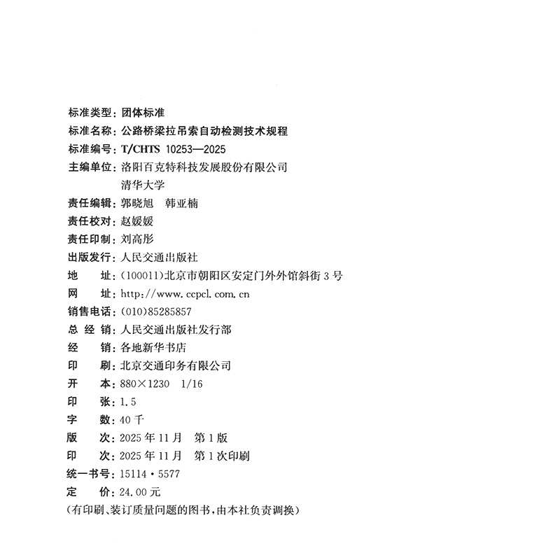 书名:公路桥梁拉吊索自动检测技术规程(T/CHTS 10253——2025)