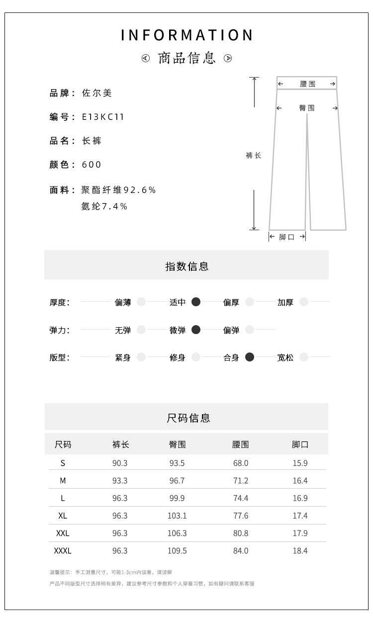 佐尔美秋季新款 气质百搭长裤女E13KC11