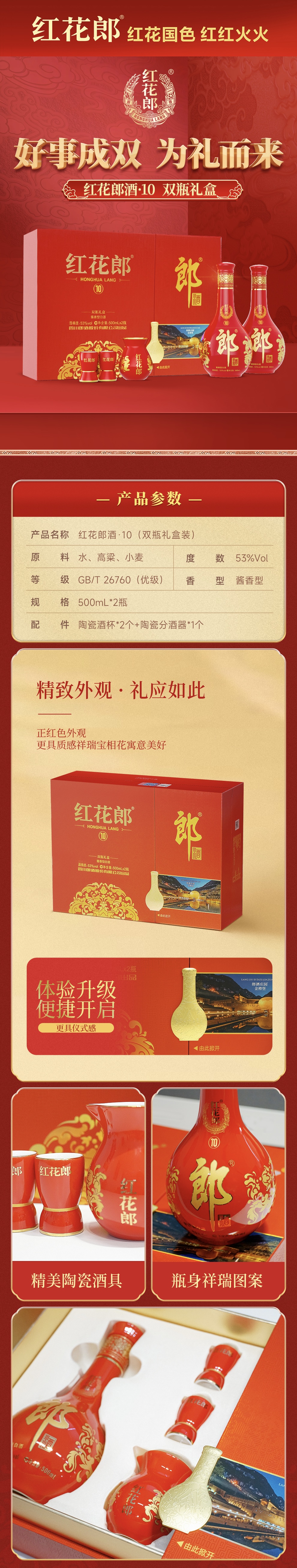 郎酒 红花郎 红十 第五代双瓶礼盒 53度酱香型白酒 500ml*2*4整箱装