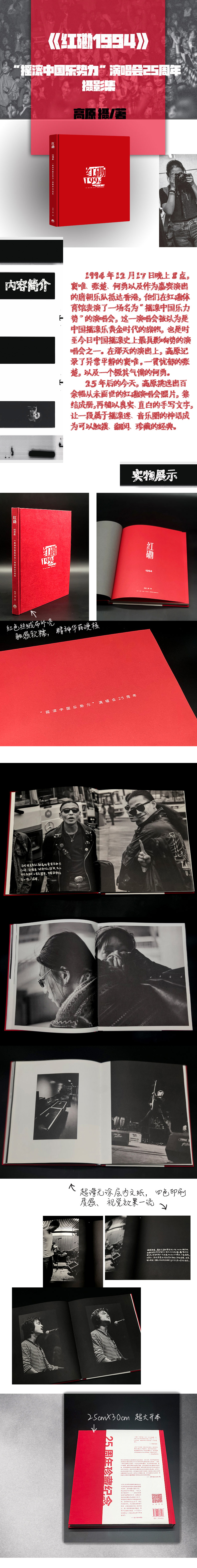 “摇滚”摄影师高原的首本摄影集 百余幅“94红磡”的超大绝版照片 汪峰、高虎、彭磊等25位摇滚人“表白”推荐! ★ 作为摄影师的高原的摄影集,一本纯粹的摄影集。 ★ 高原说“每一次现场都是不可复制的永恒,重要的是,我在现场”。1994年的红磡演唱会,无论后世对其评价如何,都是会被历史记住的一役。而那一役,高原就在现场。作为读者,你手捧着的可能就是“不可复制”的“*”。 ★ 窦唯、张楚、何勇、邓讴歌、欧阳、刘义军、张炬……熟悉的名字,不羁的面庞,灵活的躯体,躁动的心……近200幅从未出版过的,魔岩三杰、唐朝乐队的珍贵照片,此次以大幅、黑白的面孔面世。佐以高原的手写文字,坦率、直白,记录下对那场演出的独家记忆。附录还收录了当事人贾敏恕、张楚、邓讴歌等人的文字。让记忆或是听闻变得真切,变成触手可得的现实。 ★ 随书附赠窦唯、何勇、张楚等人的盲盒明信片,共8张,每本含2张(随机),开箱皆惊喜,看谁能集齐;更有摇滚界的当红炸子鸡——新裤子的彭磊、刺猬的子健、海龟先生的李红旗等20位音乐人,联名献给红磡演唱会的“表白书”。 ★ 三联生活书店出品,8开方脊精装,触感膜压凹工艺。四色印黑,只为给读者呈现*好的品质。 内容简介 1994年12月17日晚上8点,窦唯、张楚、何勇以及作为嘉宾演出的唐朝乐队以特殊渠道抵达香港,他们在红磡体育馆表演了一场名为“摇滚中国乐势力”的演唱会,这一演唱会被认为是中国摇滚乐黄金时代的旗帜,也是时至今日中国摇滚*具影响力的演唱会之一。演唱会前,何勇在接受媒体采访时戏谑地评价道香港只有娱乐,没有音乐。那场犹如踢馆的演出,在舆论的驱动下,把这些年轻的音乐人推上了风口浪尖。在那天的演出上,高原记录了异常平静的窦唯、一贯忧郁的张楚,以及一个极其气愤的何勇。这场演出距今已有四分之一个世纪,但是它所留下的烙印以及对之后乐队所产生的影响尚在。 25年后的今天,高原打开了尘封已久的相簿,挑选出百余幅从未面世的红磡演唱会照片,集结成册,再辅以真实、直白的手写文字,让一段属于摇滚迷、音乐圈的神话成为可以触摸、翻阅、珍藏的经典。 作者简介 高原 20世纪90年代开始拍摄摇滚音乐圈,她的作品参与定义了90年代诸多经典音乐专辑的视觉效果,也为这一时期大陆摇滚和流行音乐发展几乎所有里程碑式的人物和事件都留下了珍贵的记录,她还涉足了影视、戏剧等领域的拍摄。2015年出版了《把青春唱完(1990—1999):中国摇滚与一个文化群体的生活影像》。