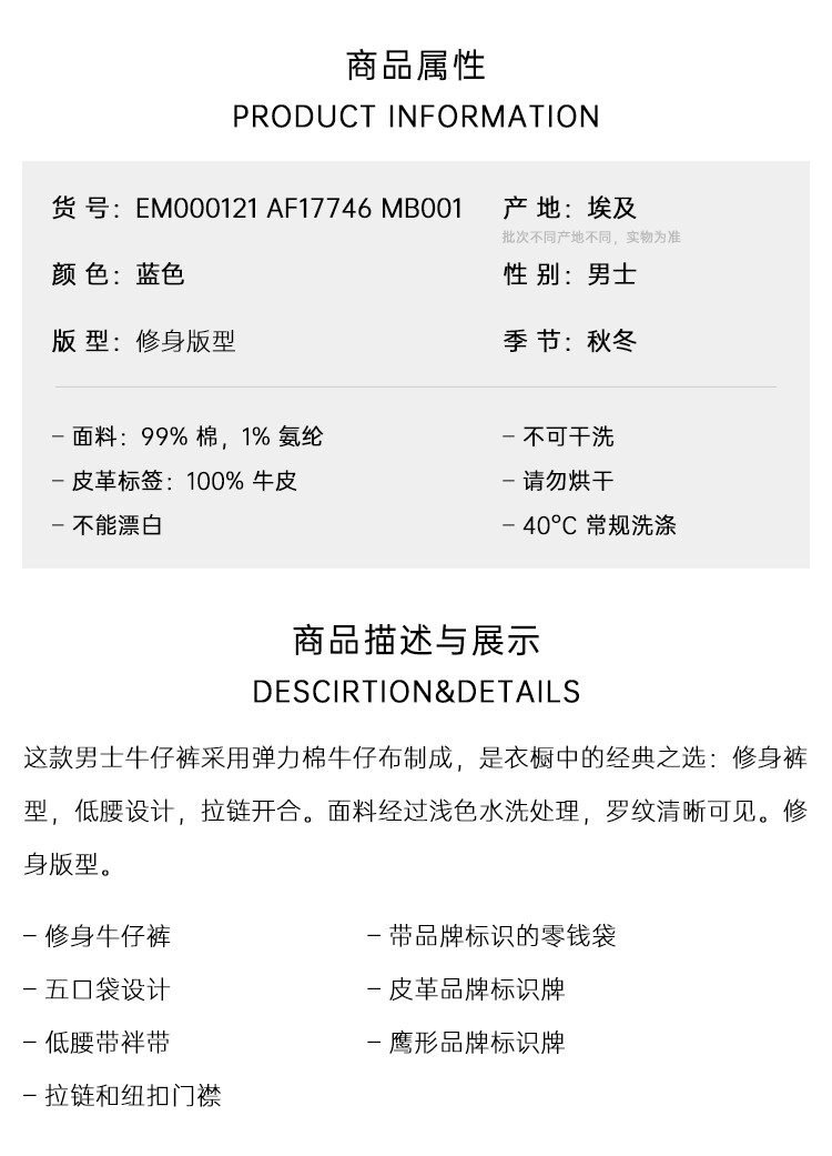 EMPORIO ARMANI 阿玛尼 男士徽标贴片 J06 修身水洗牛仔裤 蓝色 EM000121 AF17746 MB001