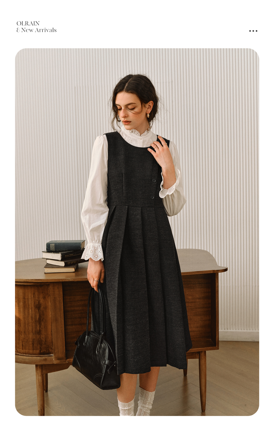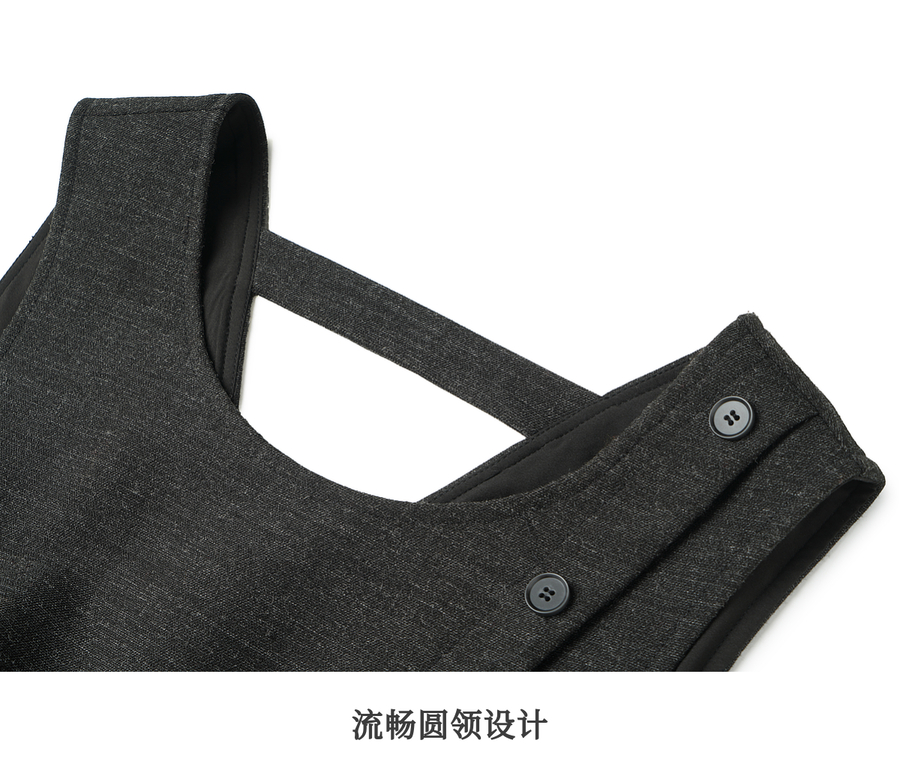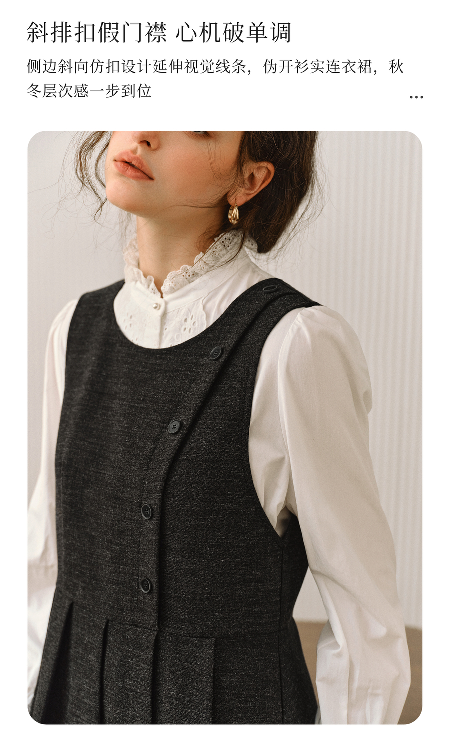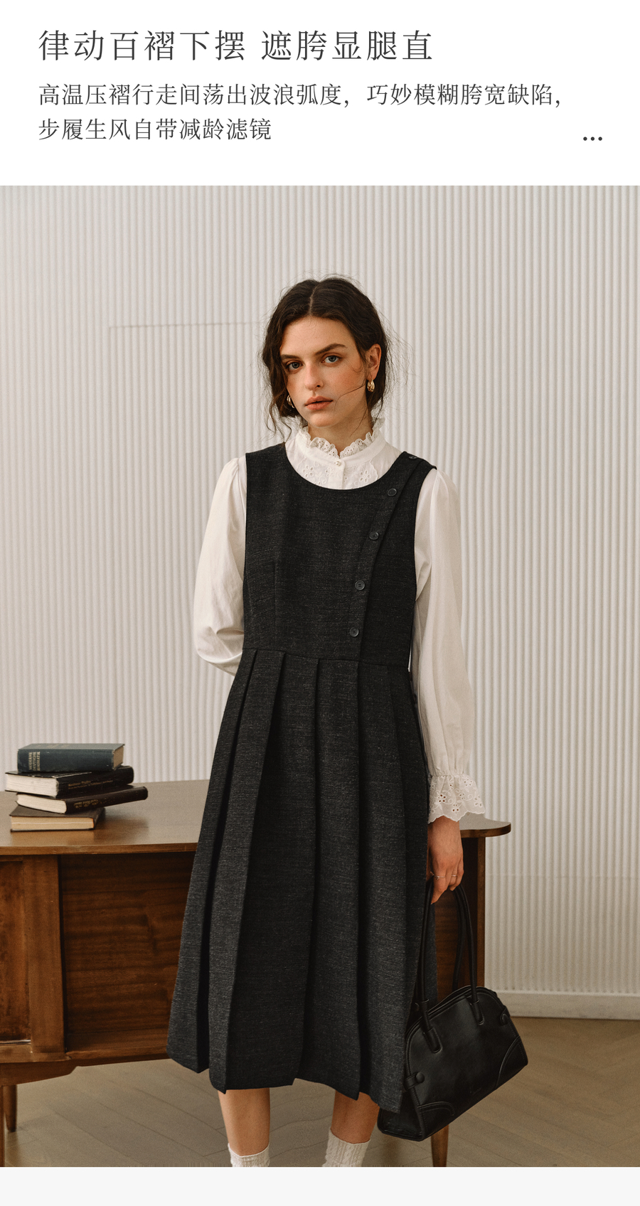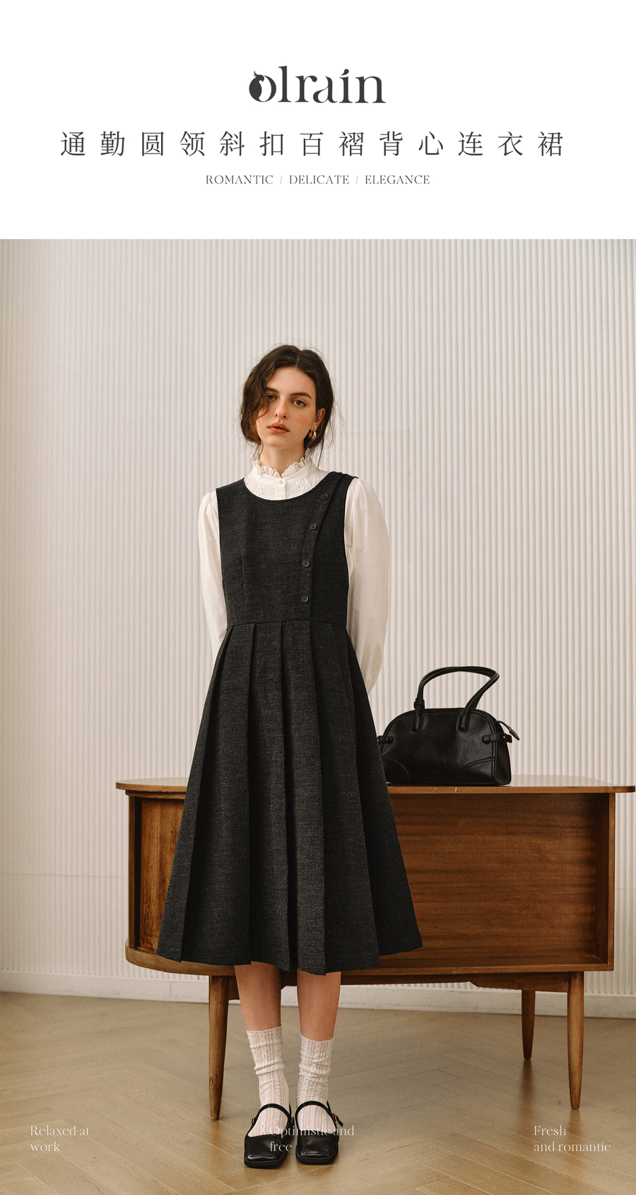 OLrain欧芮儿2025新款女秋季通勤圆领斜扣百褶无袖背心叠穿连衣裙