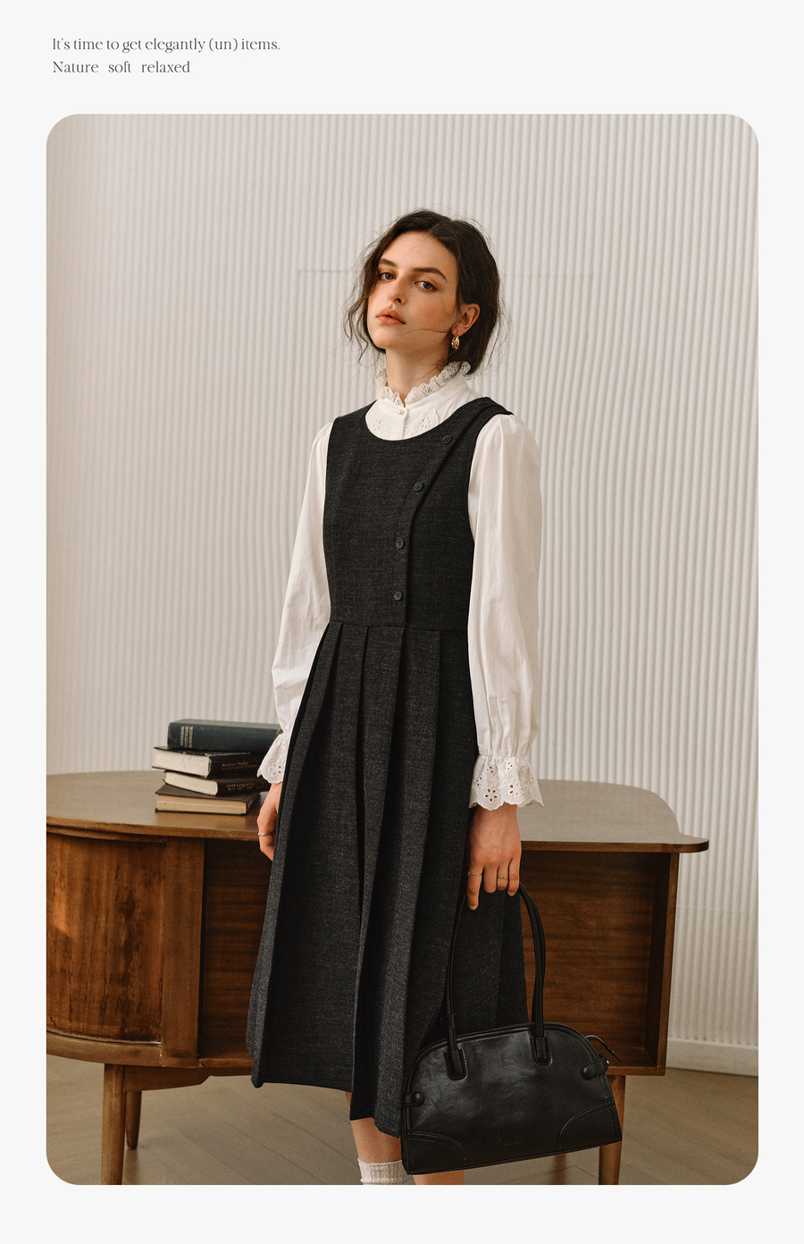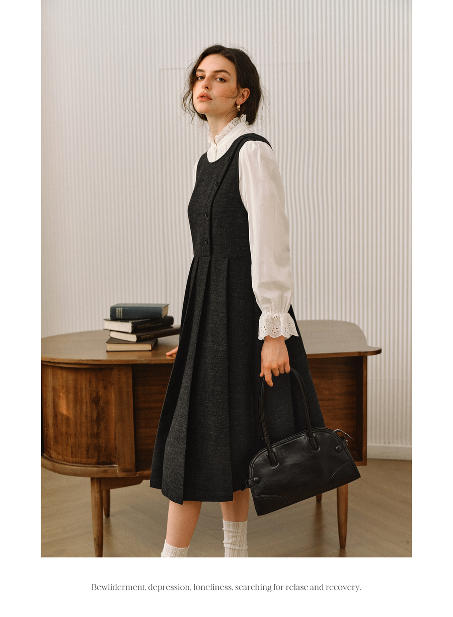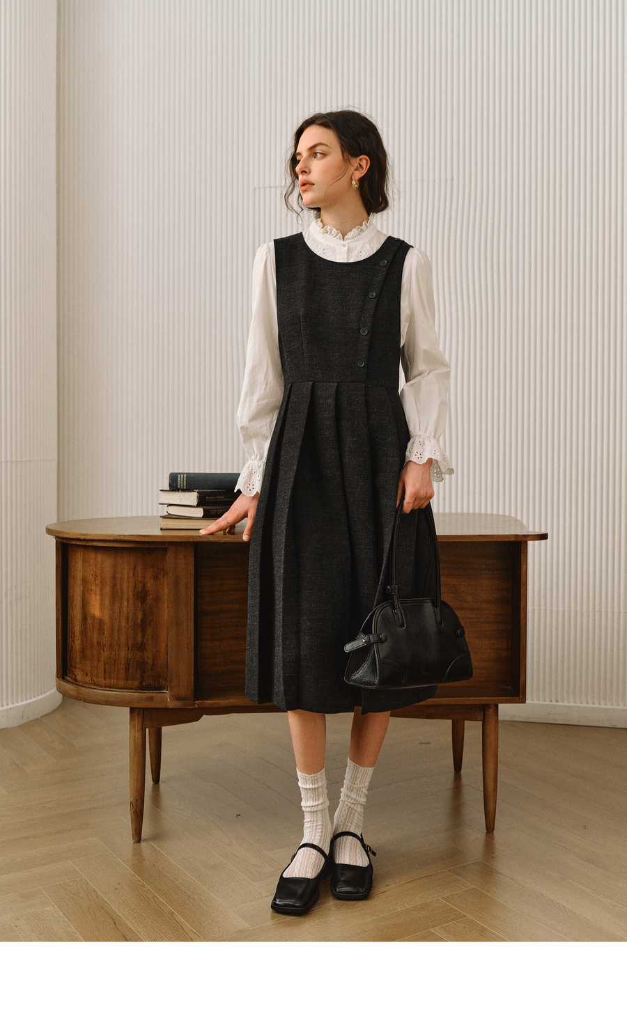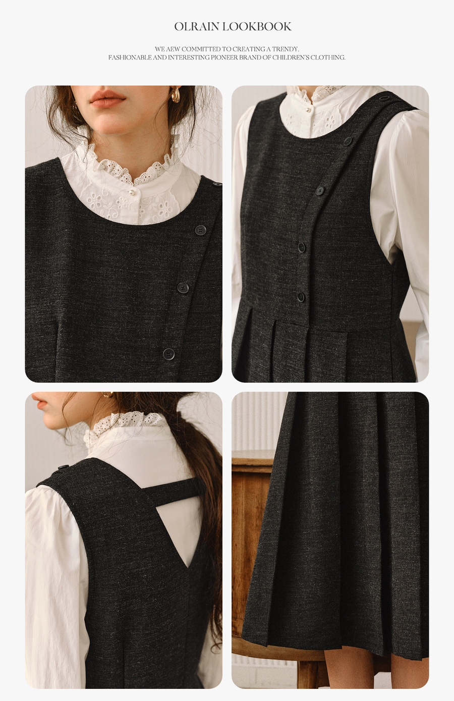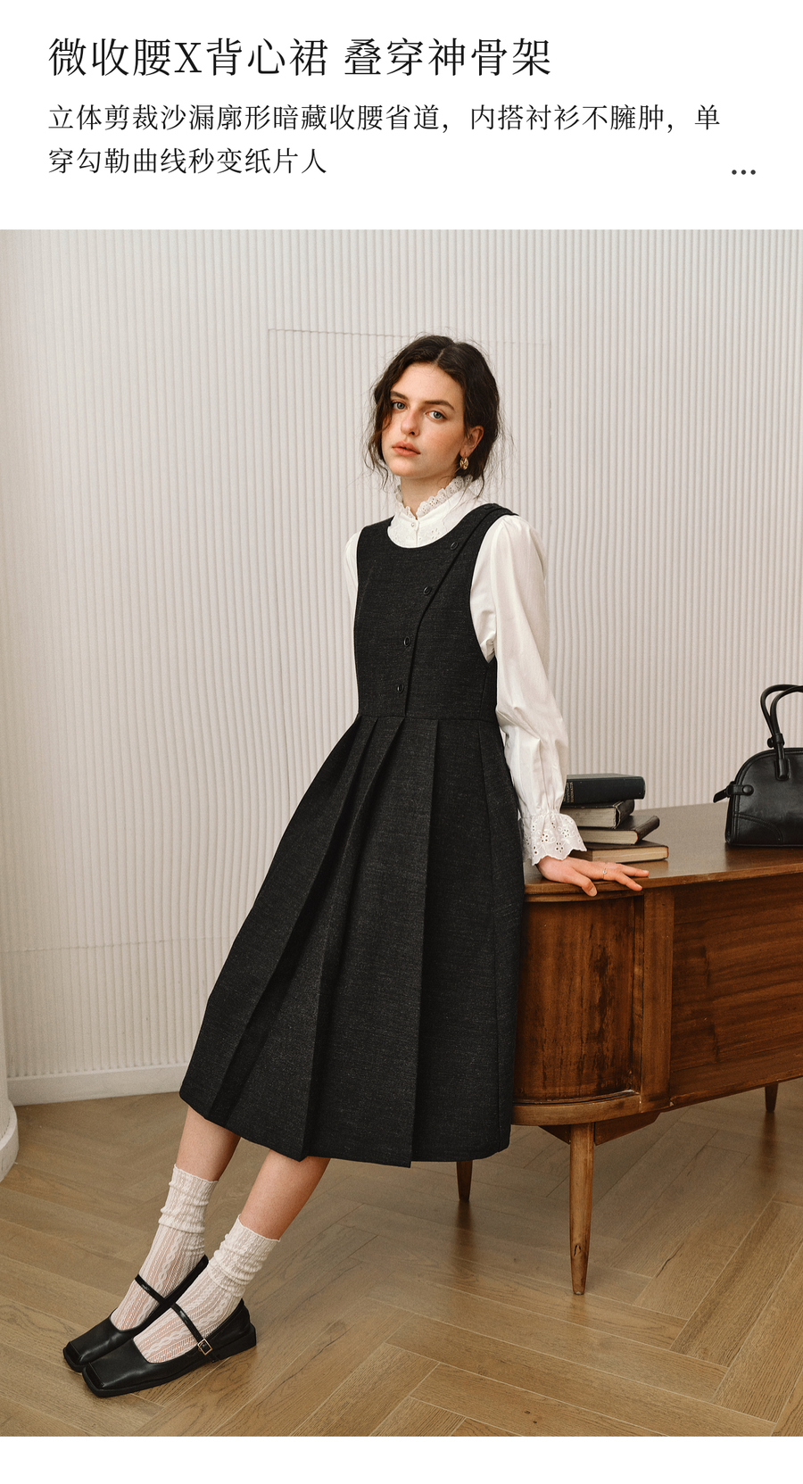 OLrain欧芮儿2025新款女秋季通勤圆领斜扣百褶无袖背心叠穿连衣裙