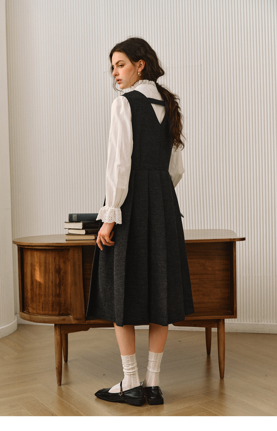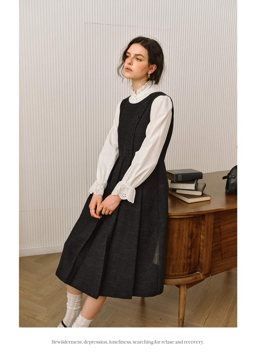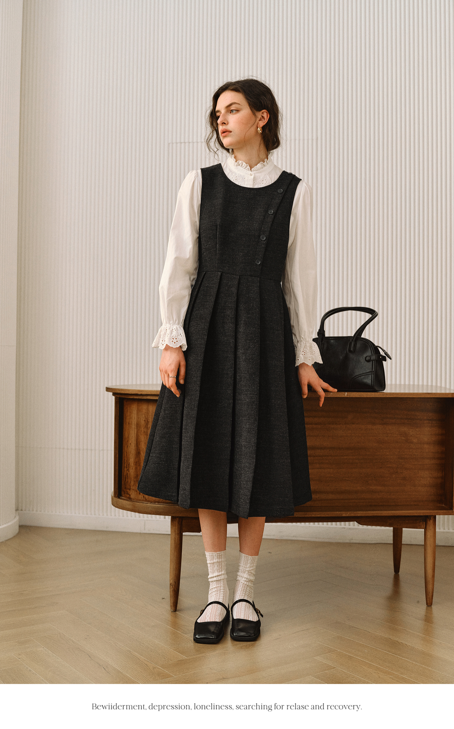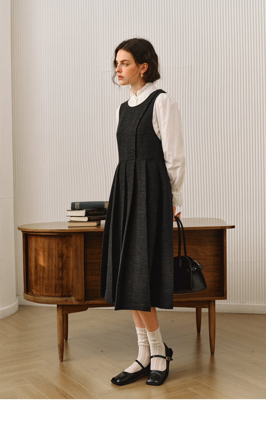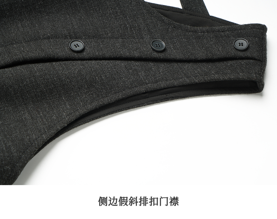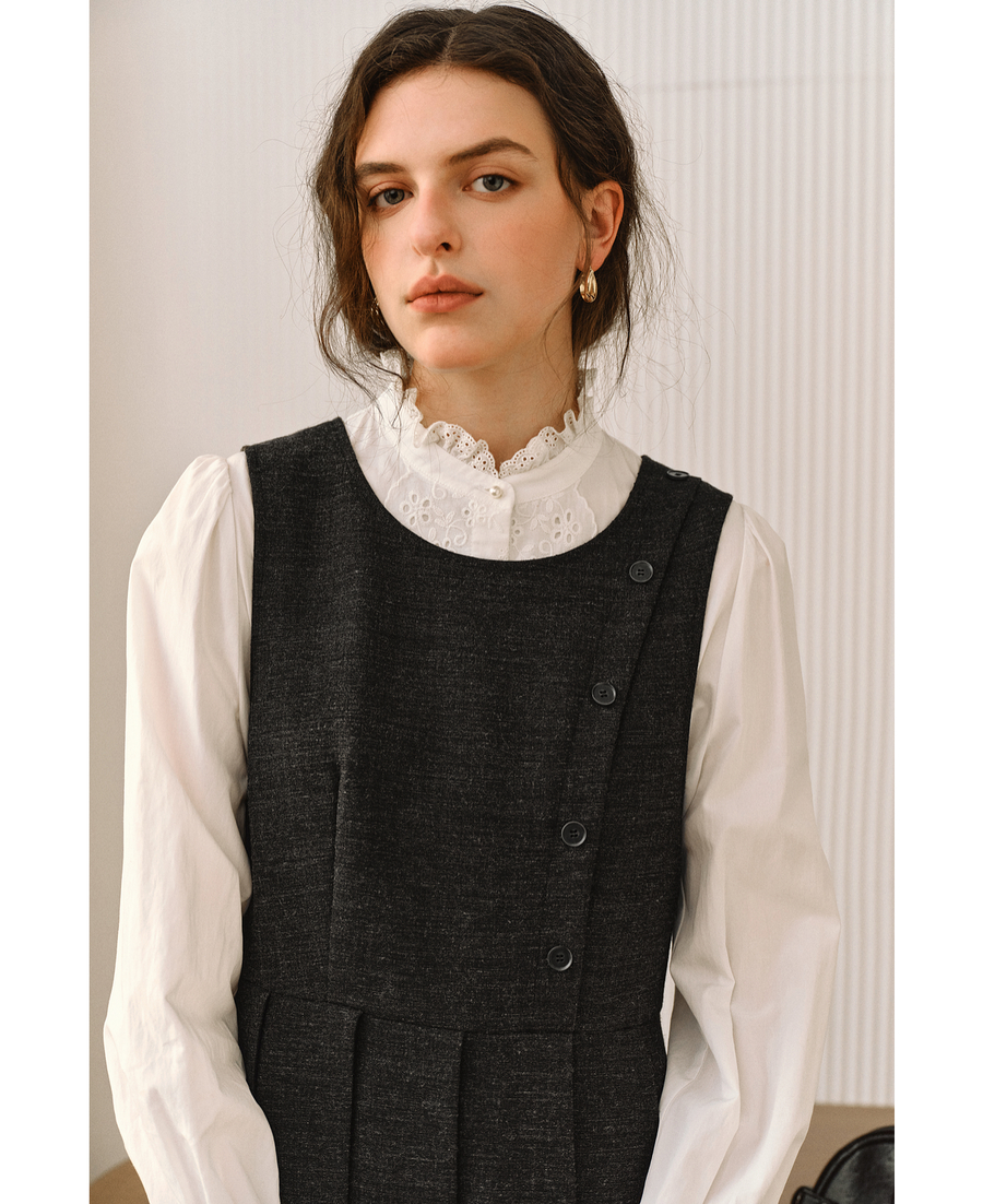 OLrain欧芮儿2025新款女秋季通勤圆领斜扣百褶无袖背心叠穿连衣裙