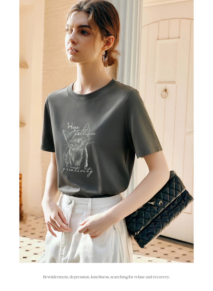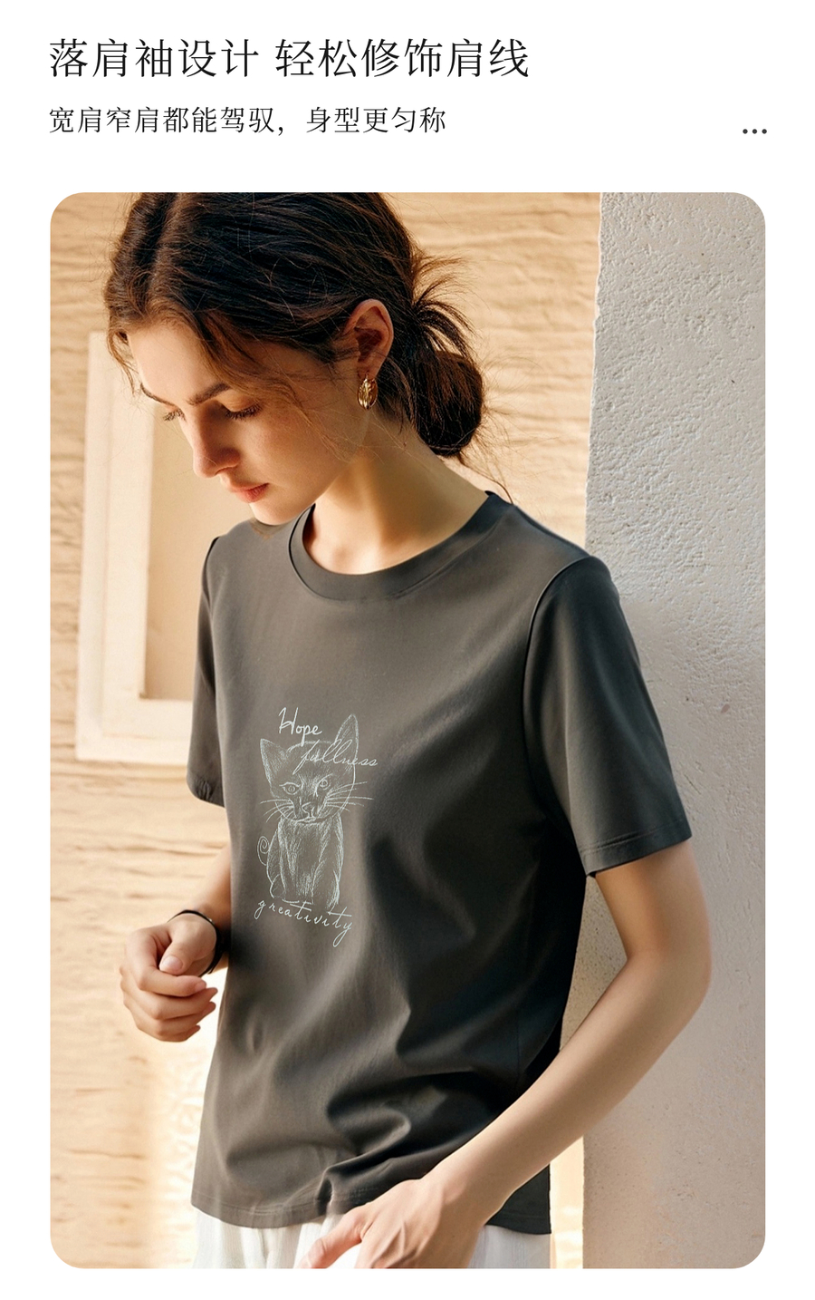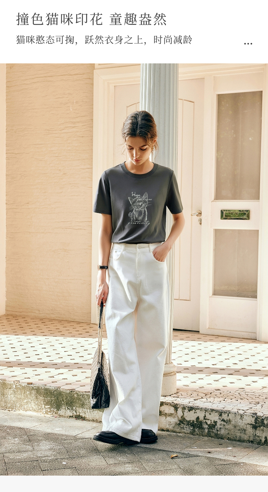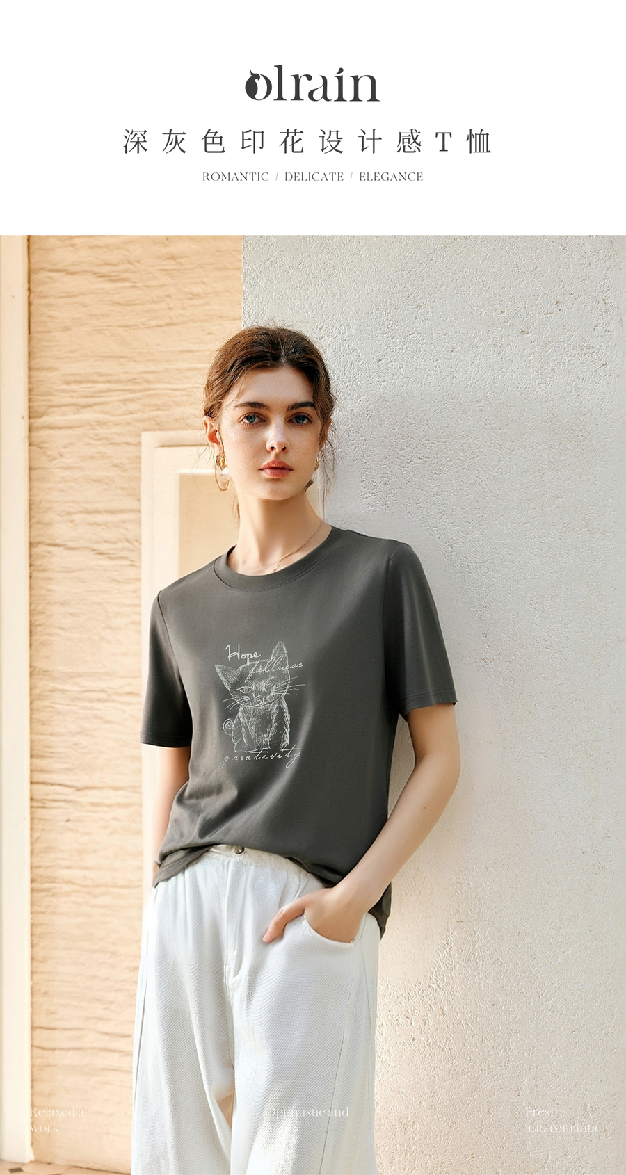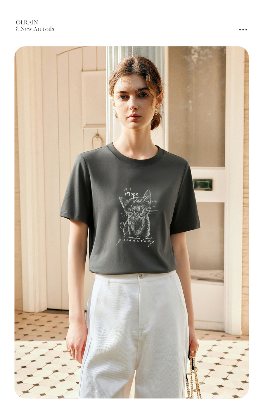 欧芮儿2025夏季新款小猫印花设计感短袖正肩T恤宽松圆领上衣女