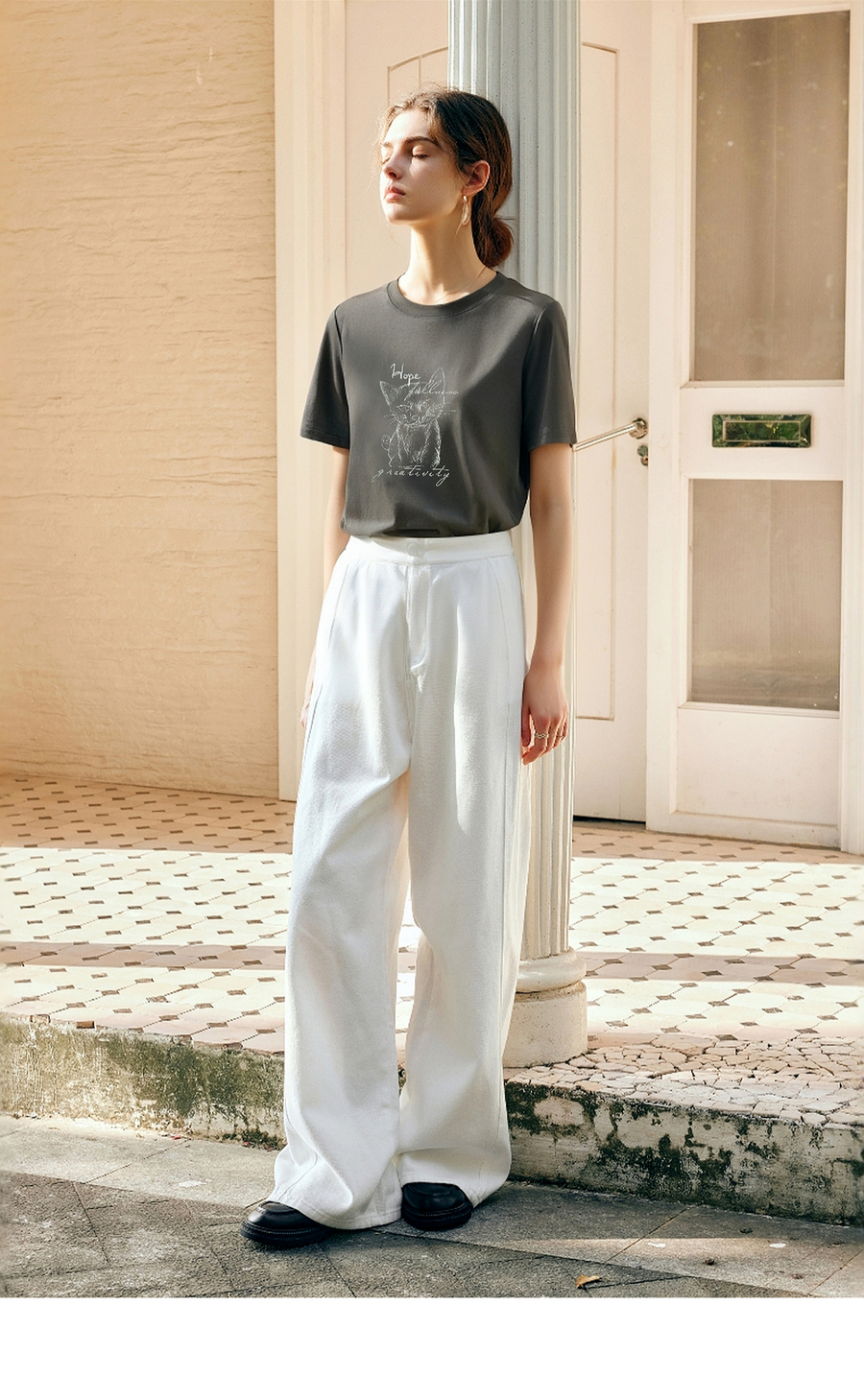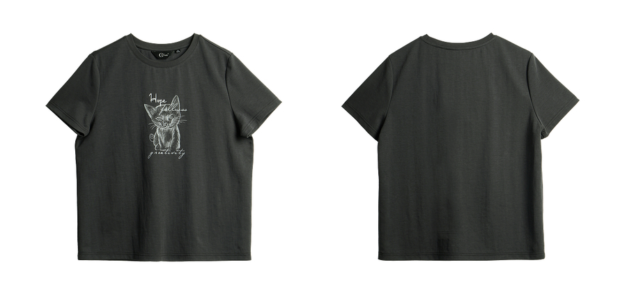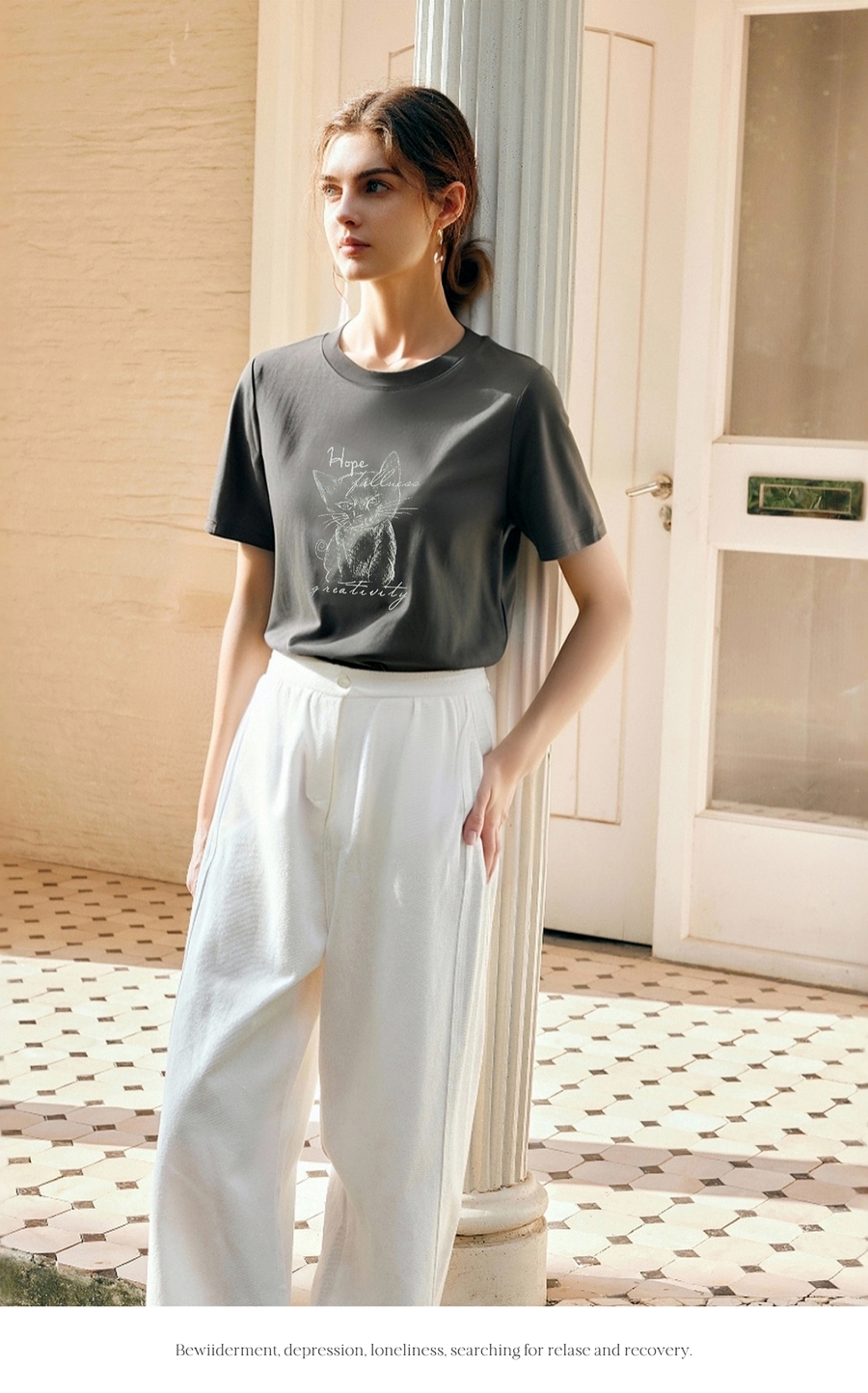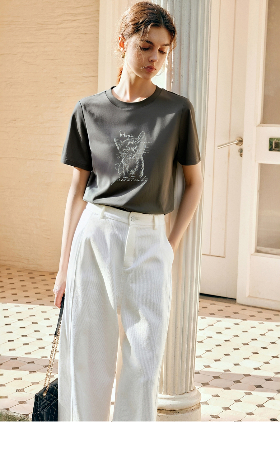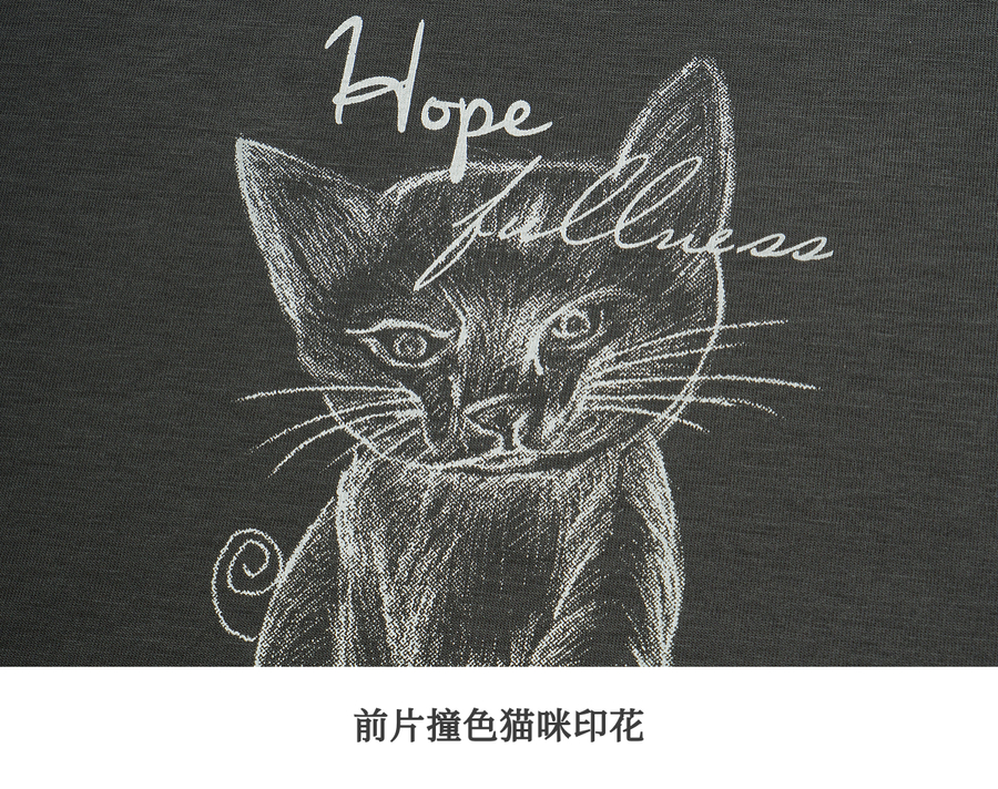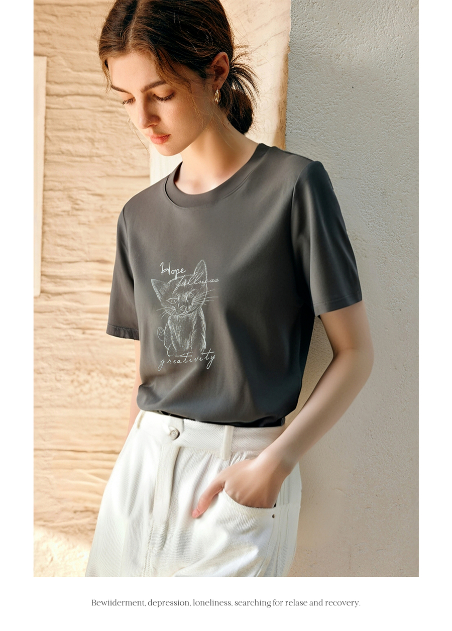 欧芮儿2025夏季新款小猫印花设计感短袖正肩T恤宽松圆领上衣女