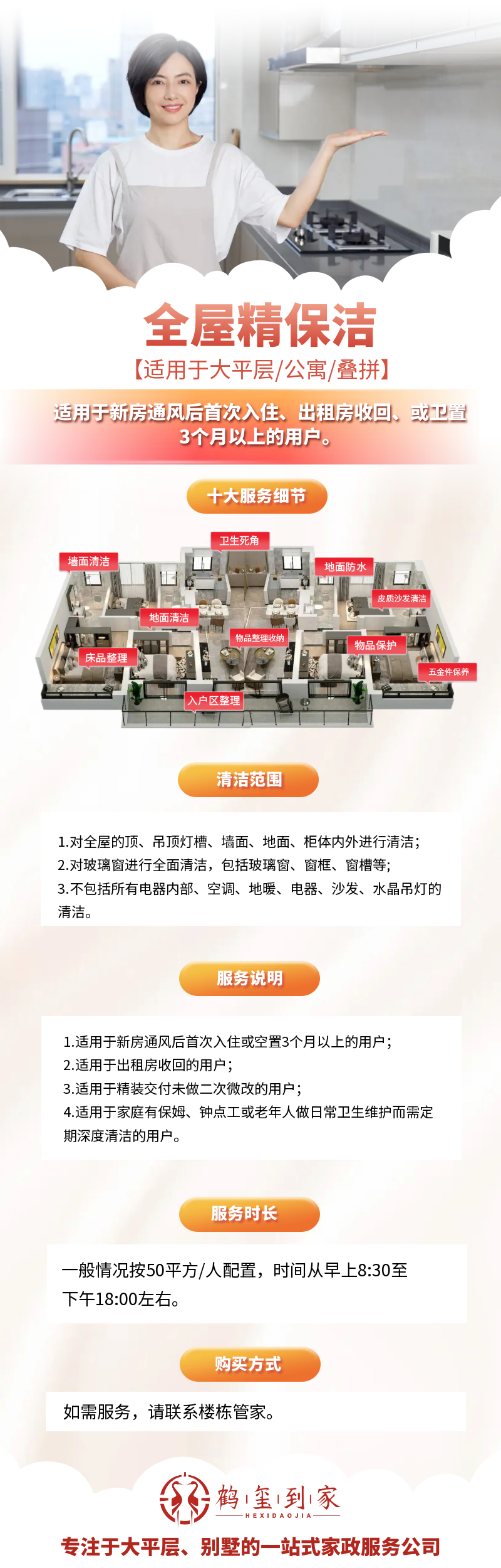 4、适用于新房装修通风后首次入住前的客户;也适用于有住家保姆,每季度或半年一次深度清洁的用户。