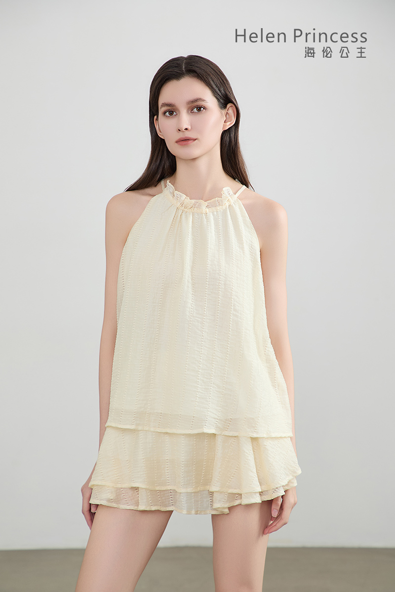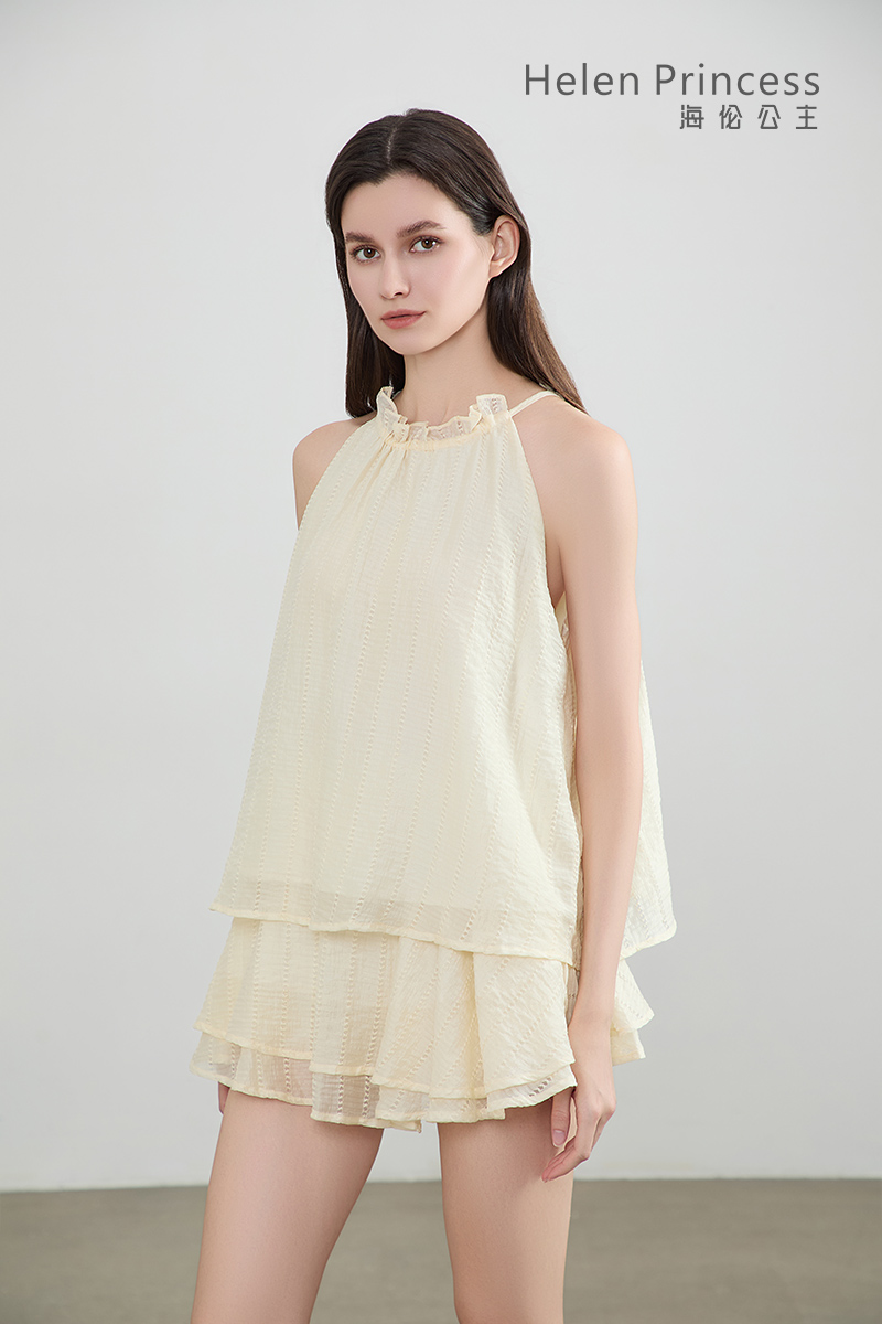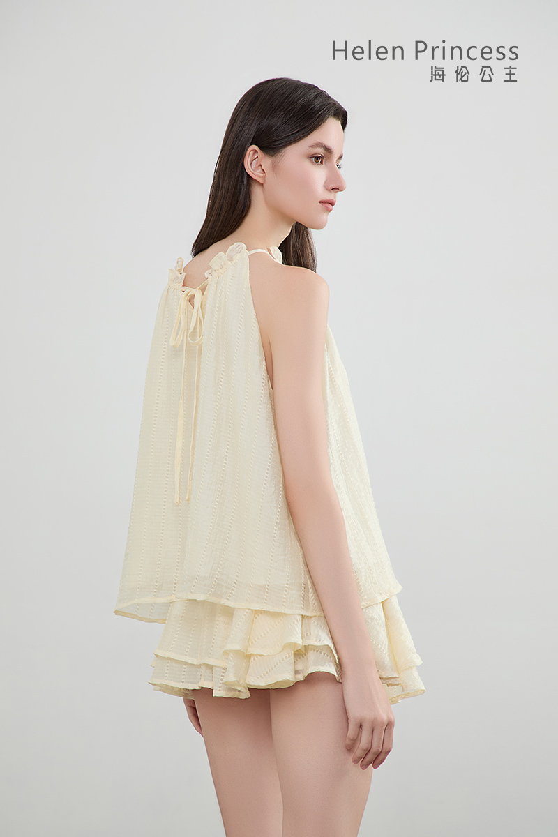 挂脖小圆领的露肩上衣,简约又不失设计感,衣摆和裤子部分为多层荷叶花边下摆设计,层次感分明,穿着举手投足间散发优雅气息。(上衣+短裤)