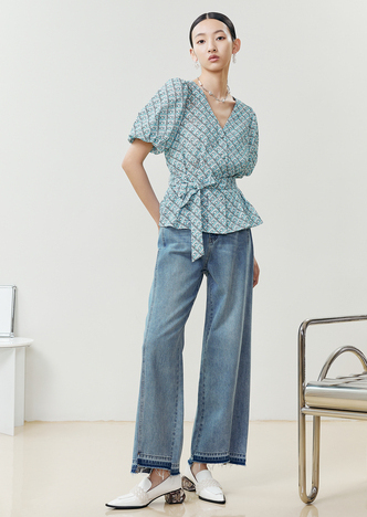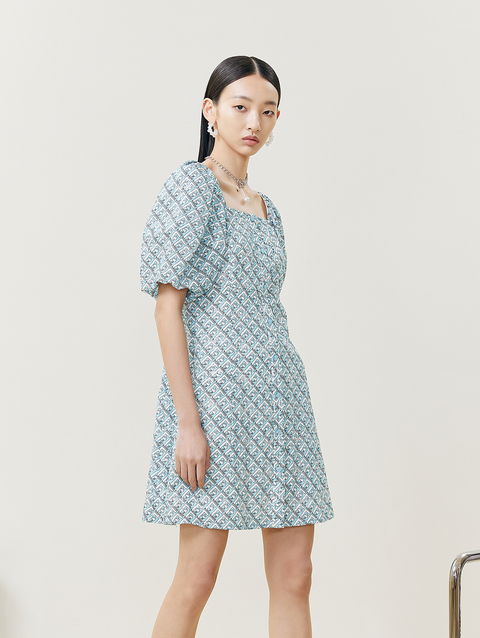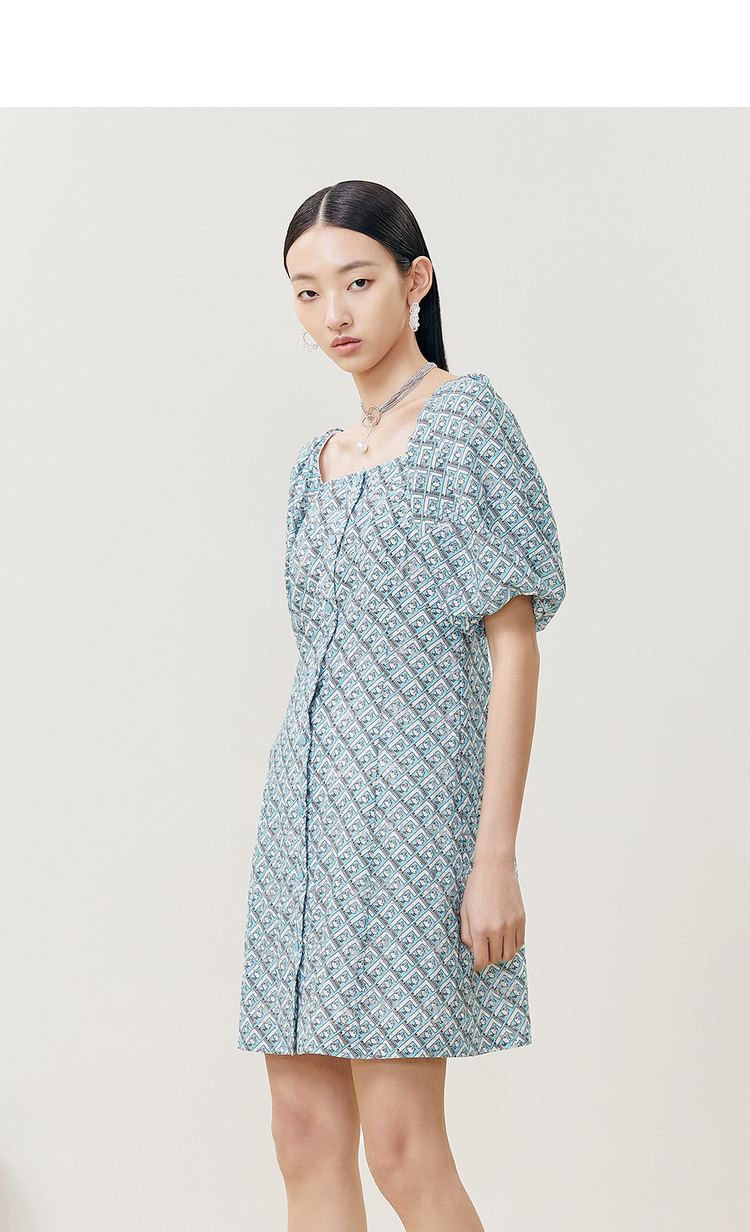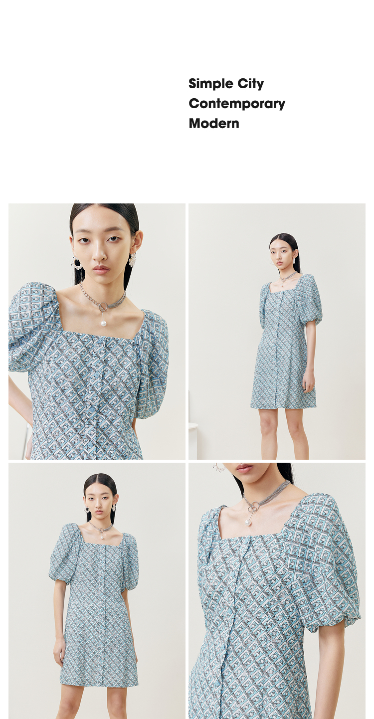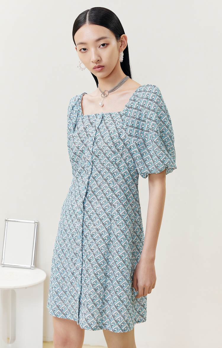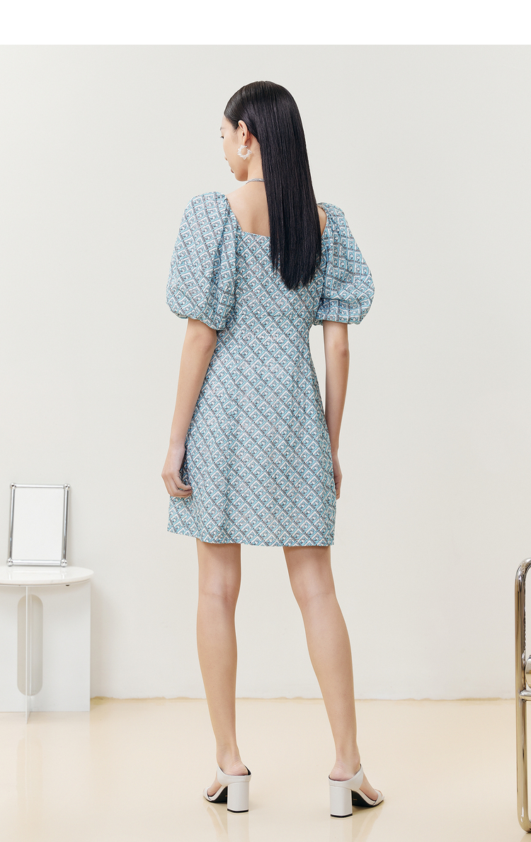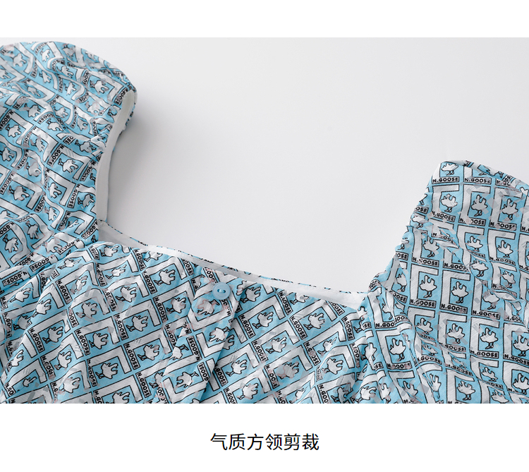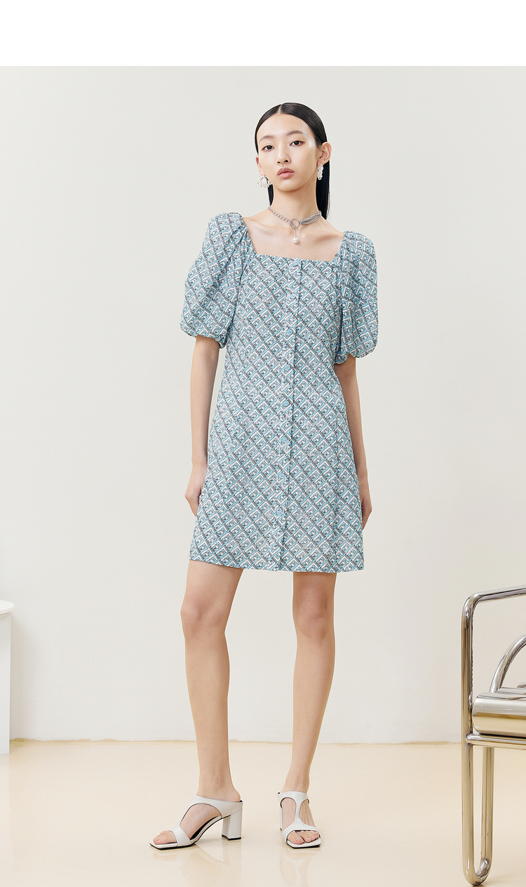 NEELLY纳俪商场同款复古方领满印连衣裙女泡泡袖收腰A字裙中长款N22042Y01050