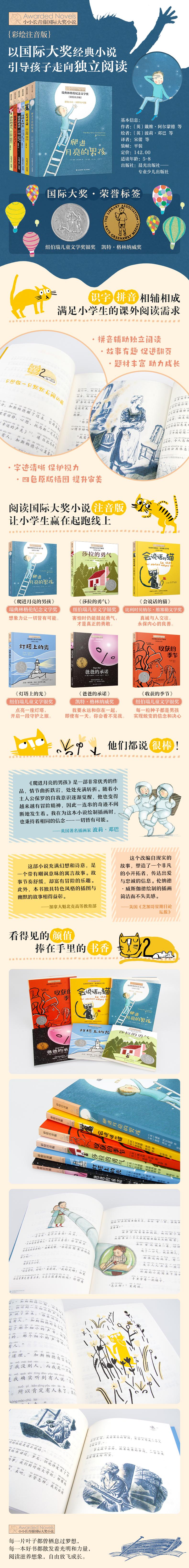 小小长青藤秉承长青藤国际大奖小说书系“把世界放到孩子的书架上”的出版理念,契合语文教育改革,迎合孩子“识字拼音相辅相成”的学习需求,引领5-8岁的孩子走向独立阅读,推开世界文学的大门。 这一书系的作品皆荣获国际大奖,如纽伯瑞儿童文学奖、凯特•格林纳威奖、瑞典林格伦纪念文学奖、比利时贝纳尔•维塞勒文学奖,以经典大奖童书作为孩子的入学礼物。这一书系的选品符合低年级儿童的阅读特点,故事处处充满童趣,情节跌宕起伏,题材丰富多样,在引起读者兴趣的同时,也能赋予孩子成长能量。 这一辑共有六本书。《爬进月亮的男孩》荣获瑞典林格伦纪念文学奖,激励孩子永远不放弃任何一种可能性。《莎拉的勇气》荣获纽伯瑞儿童文学银奖,引导孩子鼓起勇气变得勇敢。《会说话的猫》荣获比利时贝纳尔•维塞勒文学奖,启迪孩子真诚与人交往,保持内心的良善。《灯塔上的光》荣获纽伯瑞儿童文学银奖,让孩子懂得守护与责任的意义。《爸爸的......